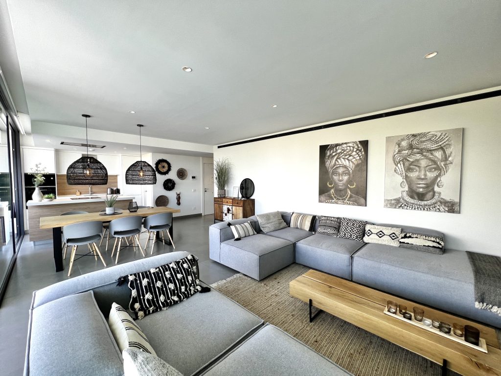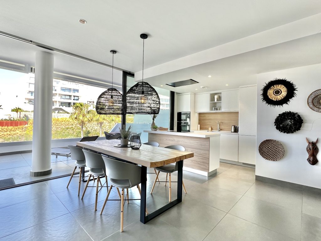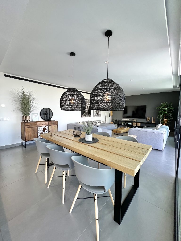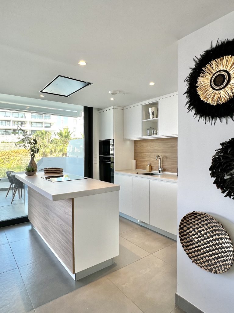 De keuken en salon hebben naadloze toegang tot het enorme terras dat meerdere buitenleefruimtes biedt om te genieten van zonnen, loungen, koken en dineren. Je kunt hier de hele dag genieten van de zon en het ongelooflijke uitzicht op de Middellandse Zee en de omliggende bergen.