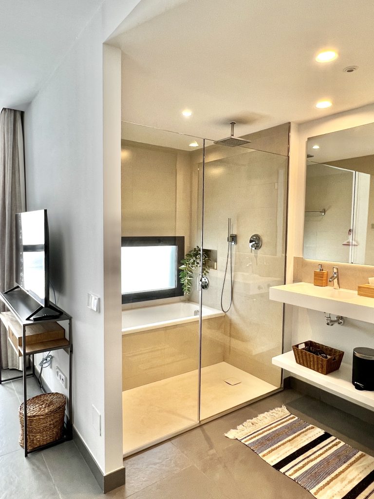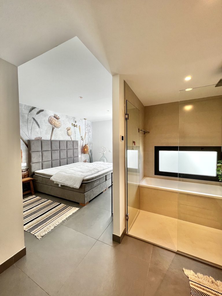 De master en-suite is meer dan ruim en luxueus, met een open badmeubel, een groot bad, een doucheruimte en een apart toilet. Op de hoek ligt een heerlijk privé en exclusief masterterras, perfect om privé te ontspannen.