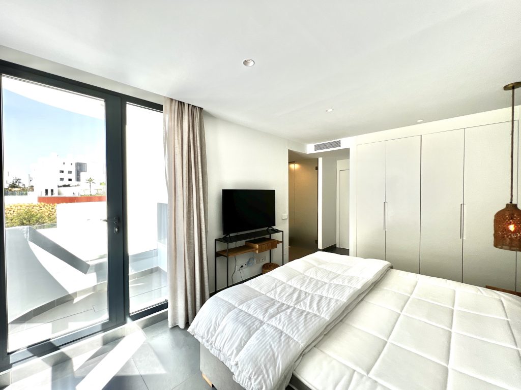 Dit ruime appartement ligt op de eerste verdieping en heeft hoge plafonds, glazen schuifdeuren van vloer tot plafond die de hele zuidmuur van de open salon en keuken beslaan.