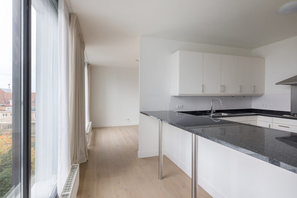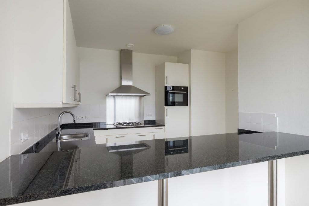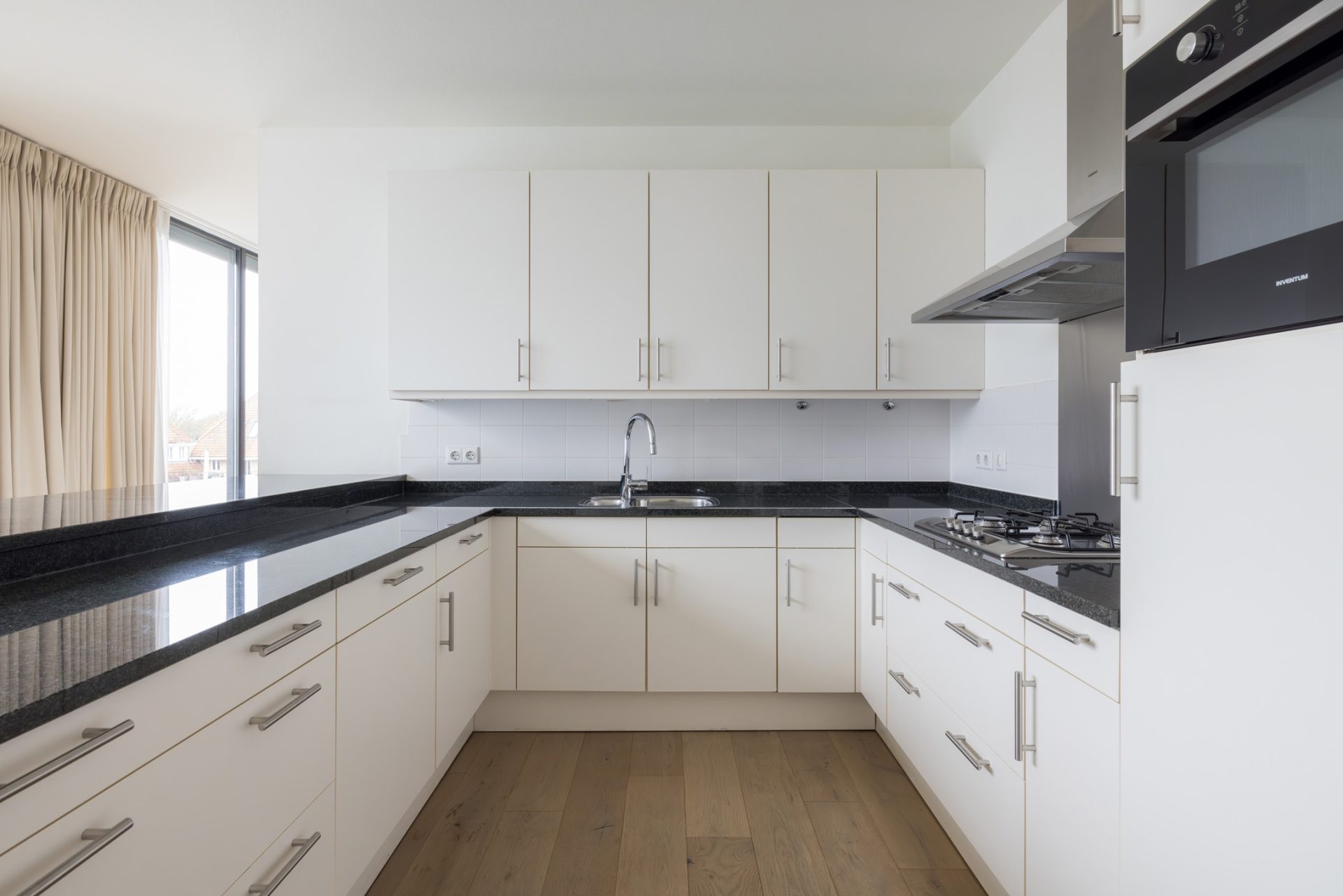 Via het eetgedeelte is de halfopen keuken te bereiken, waar een ruime U-opstelling met een zwart granieten aanrechtblad staat. Alle benodigde apparatuur uit 2016 en 2020 is ingebouwd, dus je kunt direct beginnen met koken. Het blad is verbreed, waardoor het ook als bar gebruikt kan worden. Zet een paar hoge stoelen neer en er kunnen meerdere mensen aanschuiven!