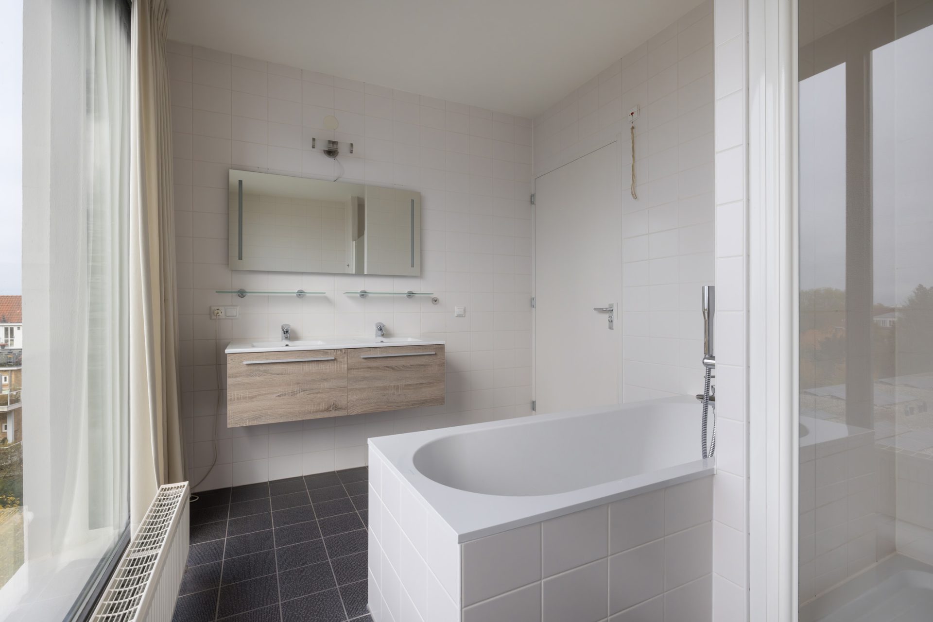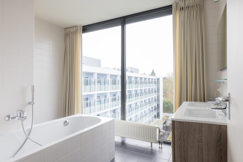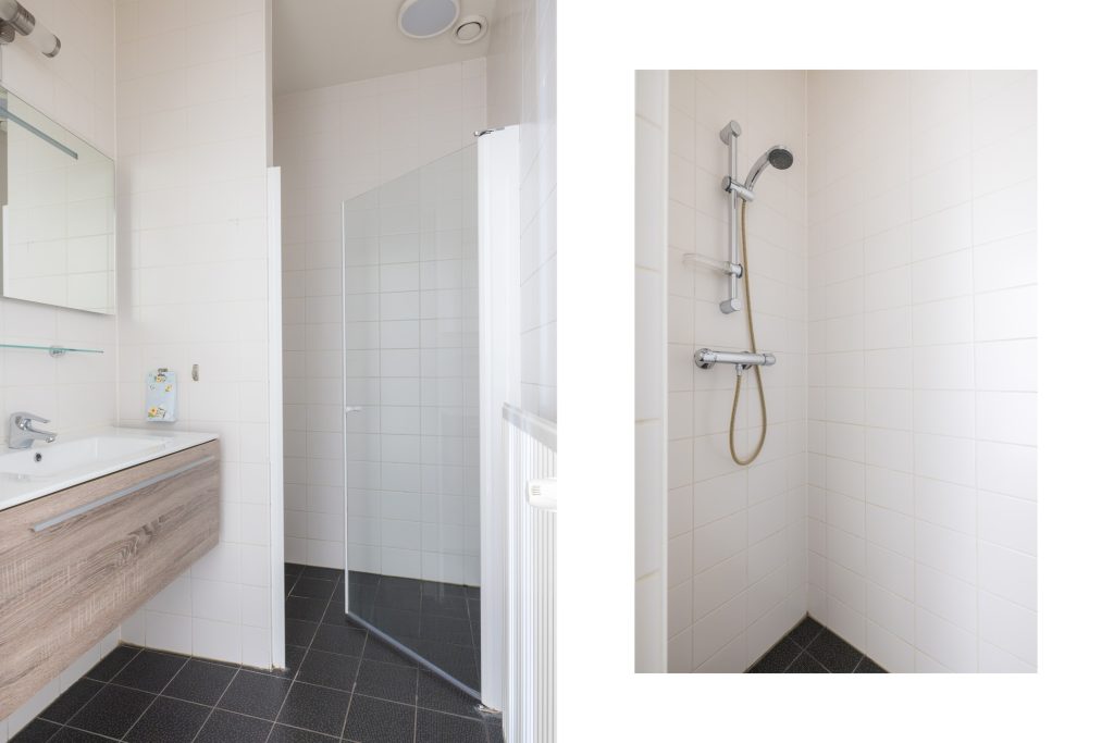Verder vind je in dit deel van het appartement een tweede badkamer met vaste wastafel en inloopdouche.