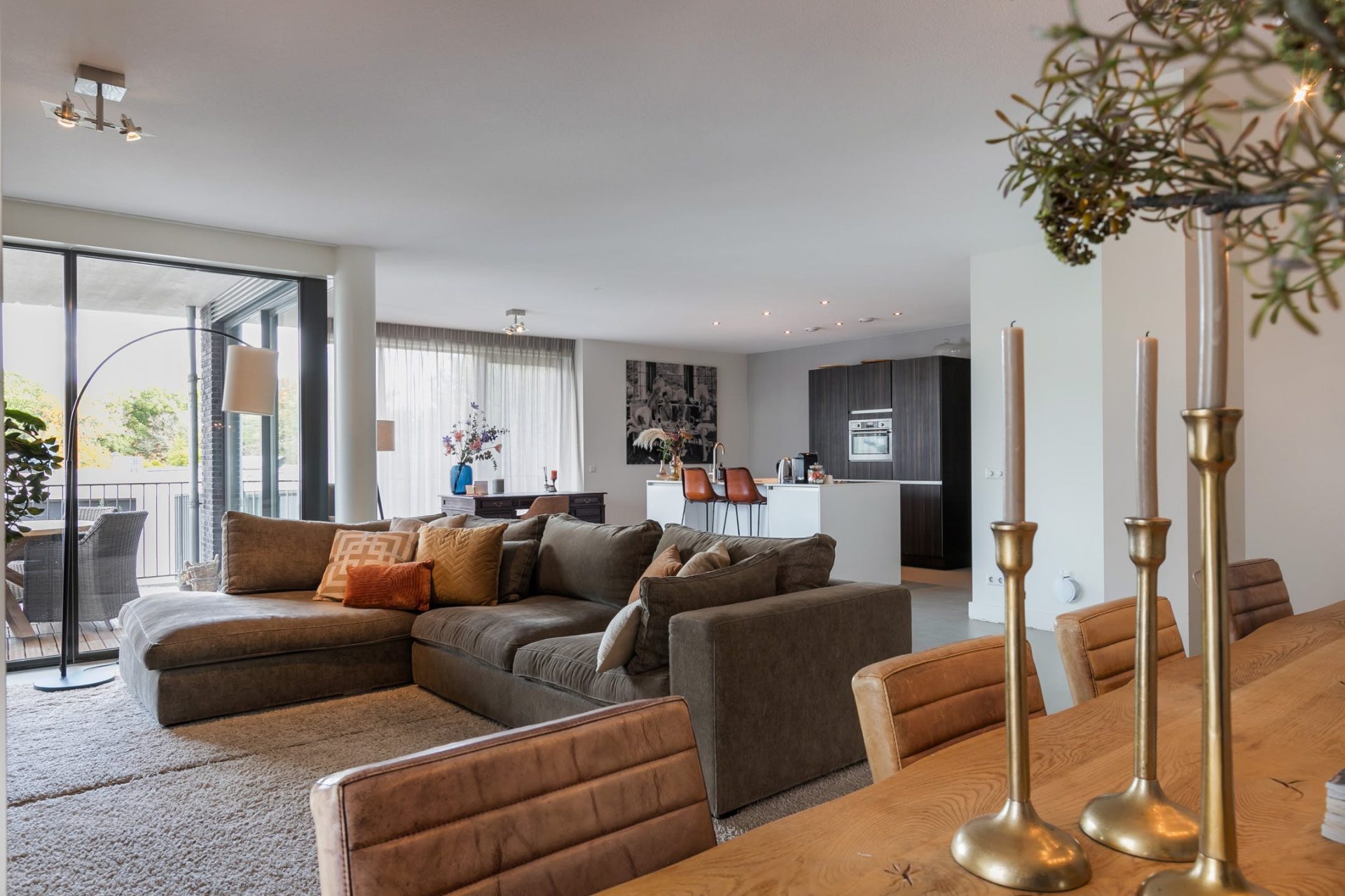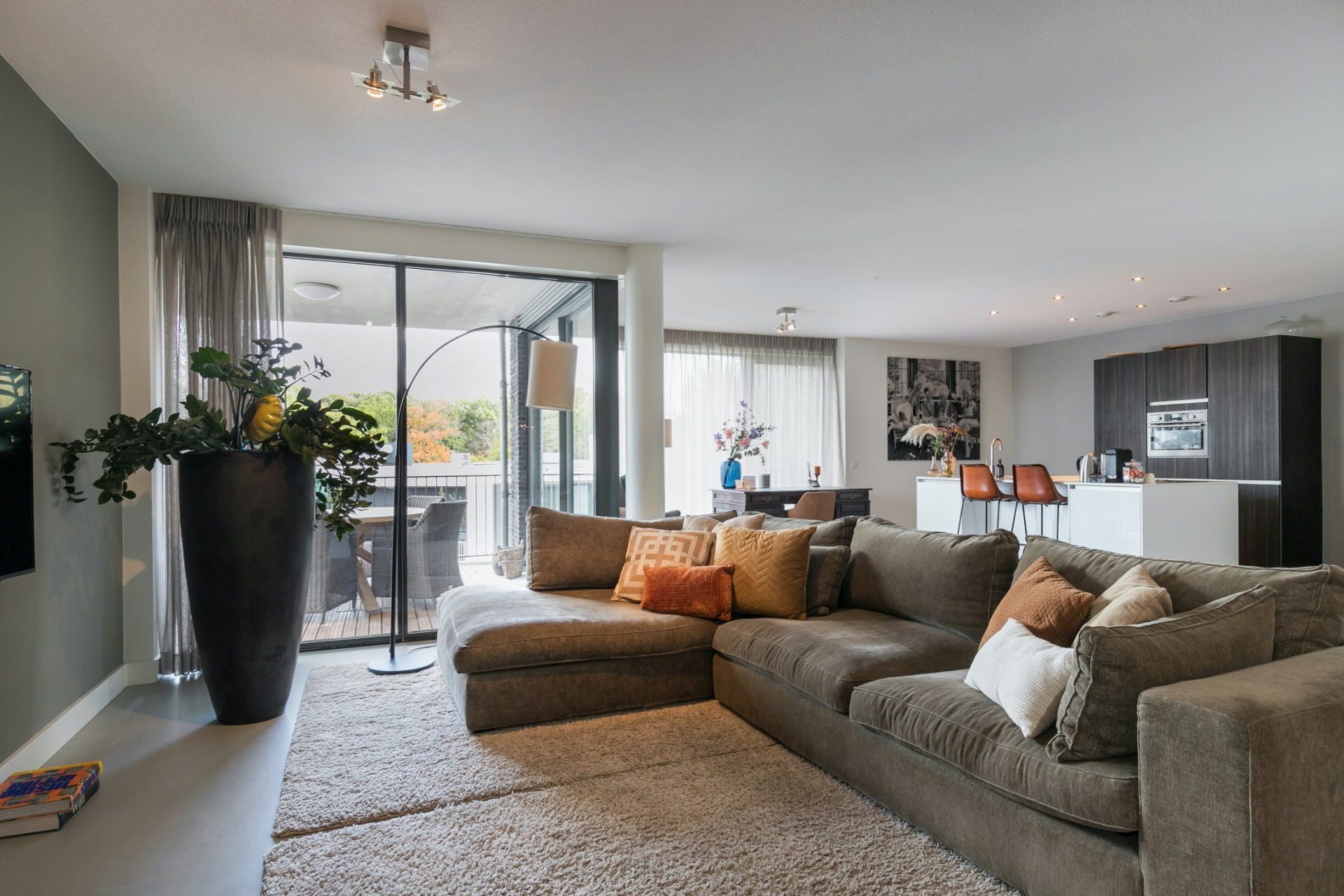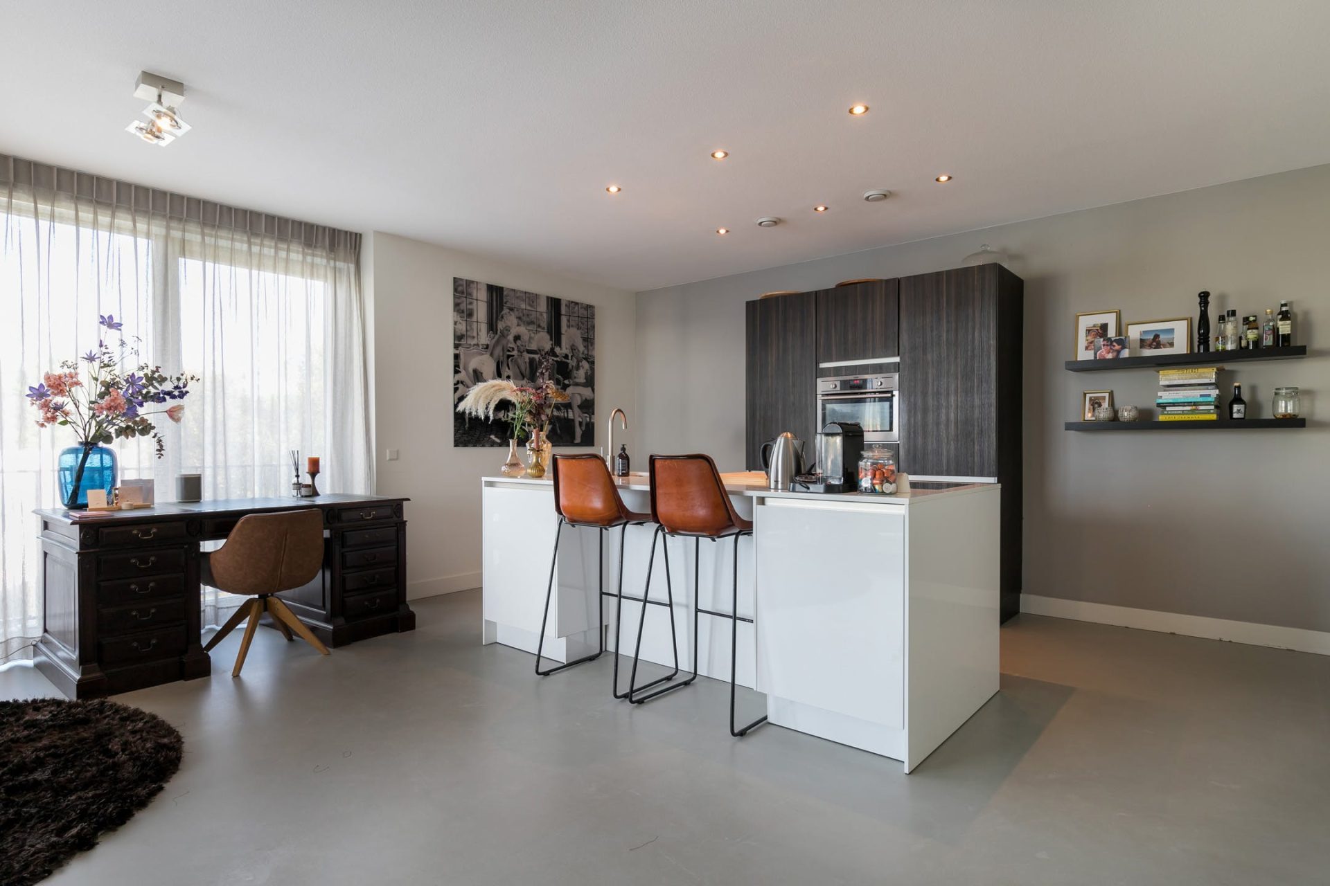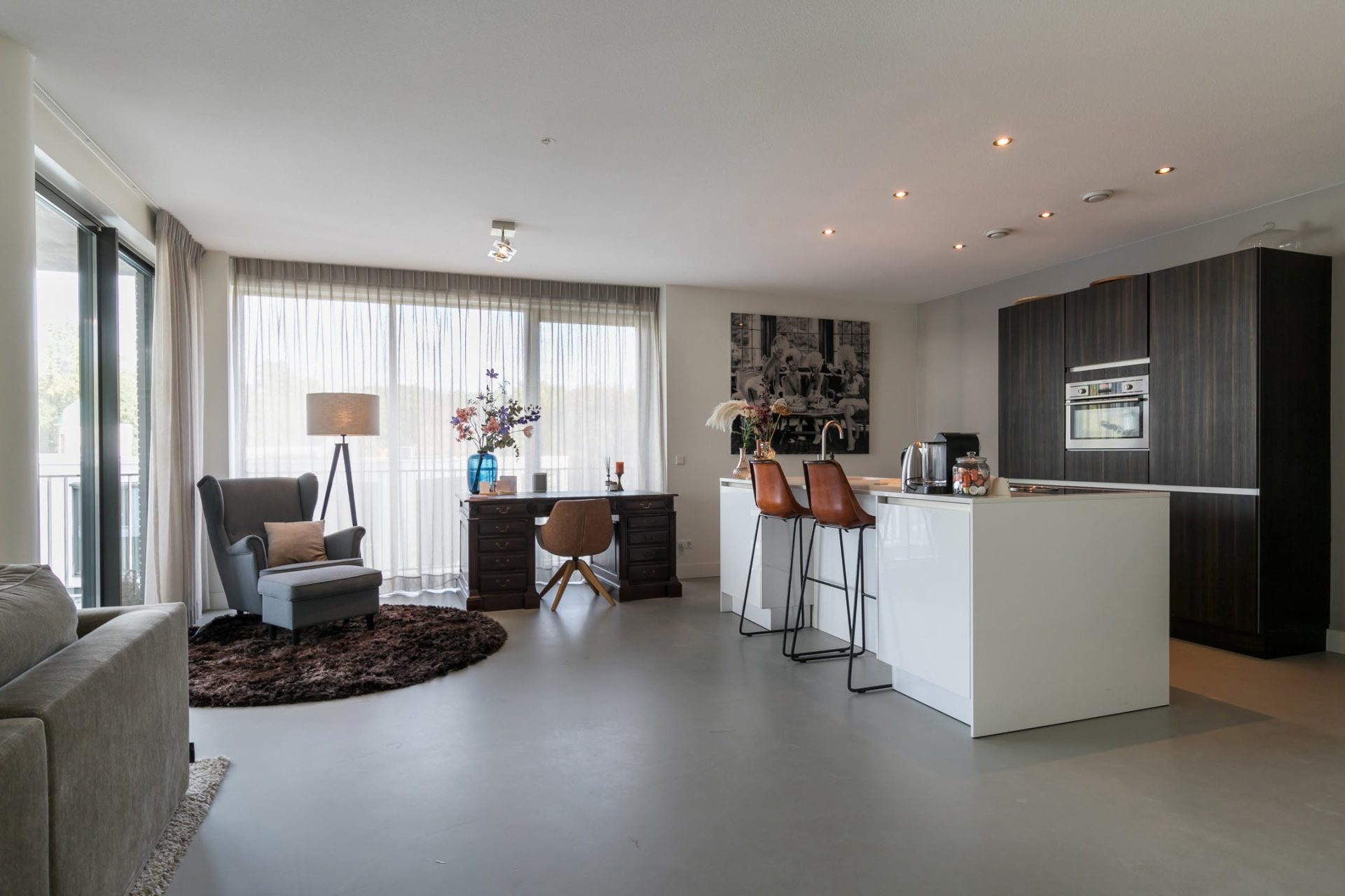 De woonkamer met open keuken heeft grote ramen aan twee zijden, een schuifpui naar het balkon en een fantastische sfeer. Net als in de rest van het appartement ligt er een gietvloer met vloerverwarming, die past bij diverse interieurstijlen. Er is een mooie verdeling tussen het zeer ruime zitgedeelte, de halfopen eetkamer en het werkgedeelte bij de keuken.