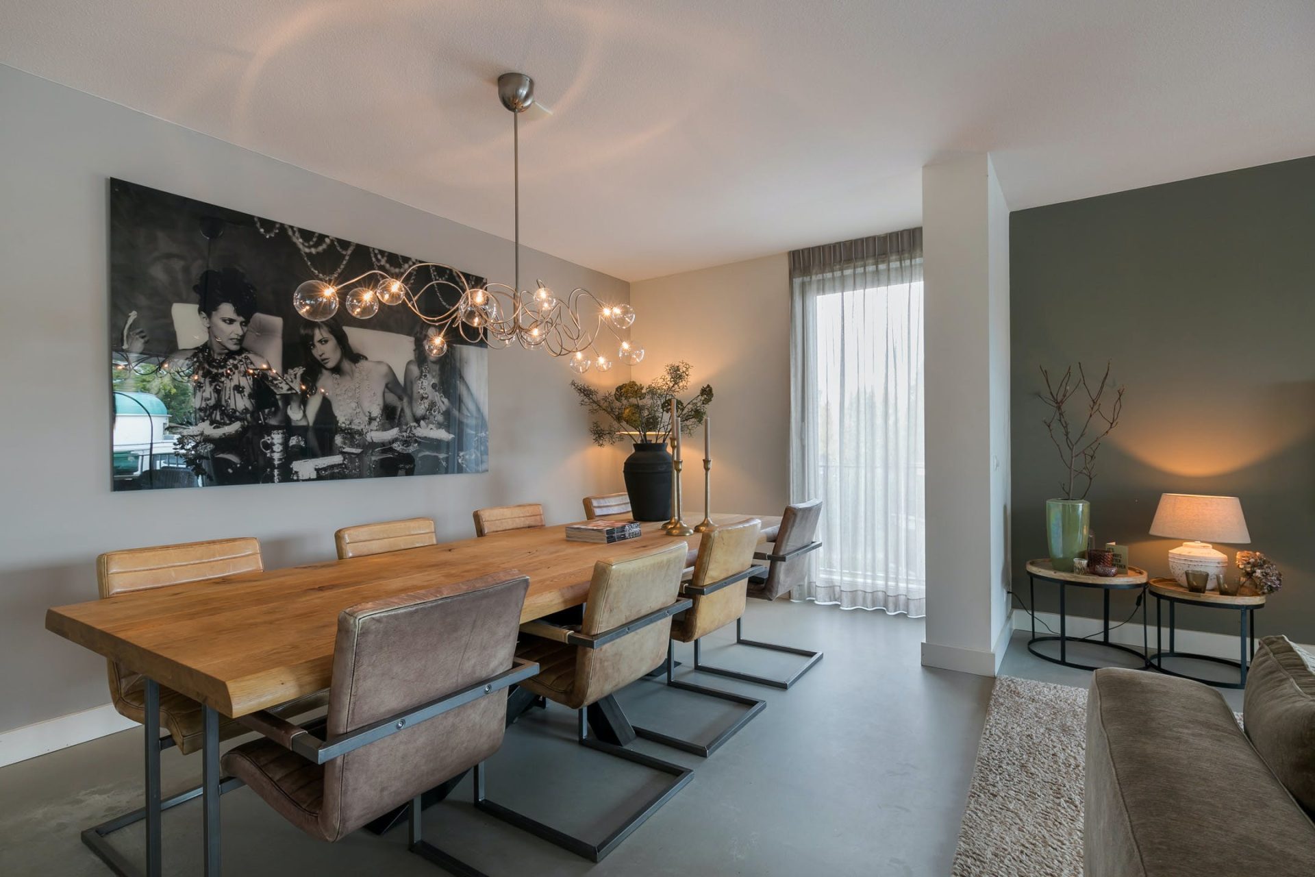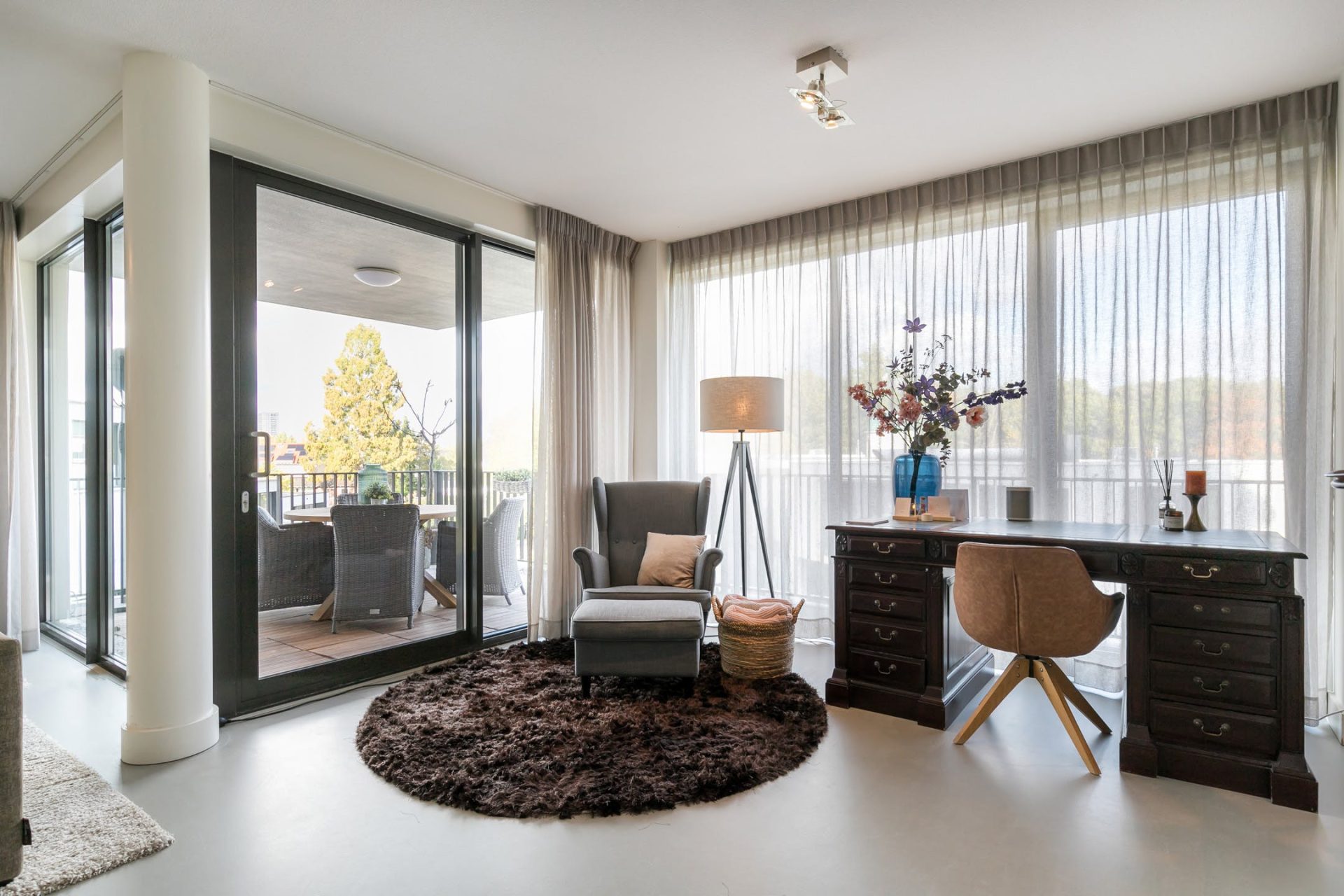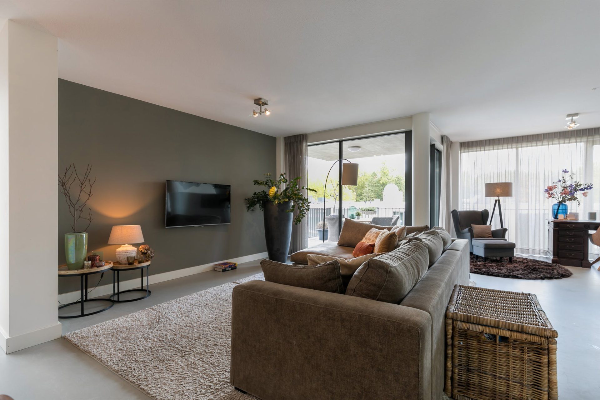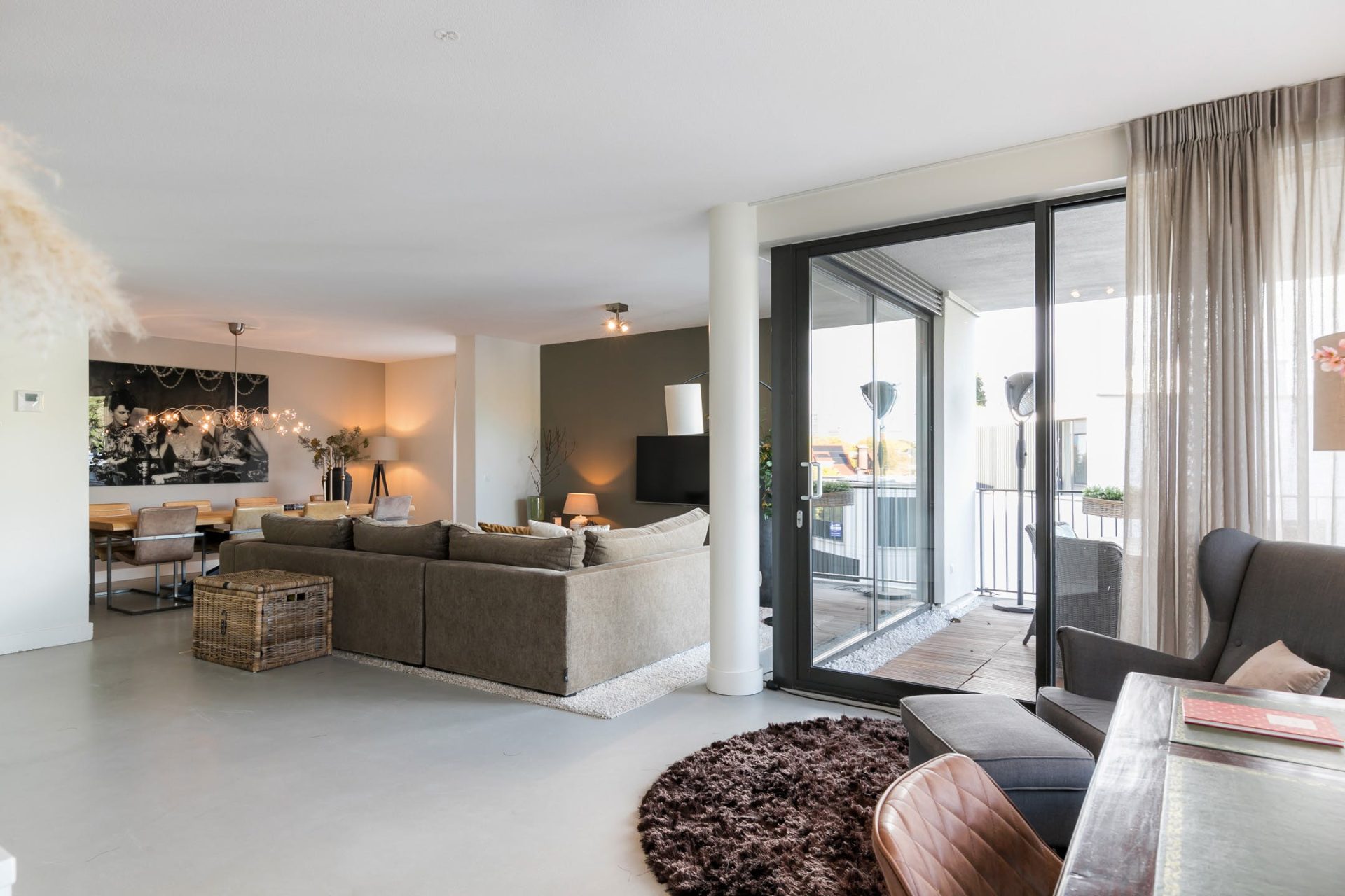 De woonkamer met open keuken heeft grote ramen aan twee zijden, een schuifpui naar het balkon en een fantastische sfeer. Net als in de rest van het appartement ligt er een gietvloer met vloerverwarming, die past bij diverse interieurstijlen. Er is een mooie verdeling tussen het zeer ruime zitgedeelte, de halfopen eetkamer en het werkgedeelte bij de keuken.