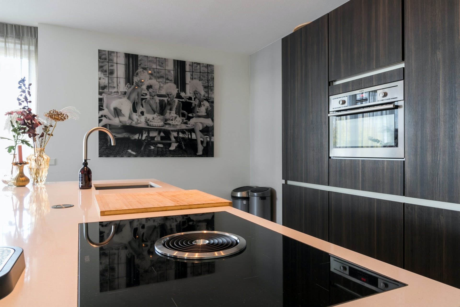 Voor kookliefhebbers is dit een keuken met alle benodigde luxe, die goed past in de sfeer die dit appartement met zich meedraagt. Het grote kook-/spoeleiland biedt ruimte aan twee hoge stoelen en de donkere kastenwand is voorzien van diverse inbouwapparatuur. Blikvanger is de brede inductie kookplaat met ingebouwde afzuiging. De naastgelegen bijkeuken biedt onder andere ruimte aan de wasapparatuur.