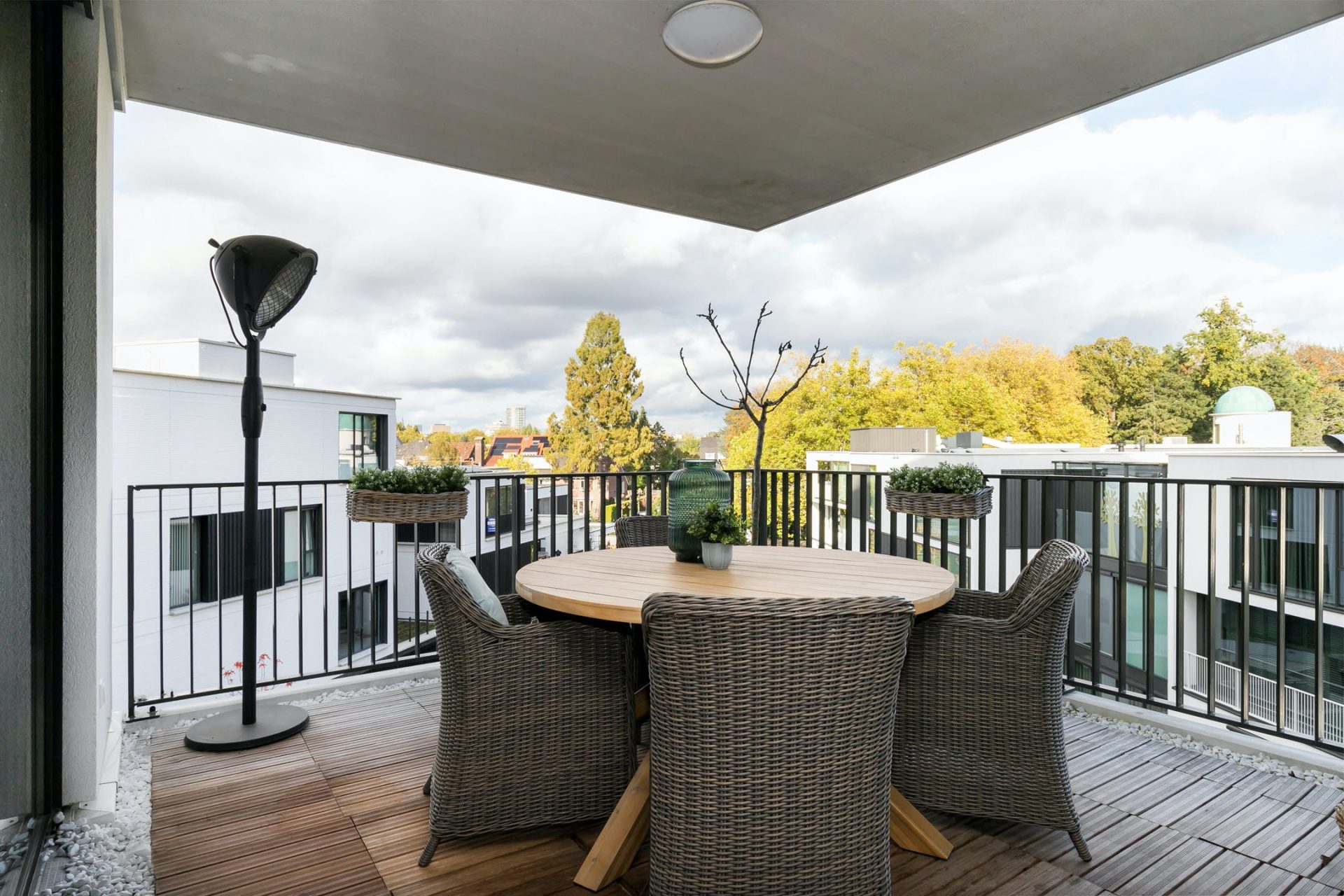 Het appartement heeft twee balkons, waarbij het balkon bij de woonkamer ruim genoeg is om met meerdere mensen te zitten. Houten terrastegels geven het balkon veel sfeer en het uitzicht naar de boomtoppen, over het dak van het andere appartementengebouw, is fraai.