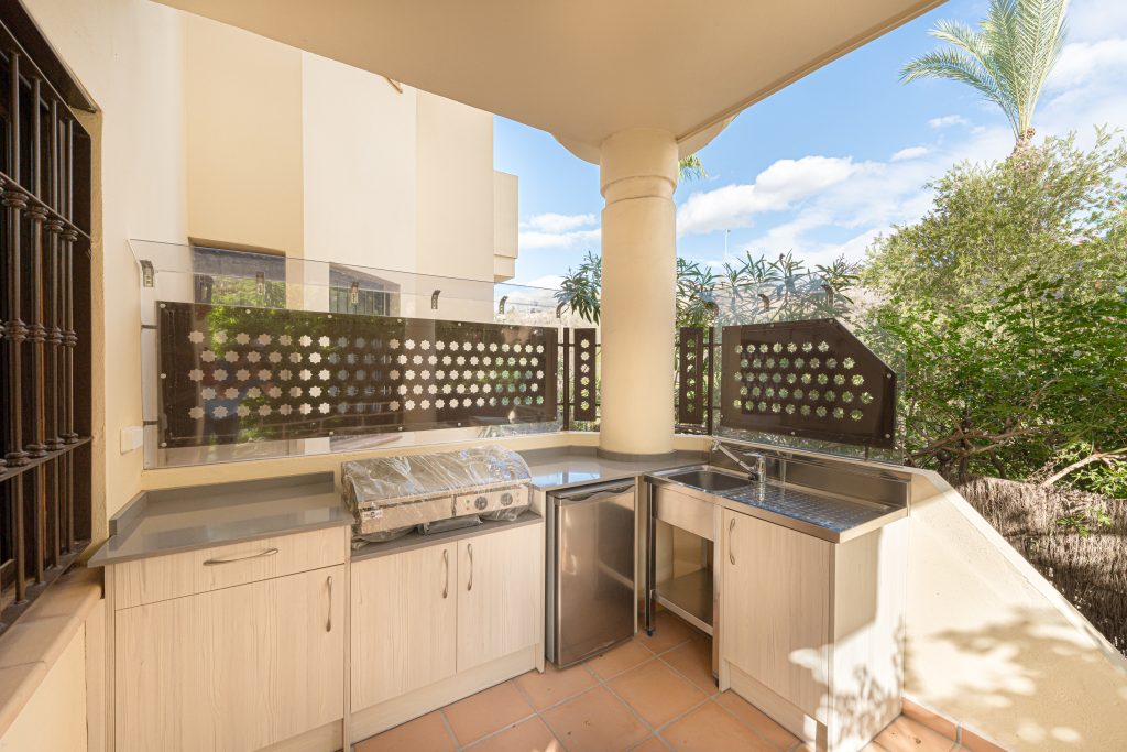 Met 150 bebouwde m2 en een privétuin en buitenkeuken. Het appartement heeft een ruim terras met overdekte en onoverdekte delen om zowel in de zon als in de schaduw van het buitenleven te genieten. Het complex heeft meerdere, gemeenschappelijke zwembaden omringd door mooi aangelegde tuinen. Bovendien is de entree van het 24-uurs beveiligde complex met slagboom en is er een conciërge aanwezig.