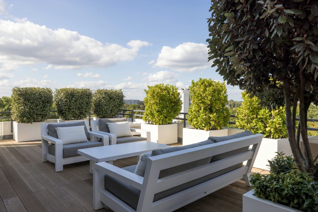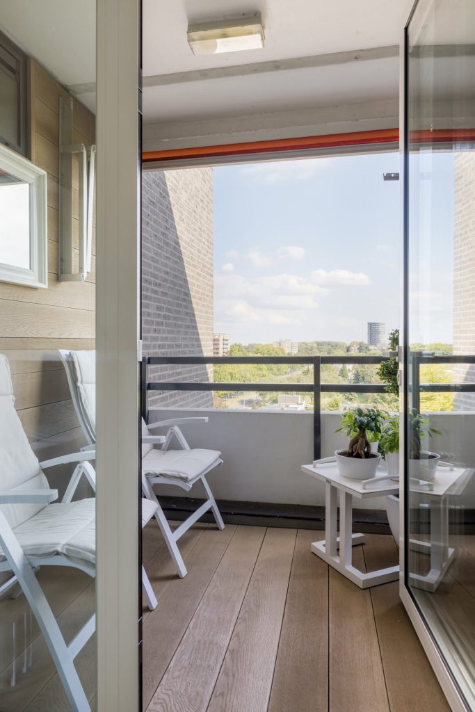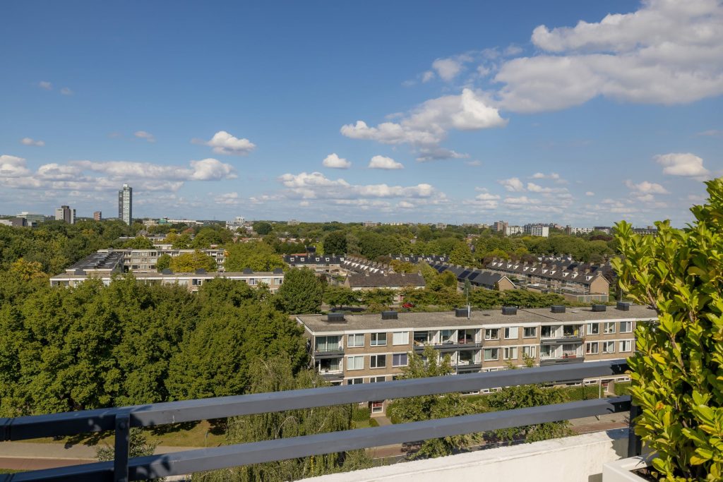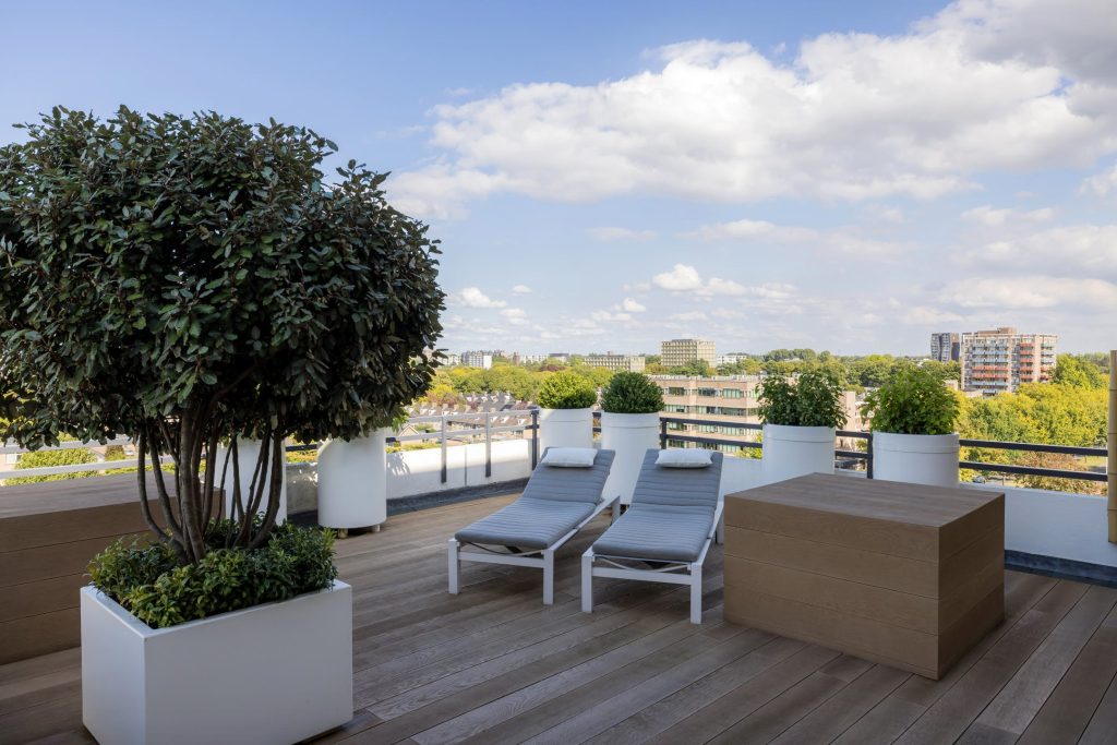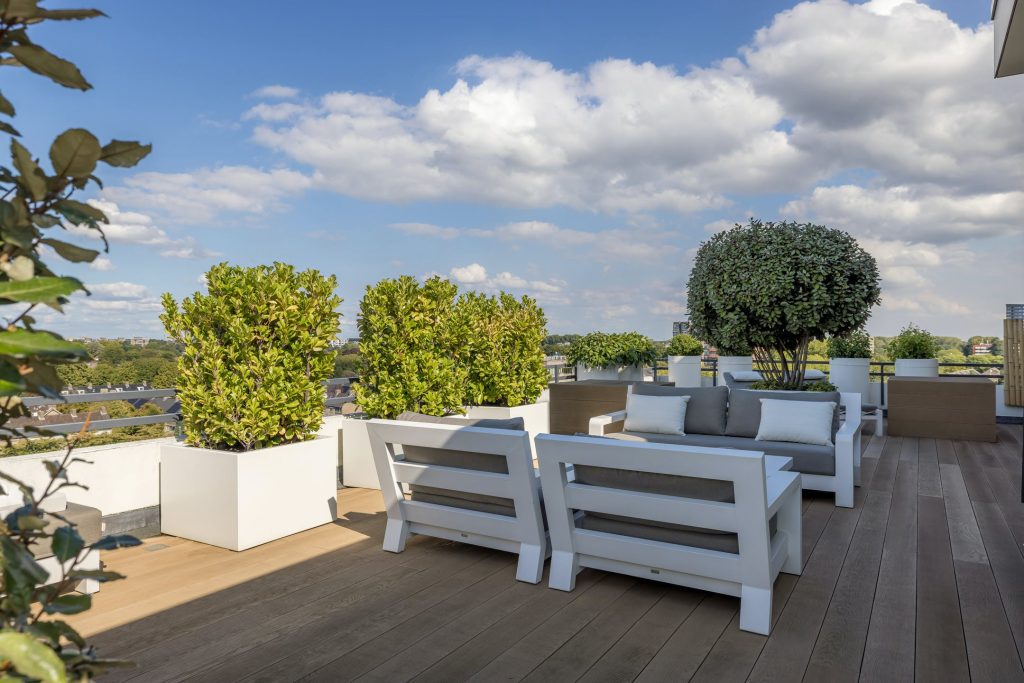 Bij een penthouse hoort een dakterras van formaat. Met een oppervlakte van ruim 90 m² heeft u hier de ruimte van een tuin, gecombineerd met het gemak van een terras. De indeling met grote plantenbakken, een buitendouche, een houten vloer en het panoramische uitzicht maken dit penthouse uniek. Tevens is het dakterras voorzien van automatische bewatering voor de planten. Het dakterras is te bereiken vanuit de woonkamer en hal. Daarnaast is er een balkon aan de oostkant, te bereiken vanuit de keuken.