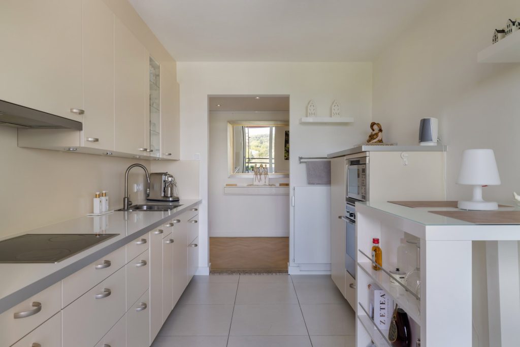 De tweede hal vormt de verbinding met de woonkamer en keuken. De visgraat parketvloer met zwarte bies geeft het appartement een luxe uitstraling. De lichte keuken is uitgevoerd in een mooie kleur, heeft veel bergruimte en alle benodigde apparatuur van Siemens is ingebouwd: een inductie kookplaat, afzuigkap, oven, magnetron, vaatwasser, koelkast en een vriezer. Er is ruimte voor een tweepersoons hoge tafel, perfect voor een ontbijt met de ochtendzon die naar binnen valt.