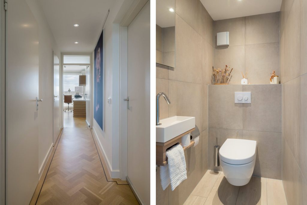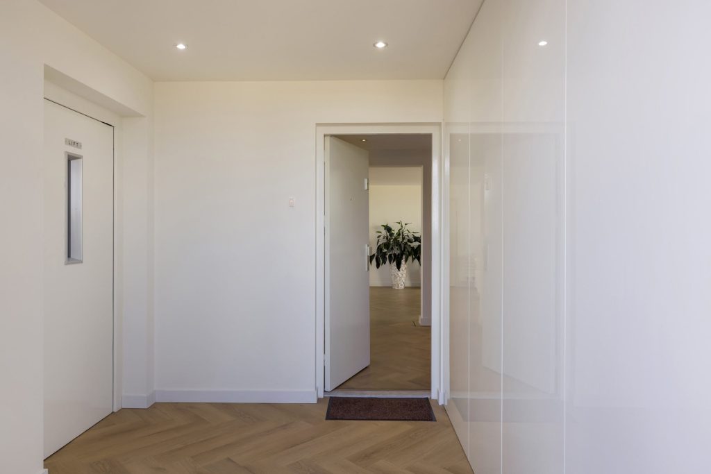 Met de lift gaat u comfortabel naar de bovenste verdieping van dit uitstekend onderhouden appartementengebouw. Het eerste deel van de hal is een prachtige ontvangstruimte met een visgraatvloer, gestucte wanden en inbouwverlichting in het plafond. Achter de hoge, witte deuren zijn de meterkast en twee bergingen, waarvan een als wasruimte gebruikt kan worden.