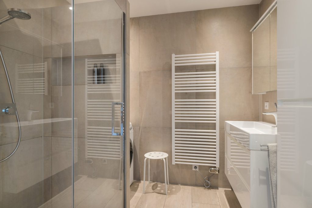 In de stijlvolle badkamer ziet u een grote inloopdouche met glazen wand, een elektrische handdoekenradiator en een modern wastafelmeubel met spiegelkast en veel bergruimte. De naastgelegen toiletruimte met fonteintje is in dezelfde stijl uitgevoerd.