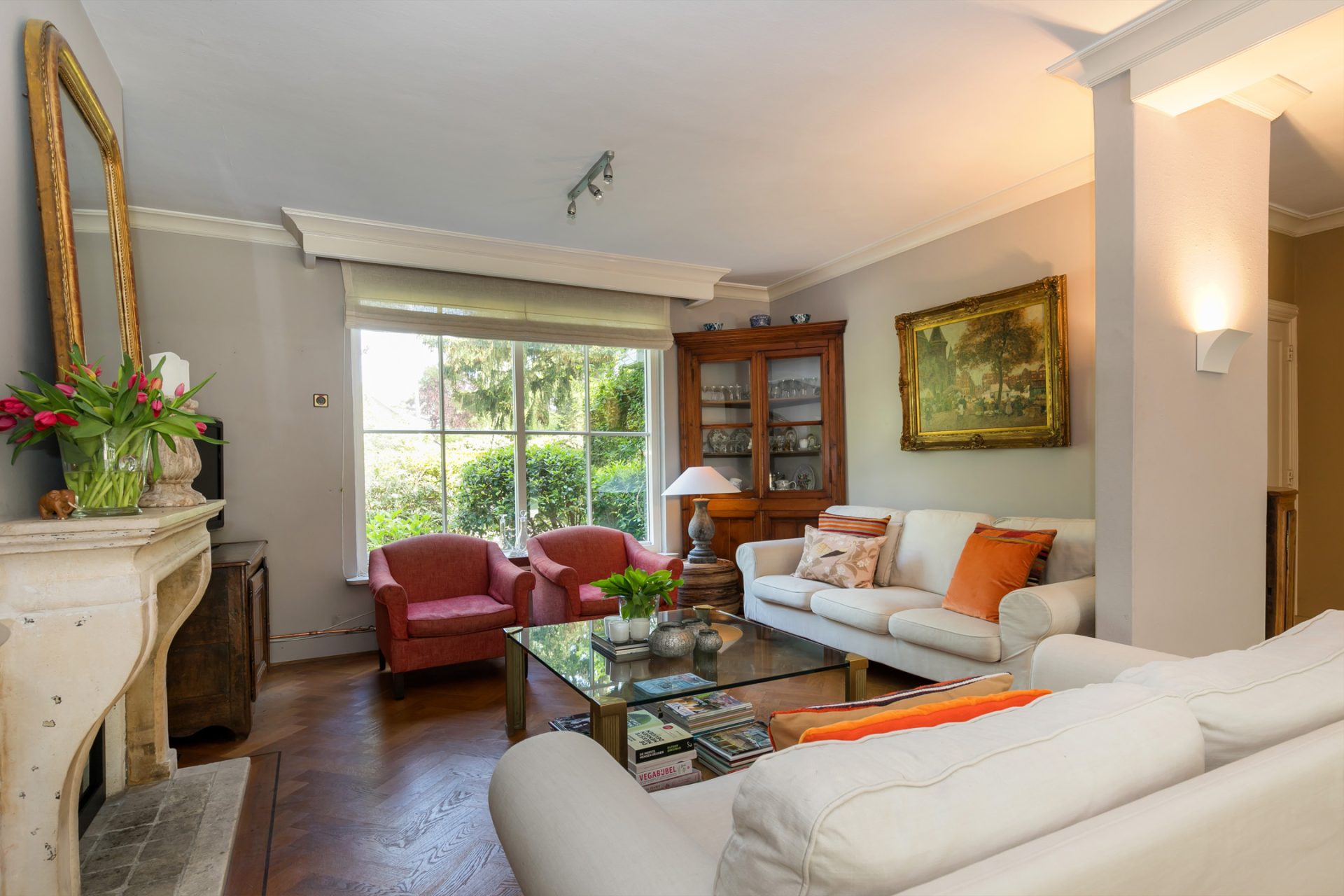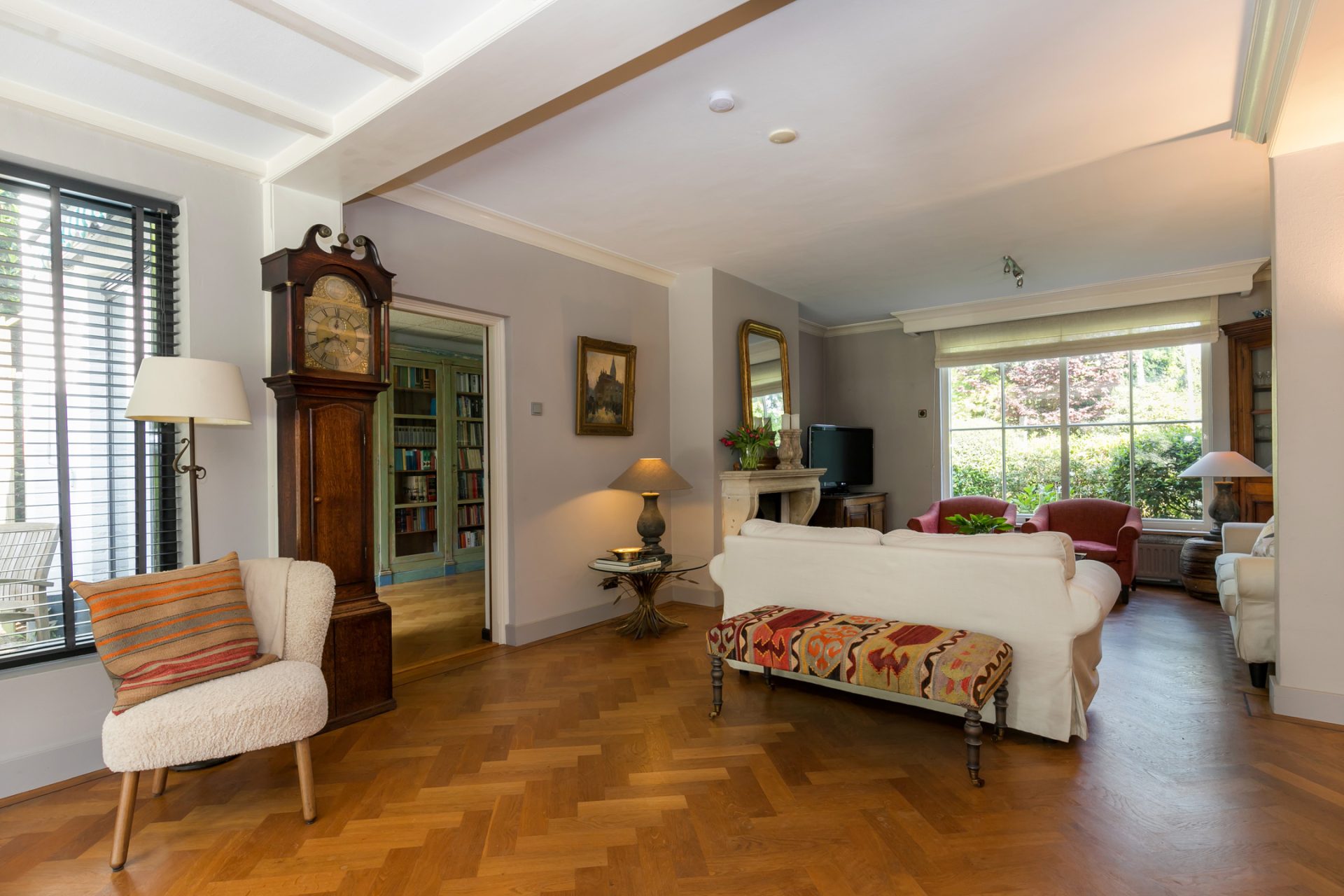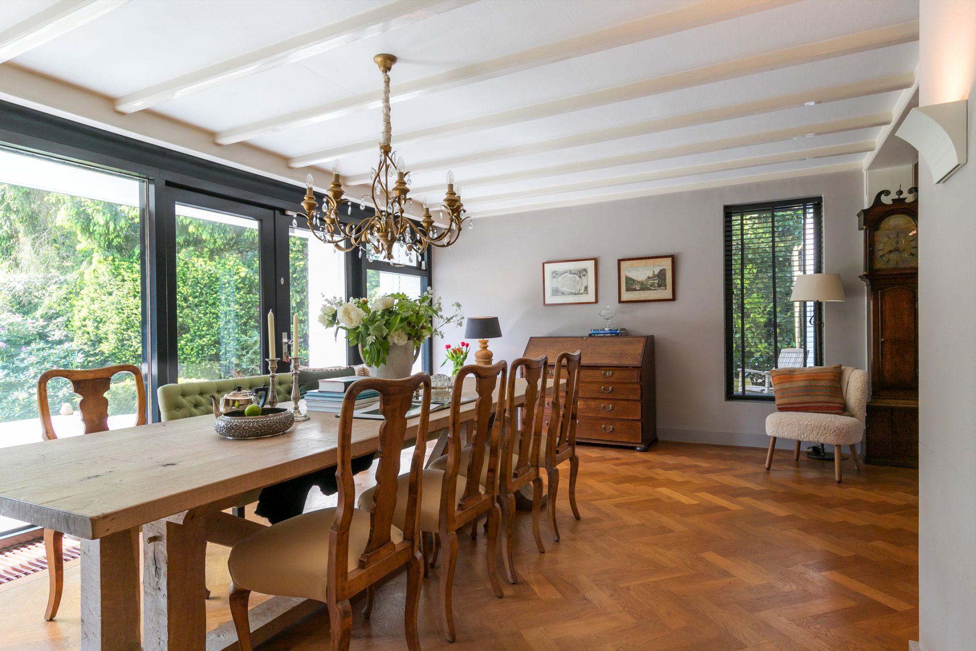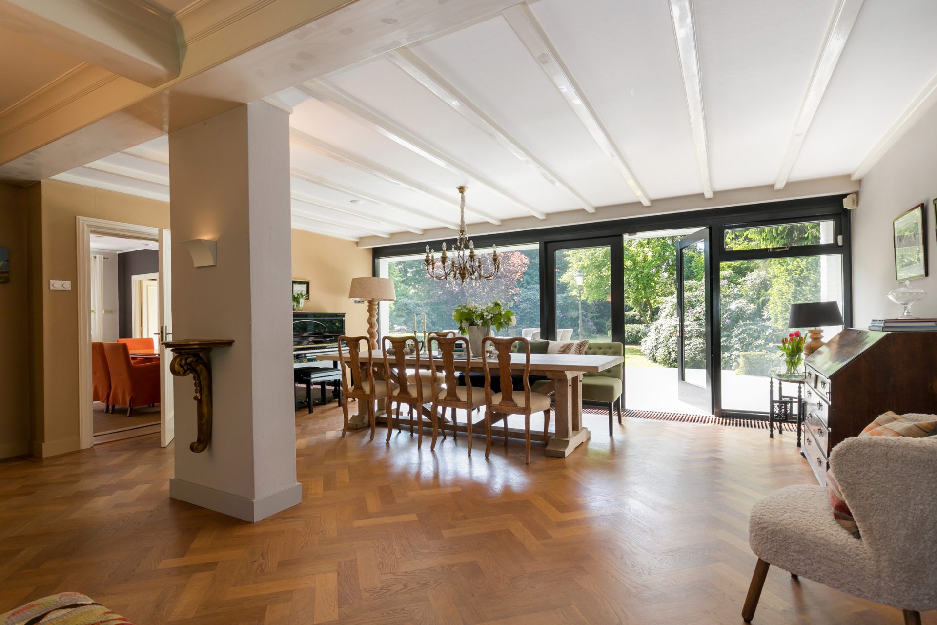 De sfeervolle woon-/eetkamer is fraai ingedeeld met het zitgedeelte aan de voorzijde en het eetgedeelte aan de achterzijde, met grote ramen en openslaande deuren over de gehele breedte. Sfeermakers zijn de klassieke schouw met inbouw gashaard en de visgraat parketvloer met zwarte bies. Rechts van de woonkamer bevindt zich een fraaie kantoorruimte met een groot raam aan de voorzijde en een schuifpui naar de achtertuin. Ideaal om ook nog even beschut met klanten een kop koffie in de achtertuin te drinken.