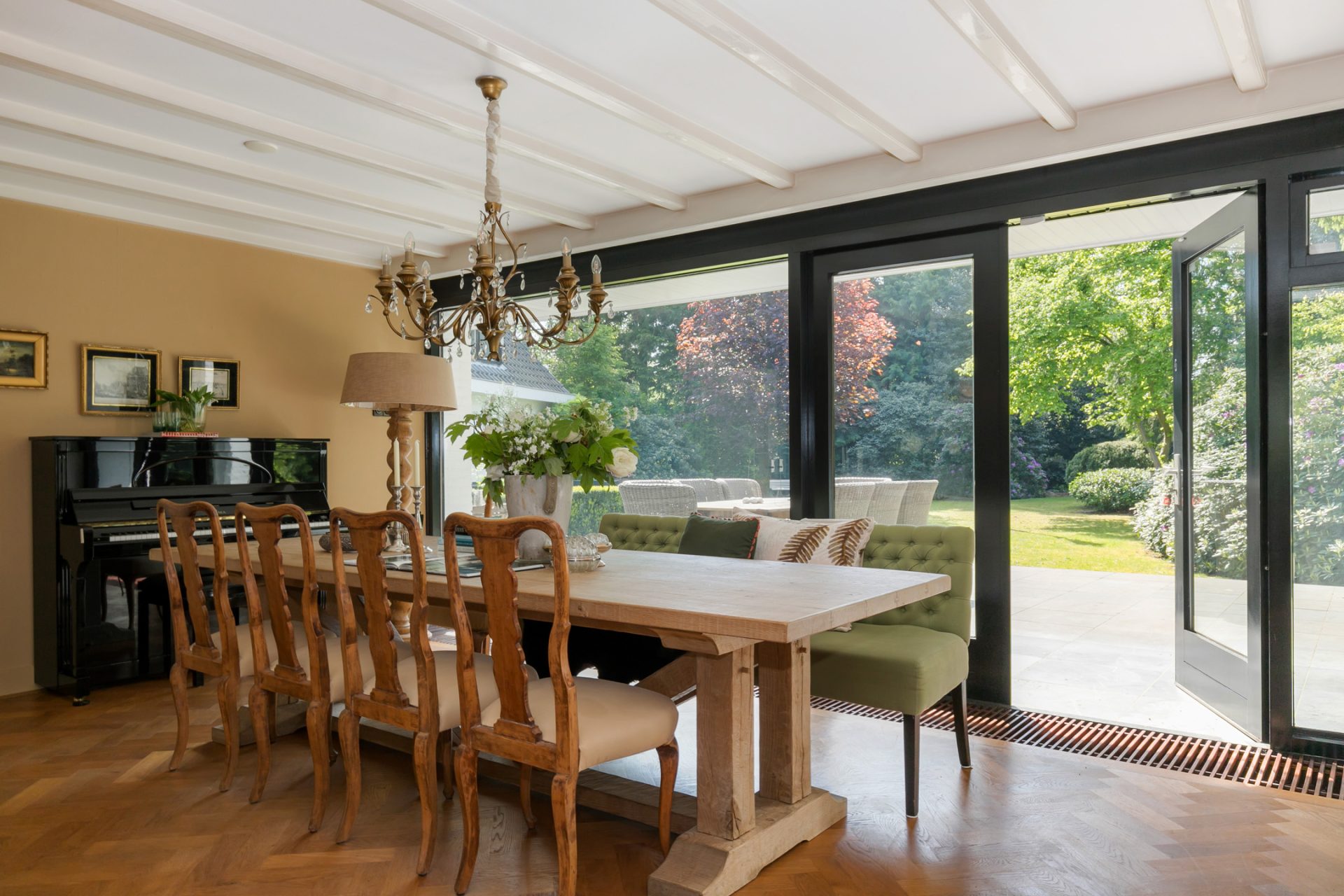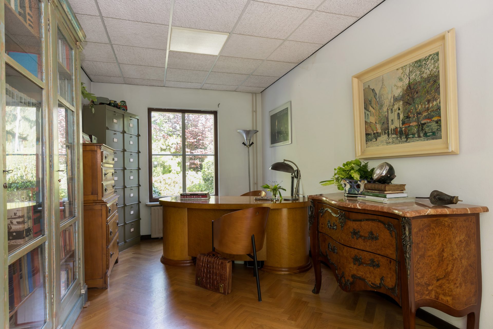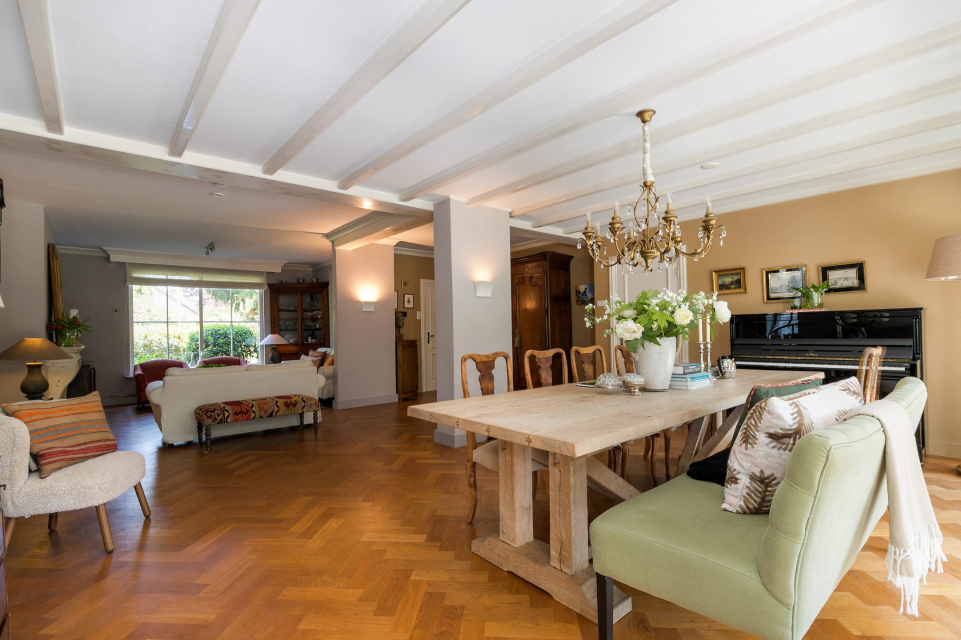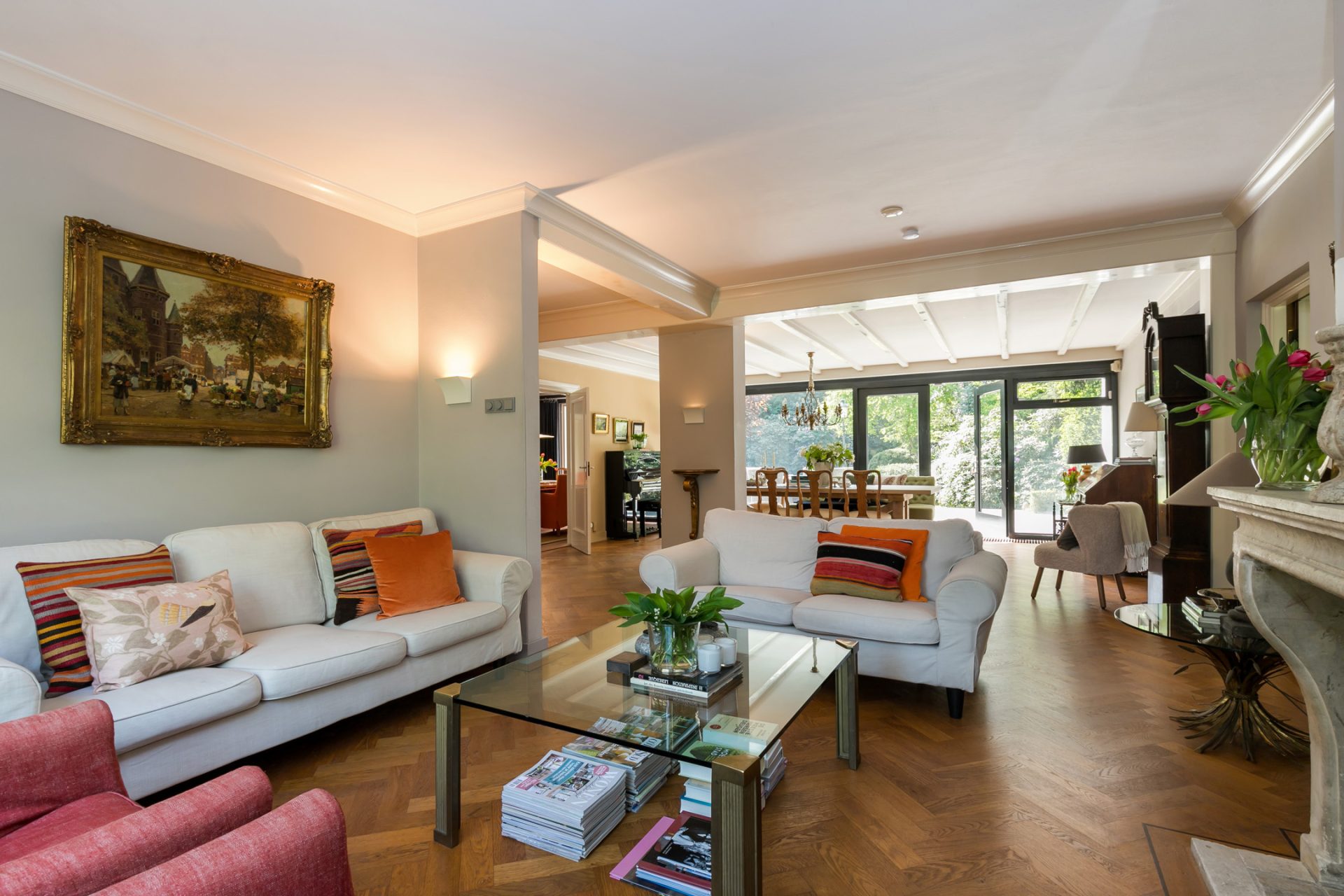 De sfeervolle woon-/eetkamer is fraai ingedeeld met het zitgedeelte aan de voorzijde en het eetgedeelte aan de achterzijde, met grote ramen en openslaande deuren over de gehele breedte. Sfeermakers zijn de klassieke schouw met inbouw gashaard en de visgraat parketvloer met zwarte bies. Rechts van de woonkamer bevindt zich een fraaie kantoorruimte met een groot raam aan de voorzijde en een schuifpui naar de achtertuin. Ideaal om ook nog even beschut met klanten een kop koffie in de achtertuin te drinken.