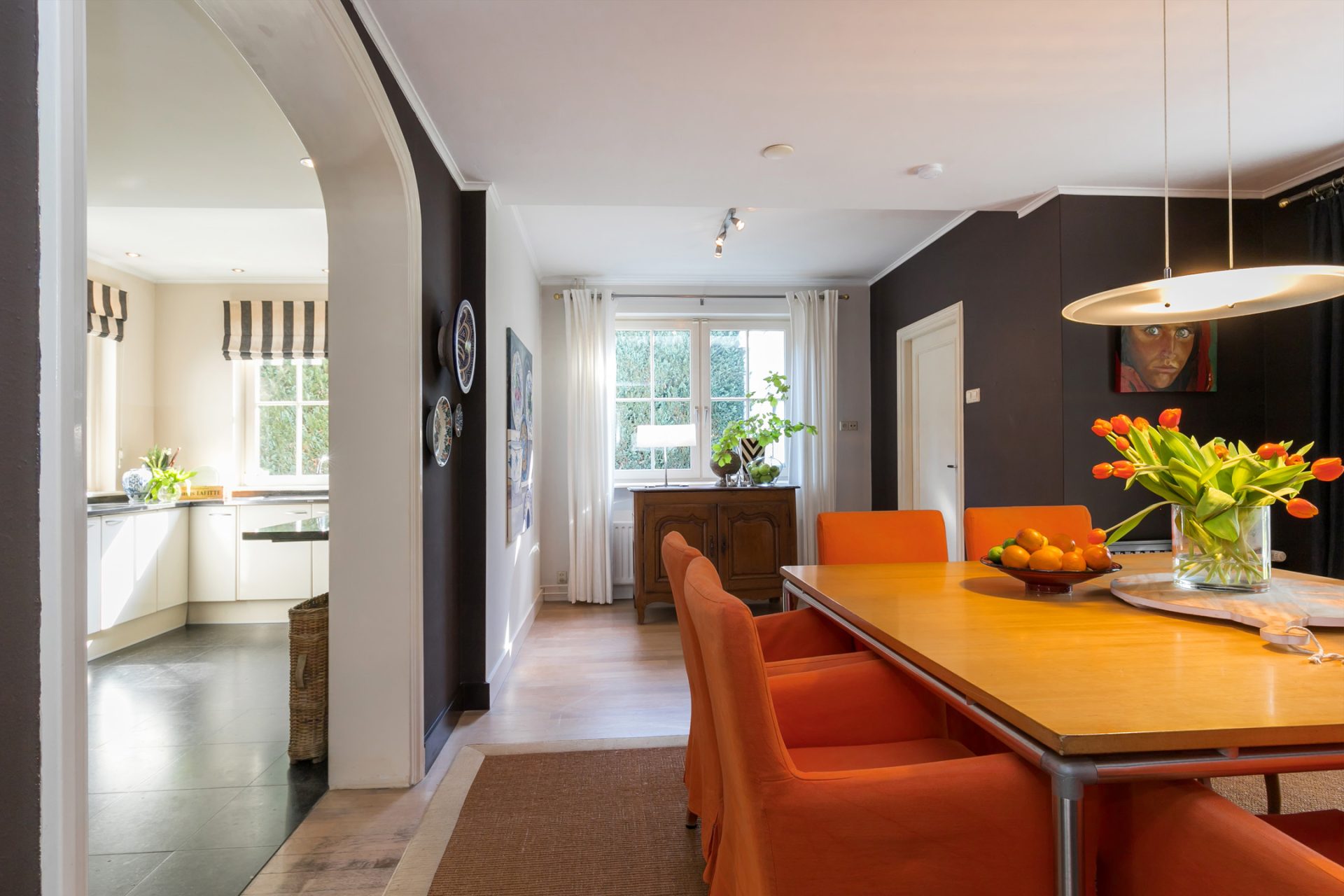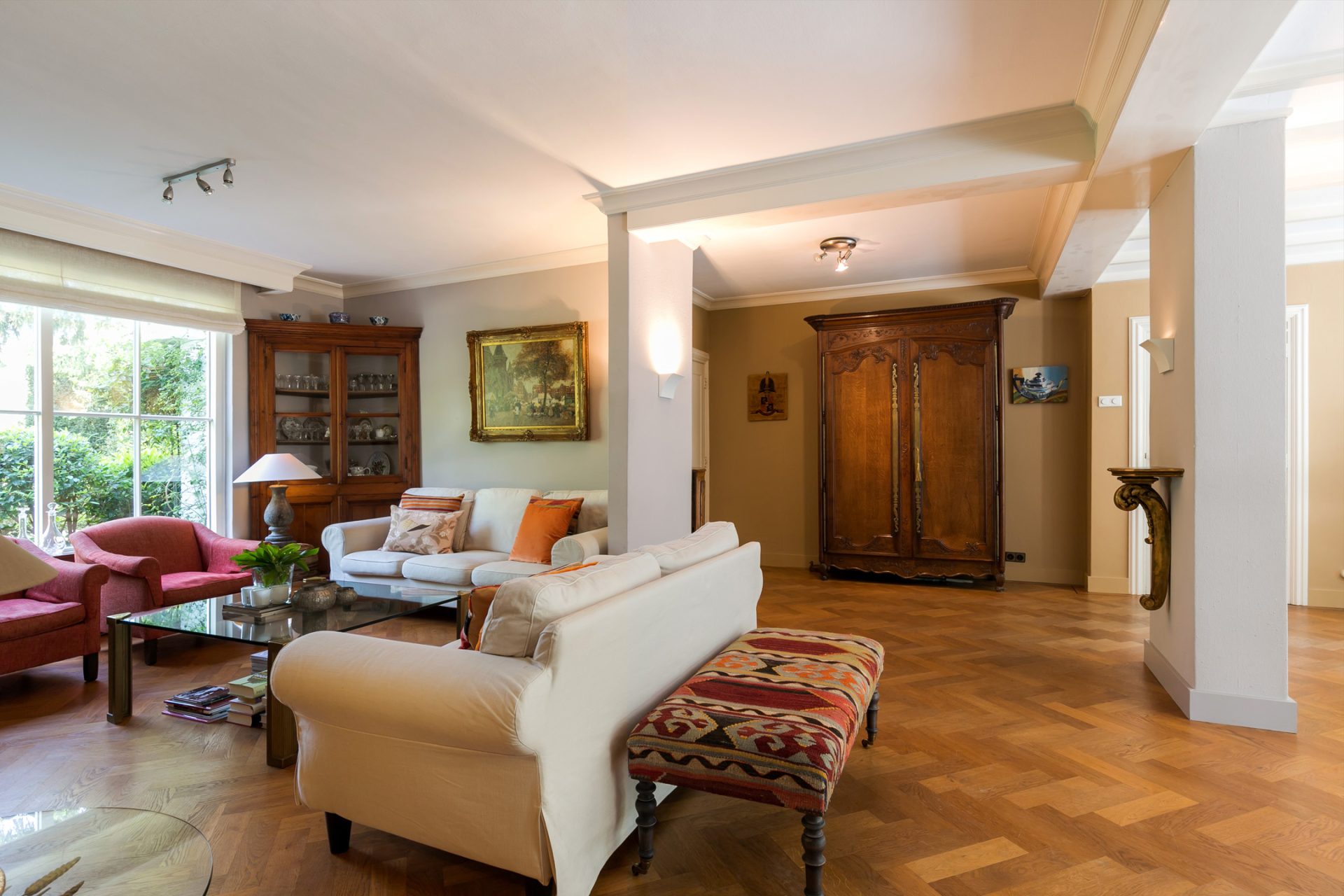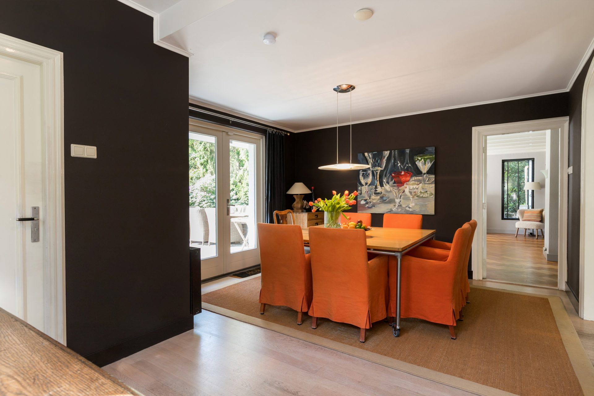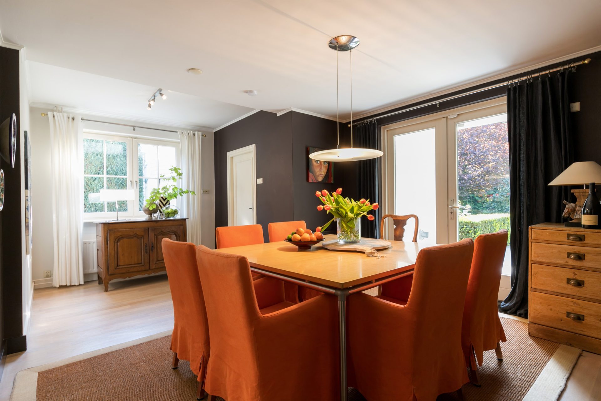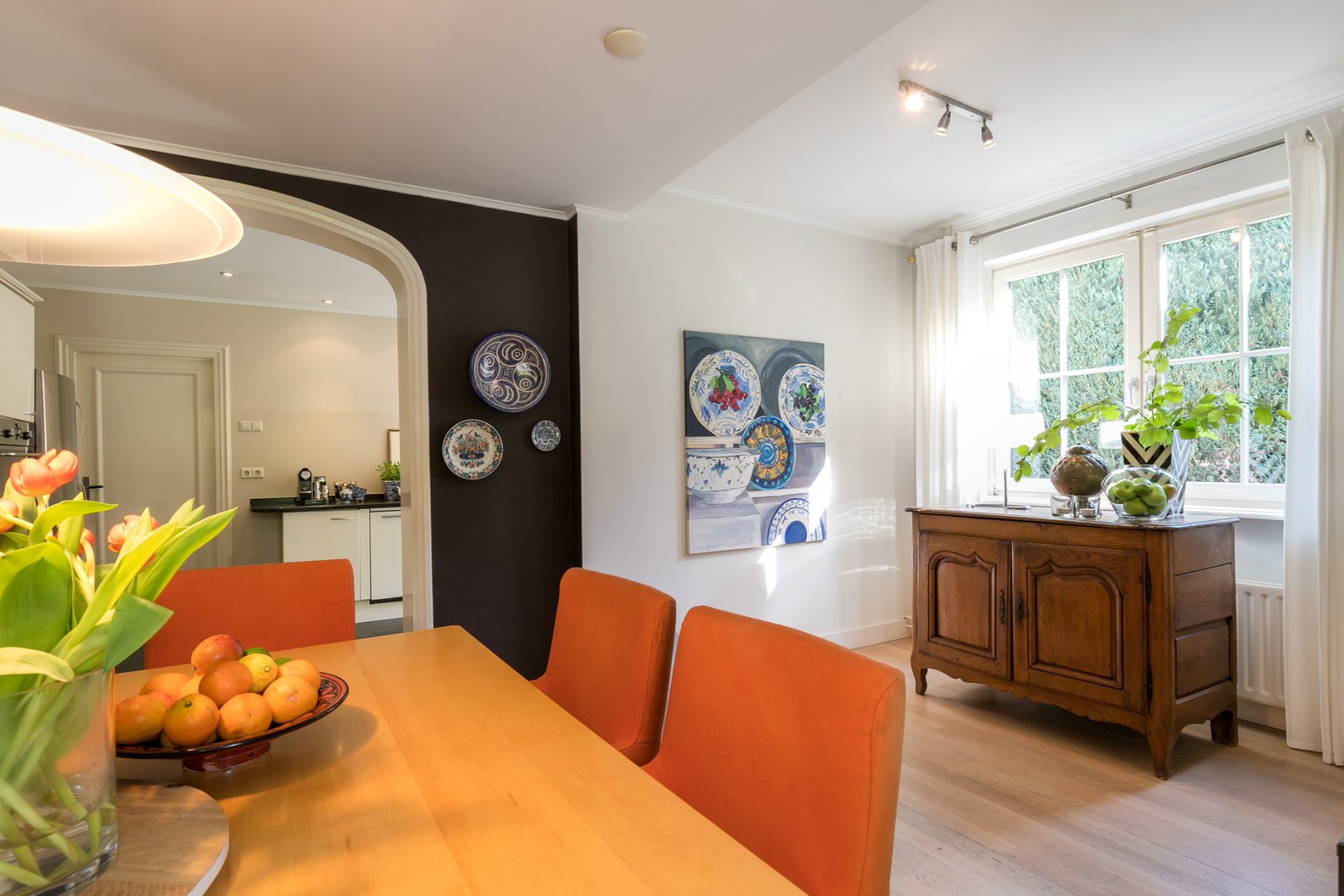De sfeervolle woon-/eetkamer is fraai ingedeeld met het zitgedeelte aan de voorzijde en het eetgedeelte aan de achterzijde, met grote ramen en openslaande deuren over de gehele breedte. Sfeermakers zijn de klassieke schouw met inbouw gashaard en de visgraat parketvloer met zwarte bies. Rechts van de woonkamer bevindt zich een fraaie kantoorruimte met een groot raam aan de voorzijde en een schuifpui naar de achtertuin. Ideaal om ook nog even beschut met klanten een kop koffie in de achtertuin te drinken.
