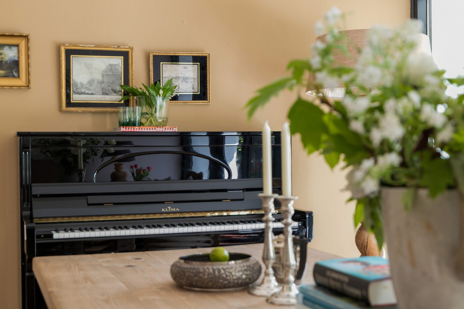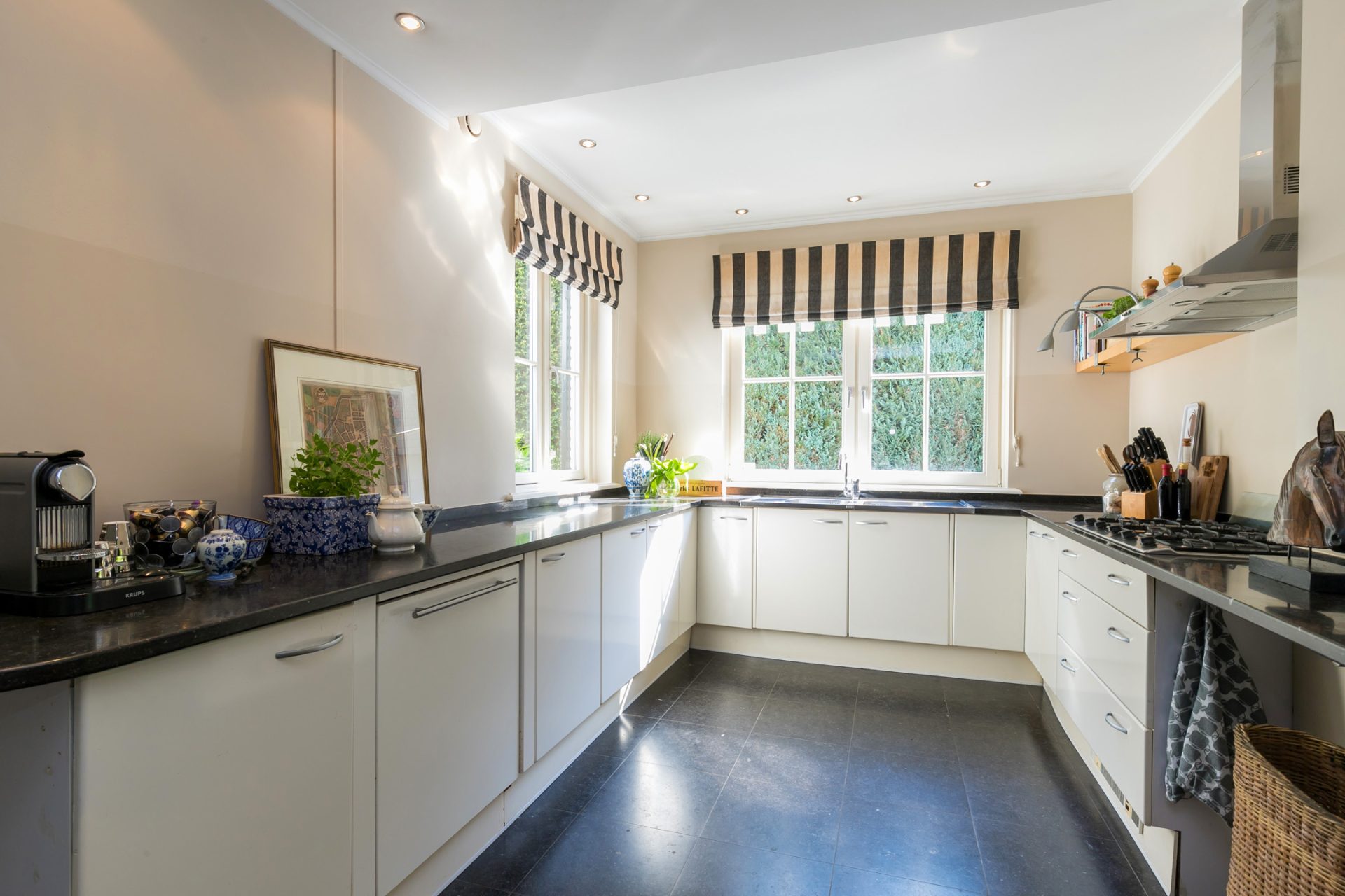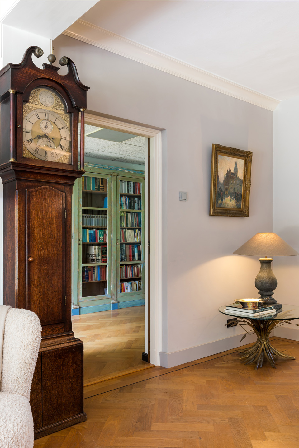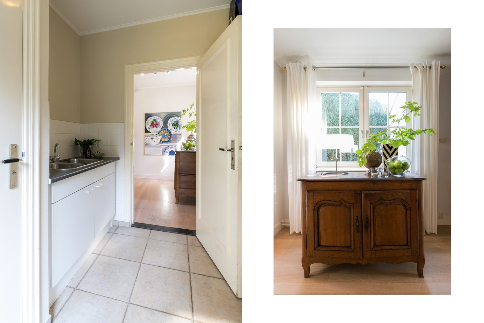 De sfeervolle woon-/eetkamer is fraai ingedeeld met het zitgedeelte aan de voorzijde en het eetgedeelte aan de achterzijde, met grote ramen en openslaande deuren over de gehele breedte. Sfeermakers zijn de klassieke schouw met inbouw gashaard en de visgraat parketvloer met zwarte bies. Rechts van de woonkamer bevindt zich een fraaie kantoorruimte met een groot raam aan de voorzijde en een schuifpui naar de achtertuin. Ideaal om ook nog even beschut met klanten een kop koffie in de achtertuin te drinken.