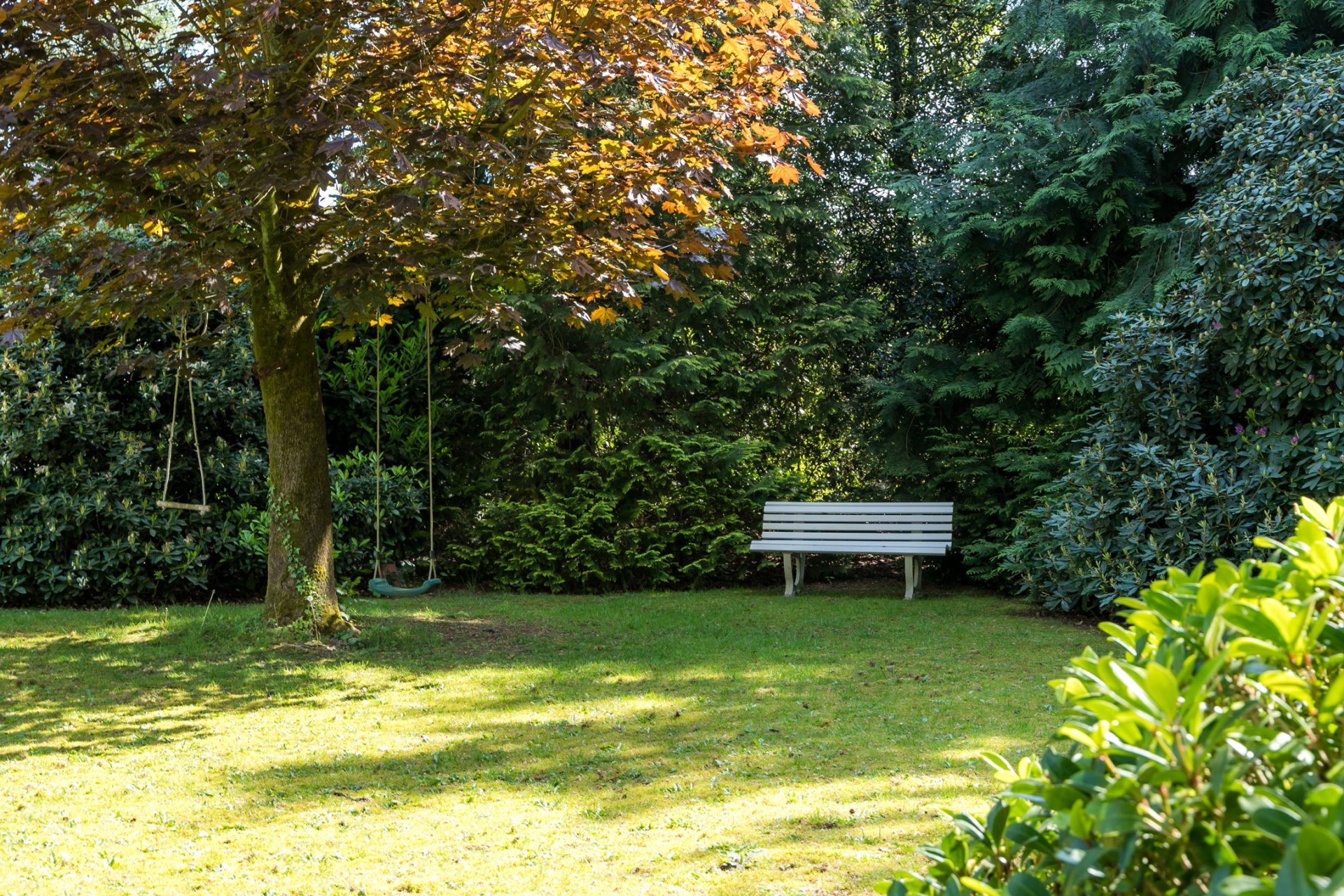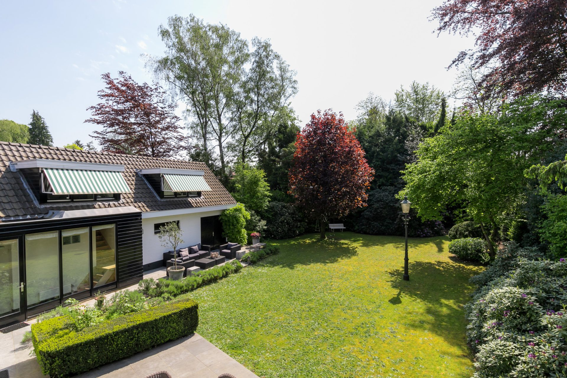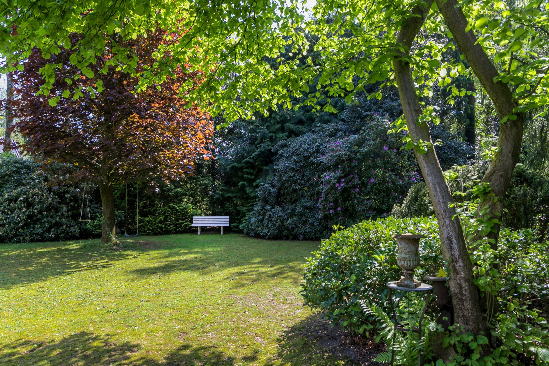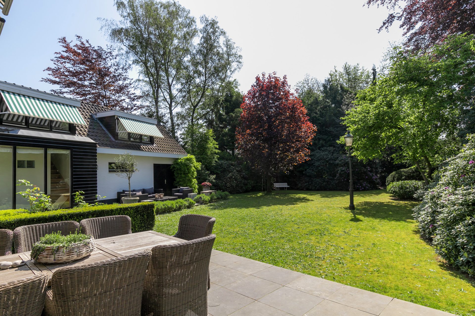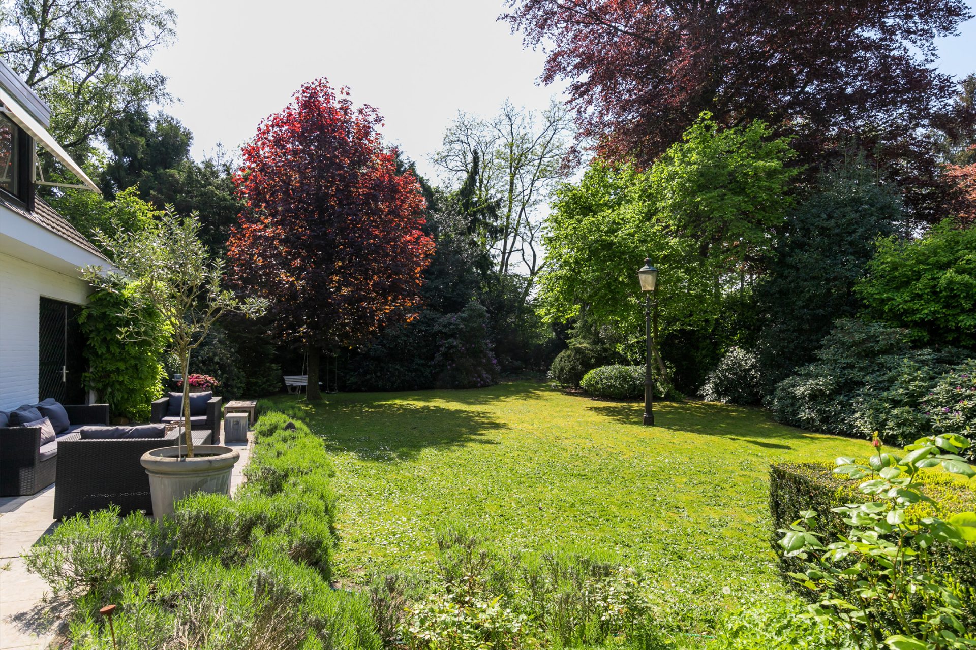 In de diepe achtertuin ervaar je, dankzij de hoge bomen en brede borders, optimale privacy en het gevoel dat je in een park woont. De grote terrassen hebben een uitstekende zonligging en de tuin is een perfecte speel- en ontspanningsplek voor kinderen. Aan een van de bomen hangen twee schommels, in de schaduw en met fraai uitzicht richting de villa. Dit is een droom voor jong en oud …