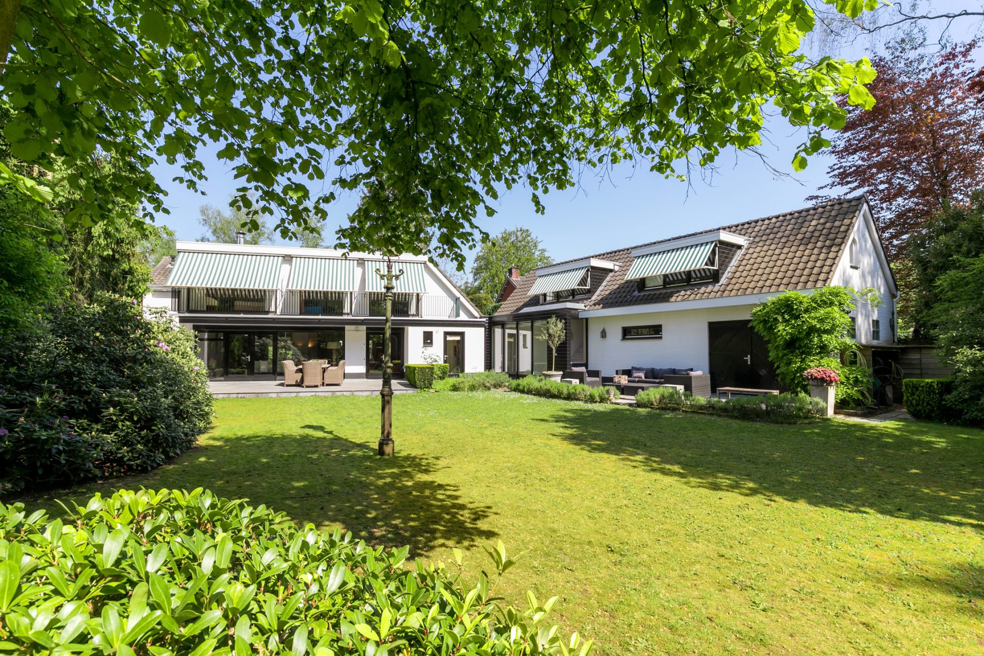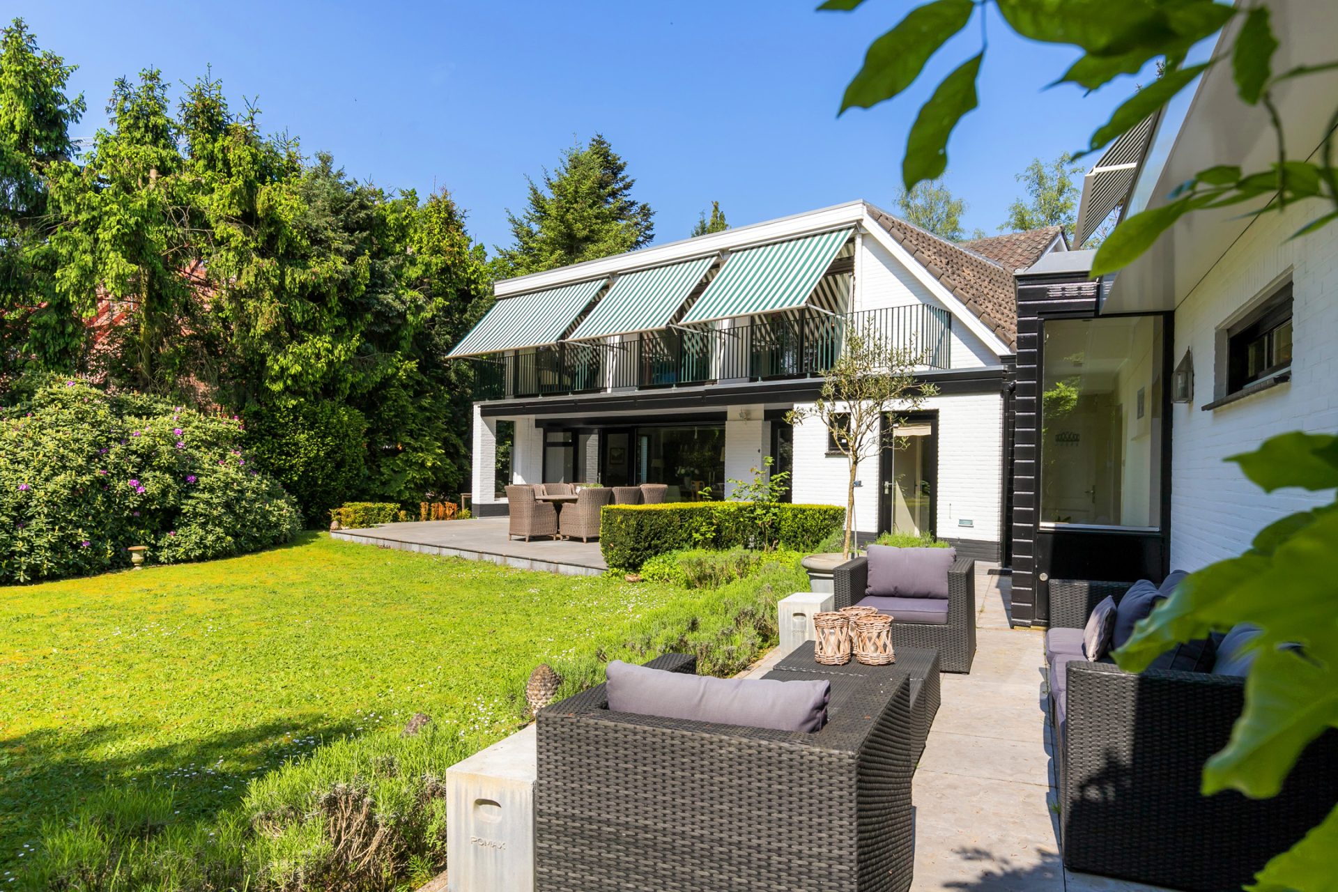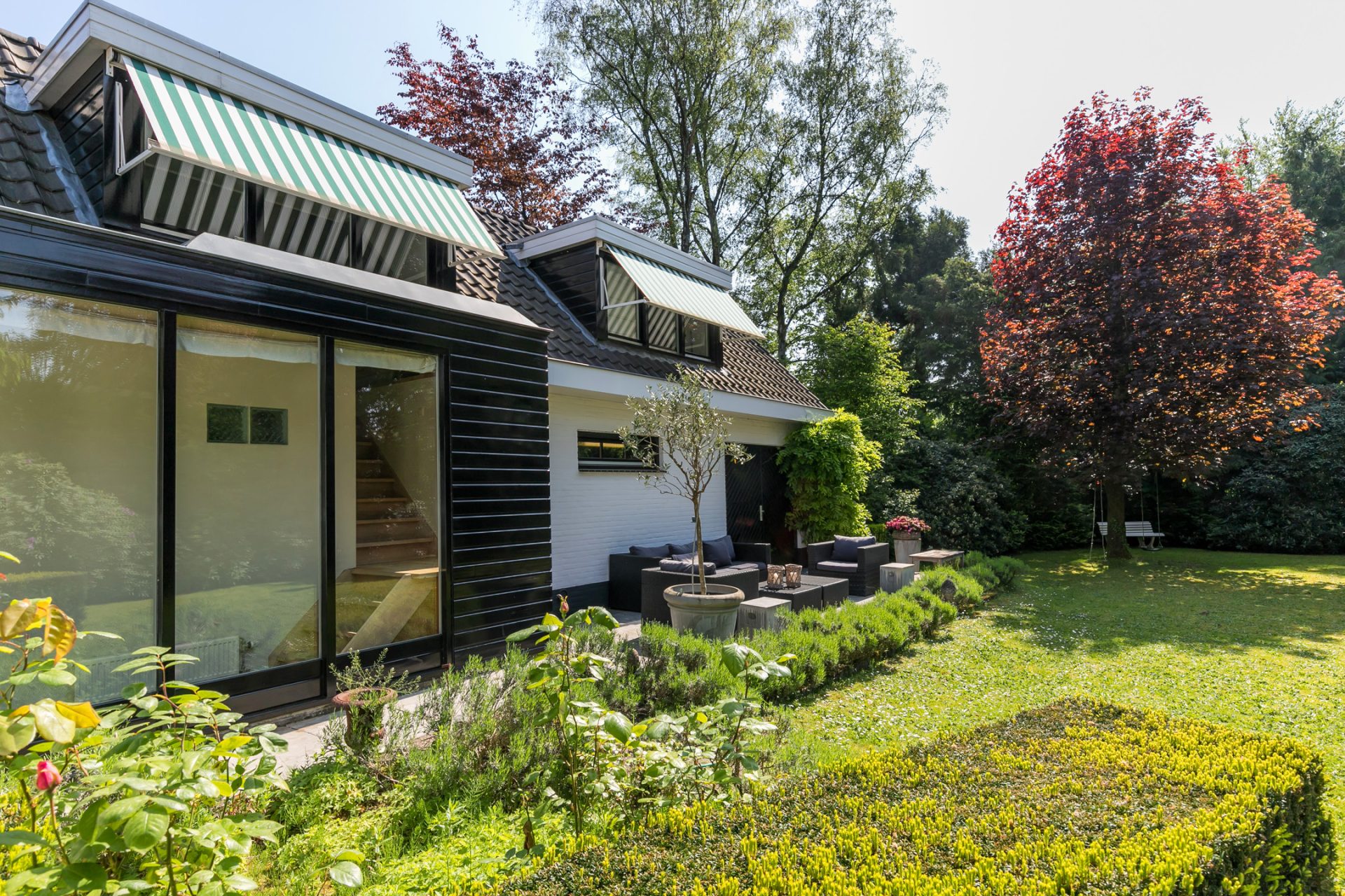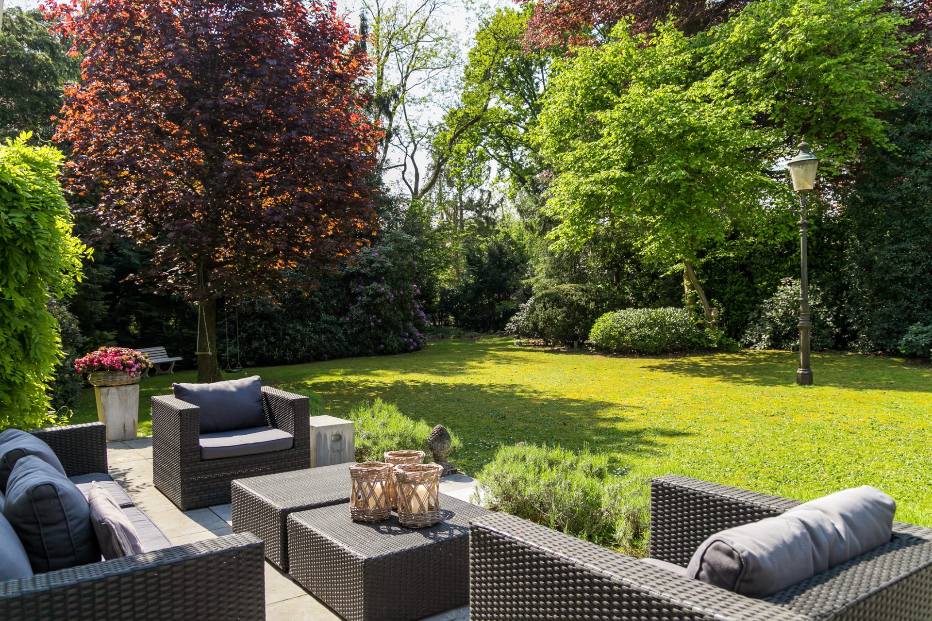 In de diepe achtertuin ervaar je, dankzij de hoge bomen en brede borders, optimale privacy en het gevoel dat je in een park woont. De grote terrassen hebben een uitstekende zonligging en de tuin is een perfecte speel- en ontspanningsplek voor kinderen. Aan een van de bomen hangen twee schommels, in de schaduw en met fraai uitzicht richting de villa. Dit is een droom voor jong en oud …