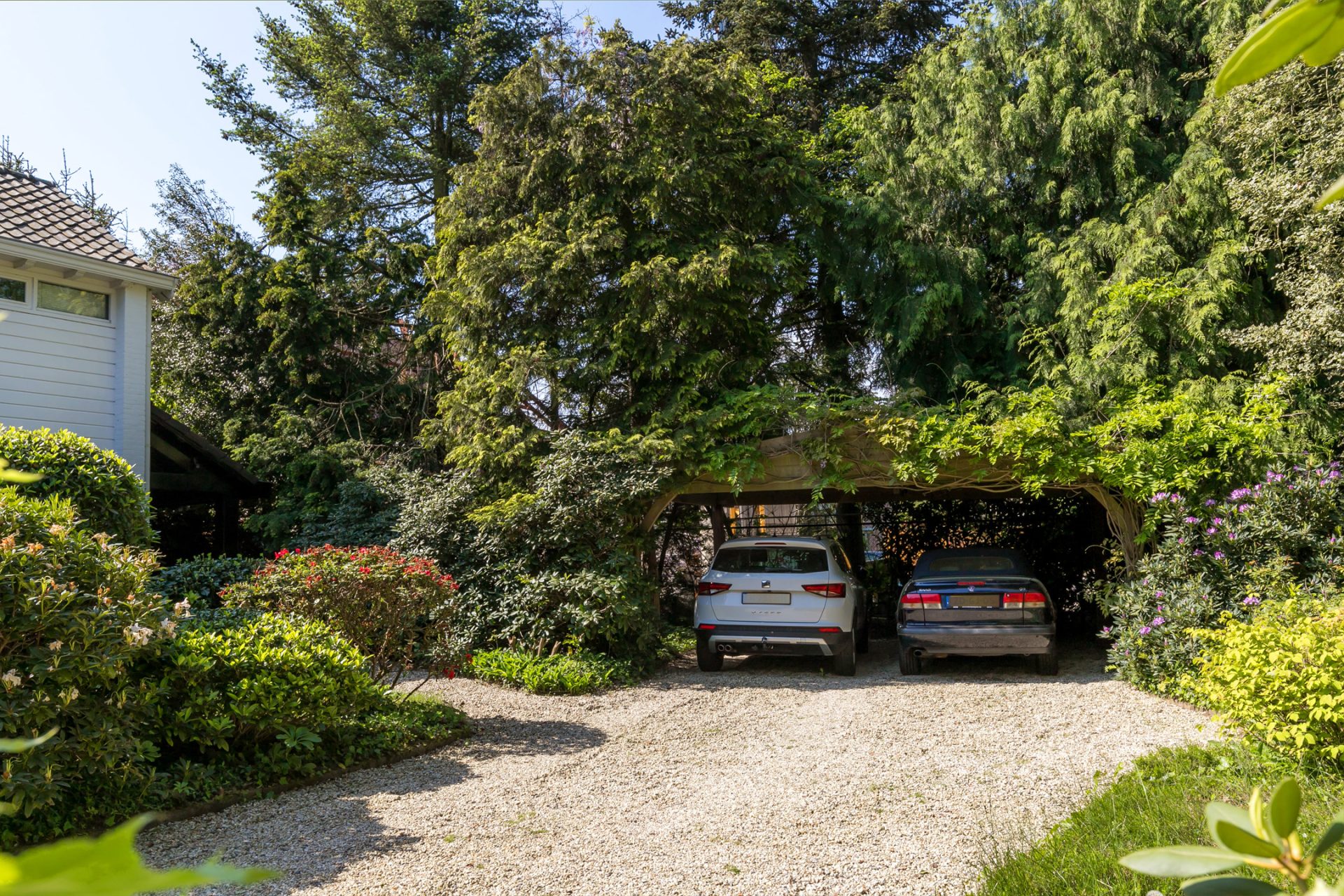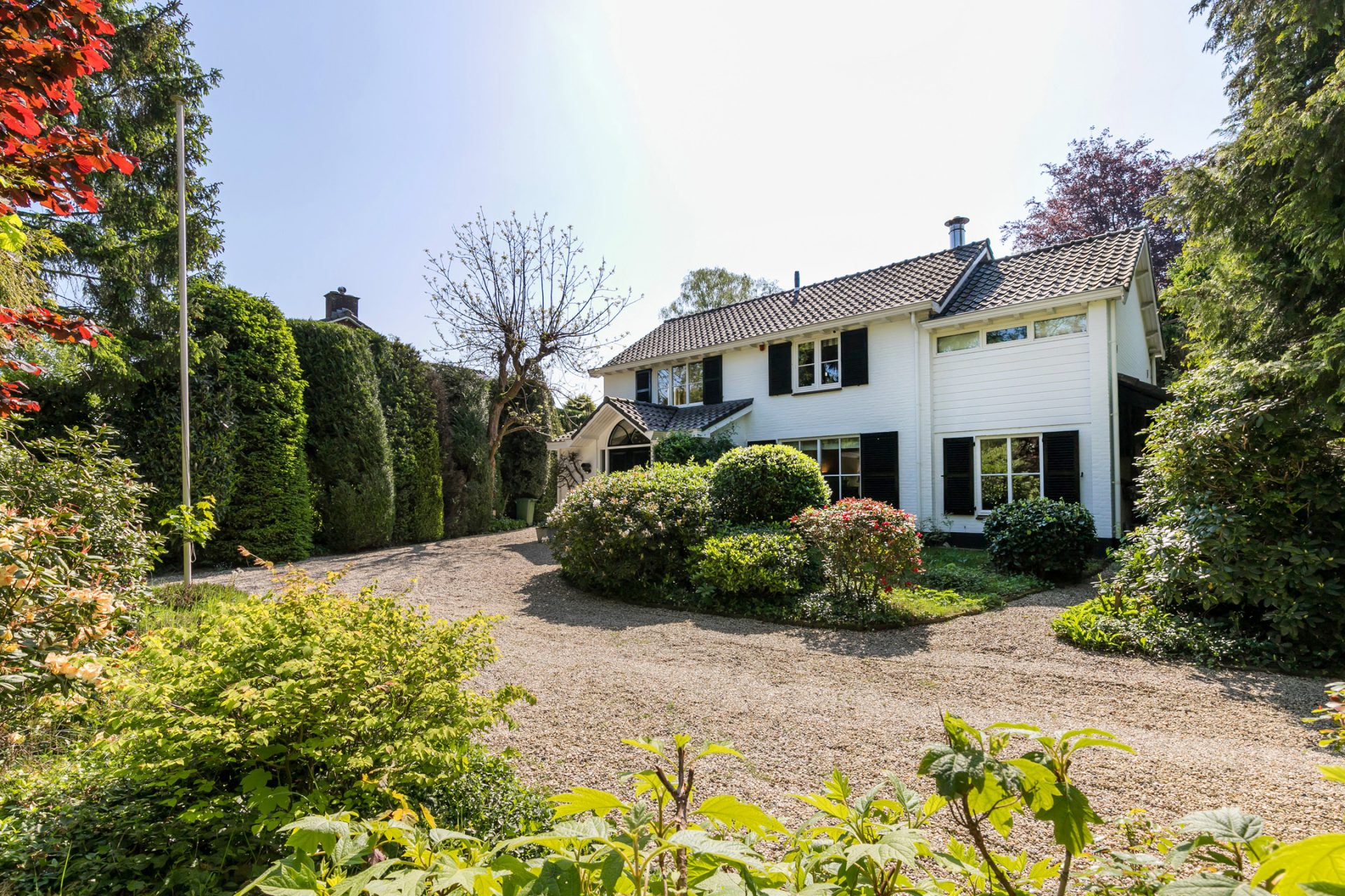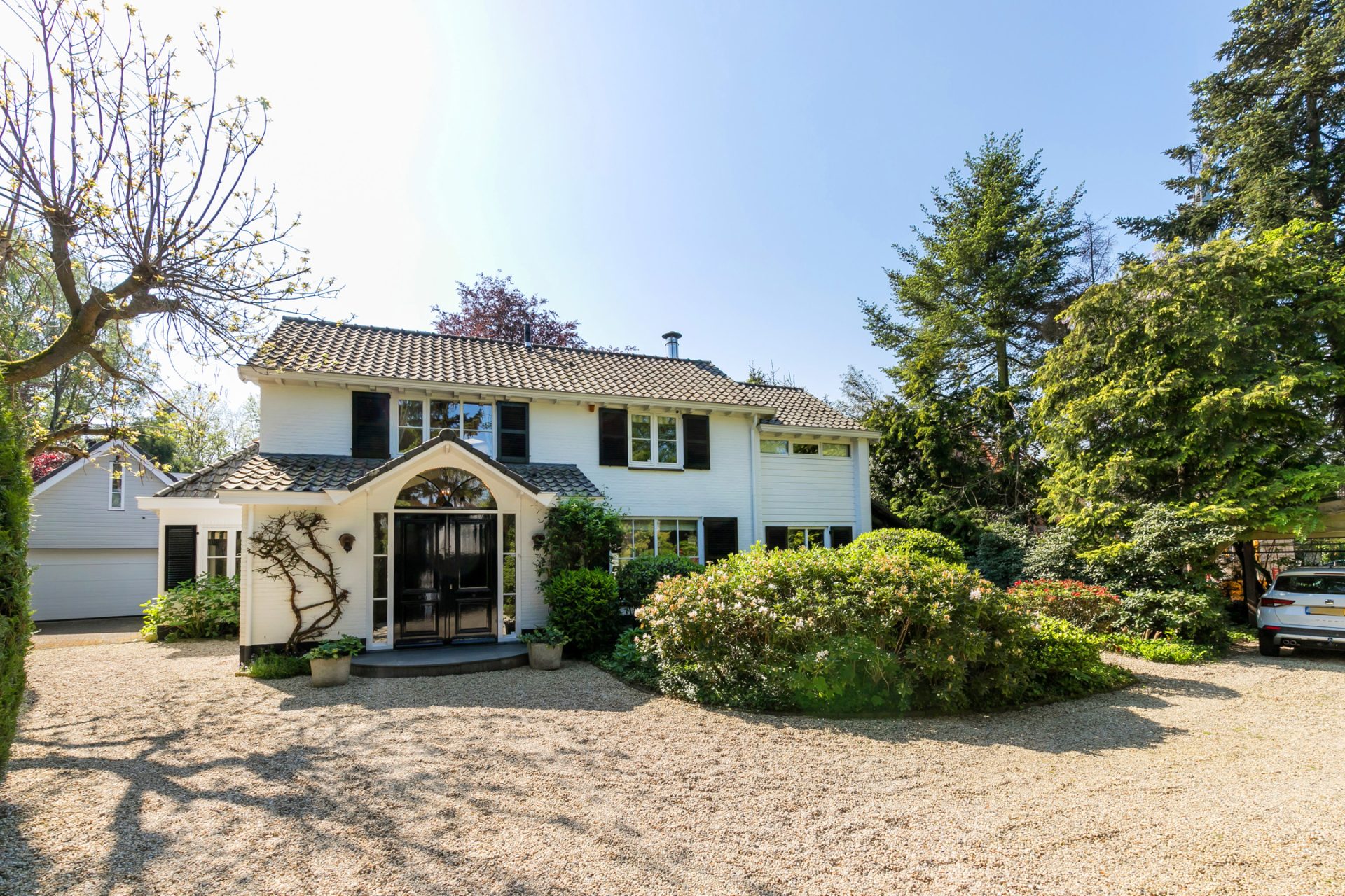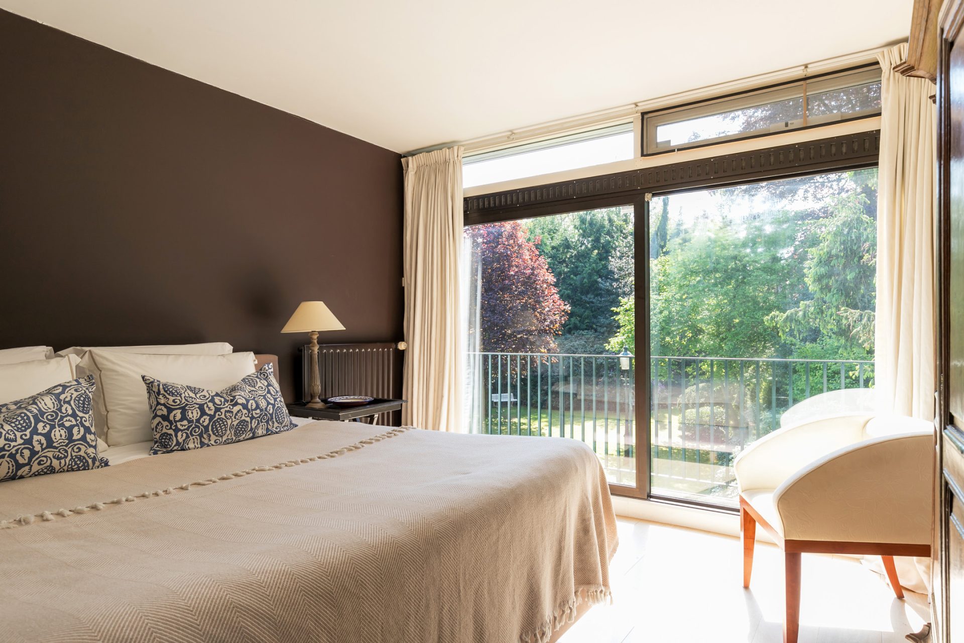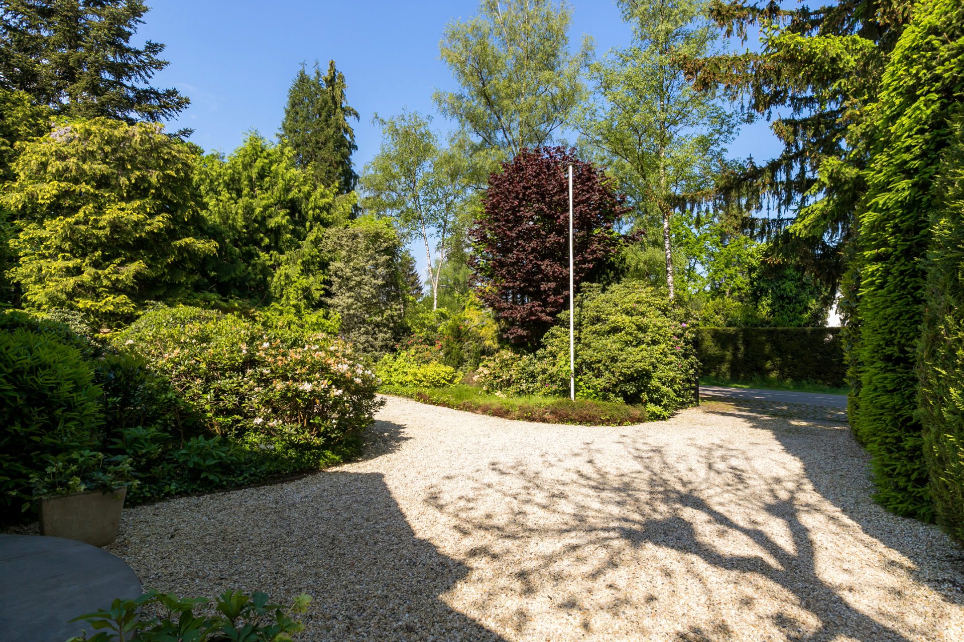 In de diepe achtertuin ervaar je, dankzij de hoge bomen en brede borders, optimale privacy en het gevoel dat je in een park woont. De grote terrassen hebben een uitstekende zonligging en de tuin is een perfecte speel- en ontspanningsplek voor kinderen. Aan een van de bomen hangen twee schommels, in de schaduw en met fraai uitzicht richting de villa. Dit is een droom voor jong en oud …