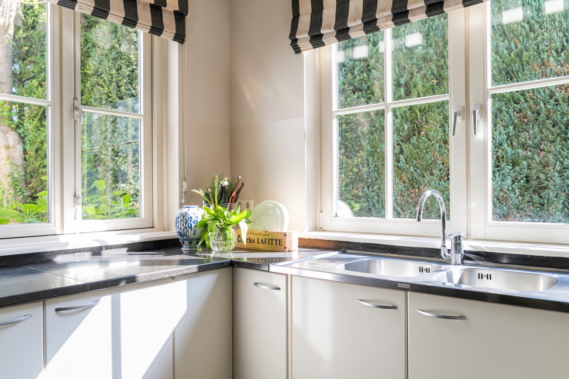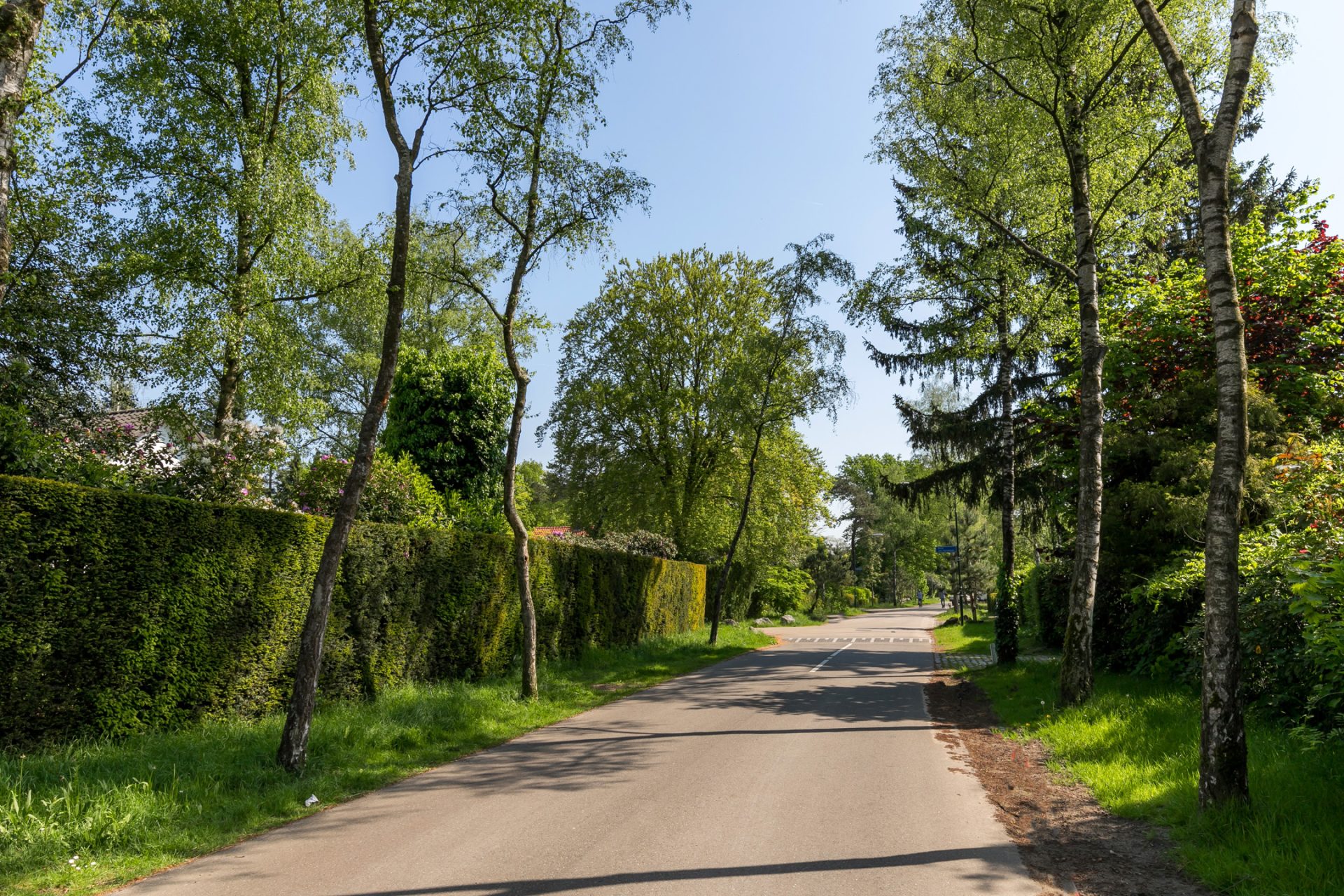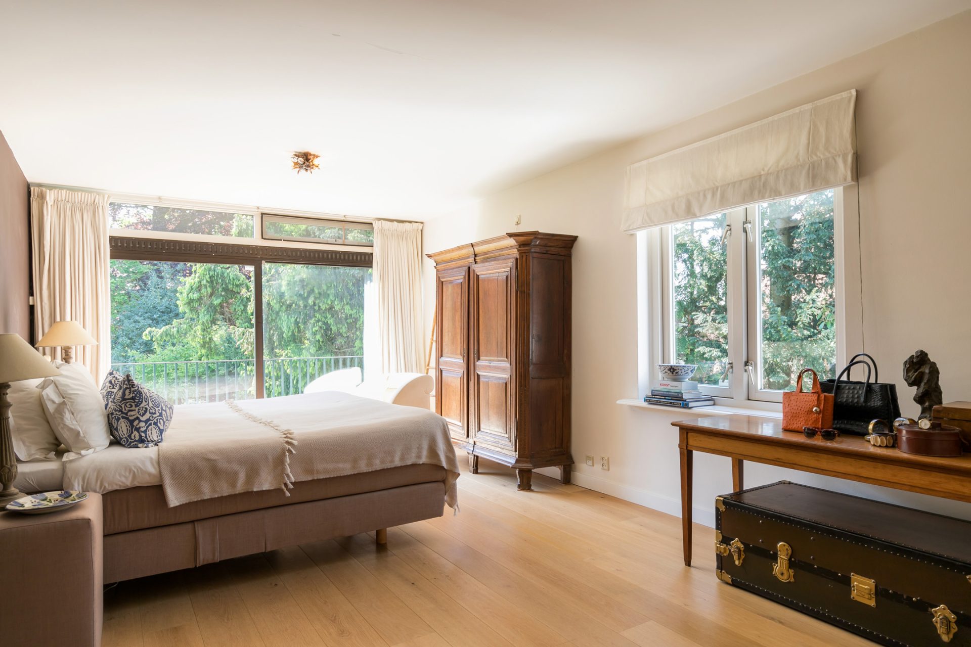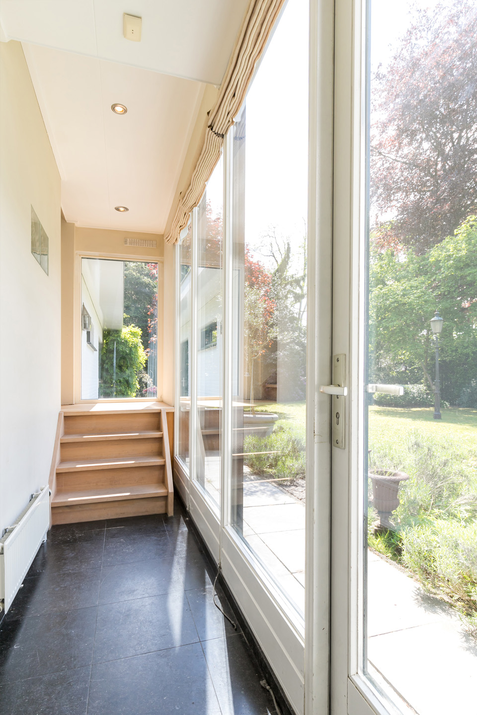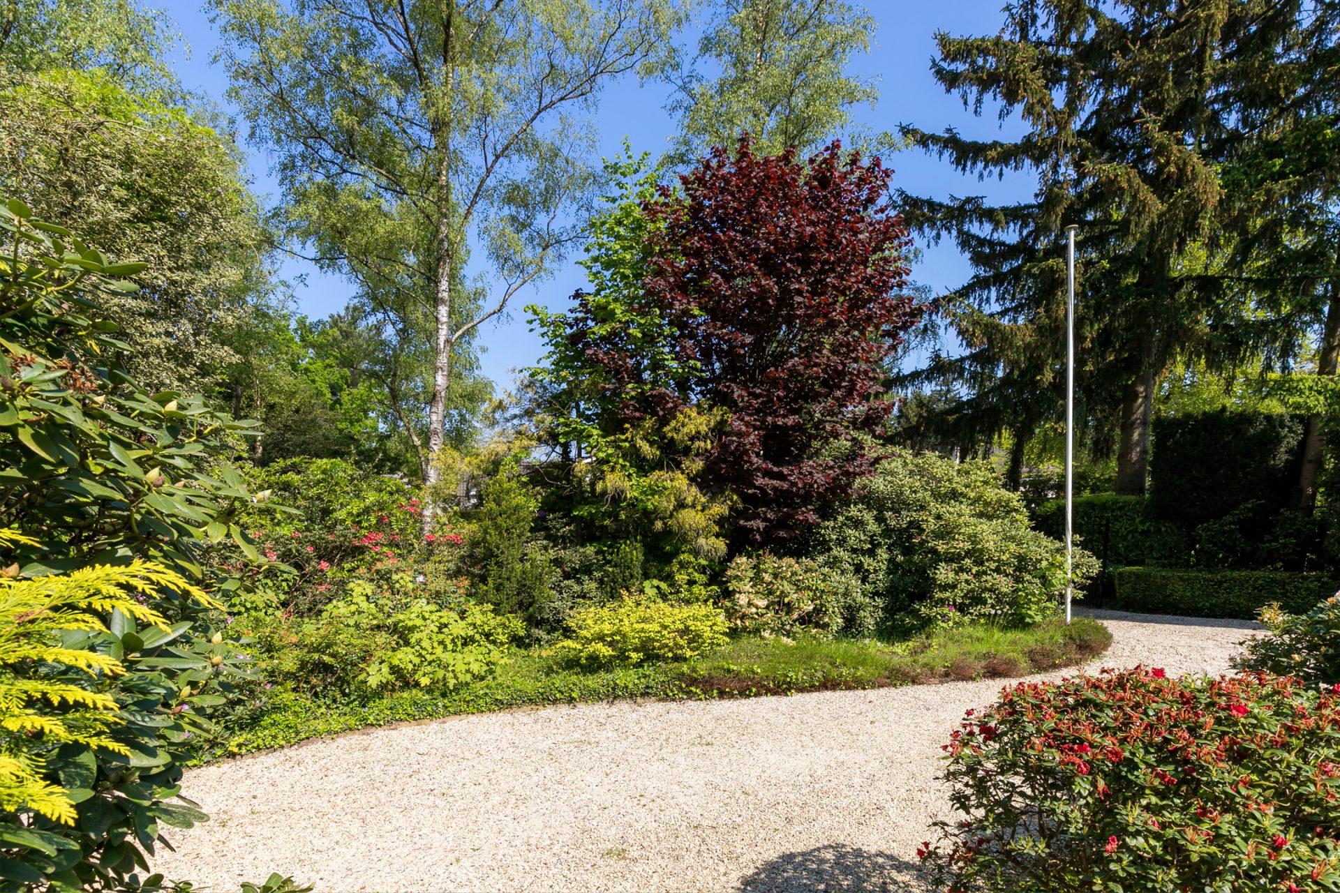 In de diepe achtertuin ervaar je, dankzij de hoge bomen en brede borders, optimale privacy en het gevoel dat je in een park woont. De grote terrassen hebben een uitstekende zonligging en de tuin is een perfecte speel- en ontspanningsplek voor kinderen. Aan een van de bomen hangen twee schommels, in de schaduw en met fraai uitzicht richting de villa. Dit is een droom voor jong en oud …