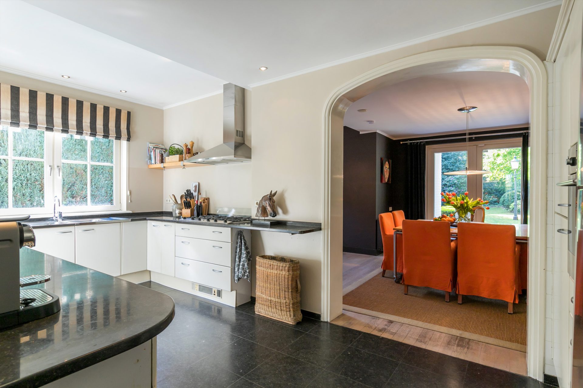 In het linkerdeel van de villa zijn de eetkamer en keuken gesitueerd. Zo kunt u kiezen om te dineren in de woonkamer of in de eetkamer, die in halfopen verbinding met de keuken staat. In de keuken, met dezelfde vloer als de hal, staat een U-opstelling met een hardstenen blad en aan de andere zijde biedt een hoge kastenwand veel bergruimte.
