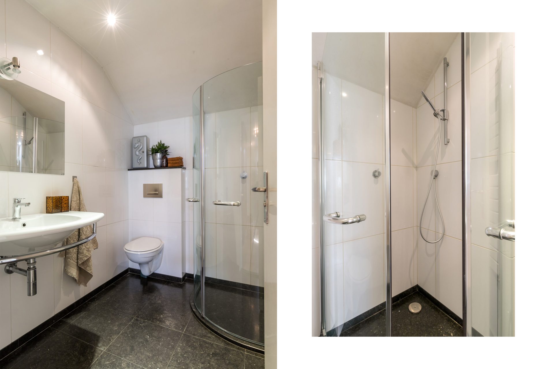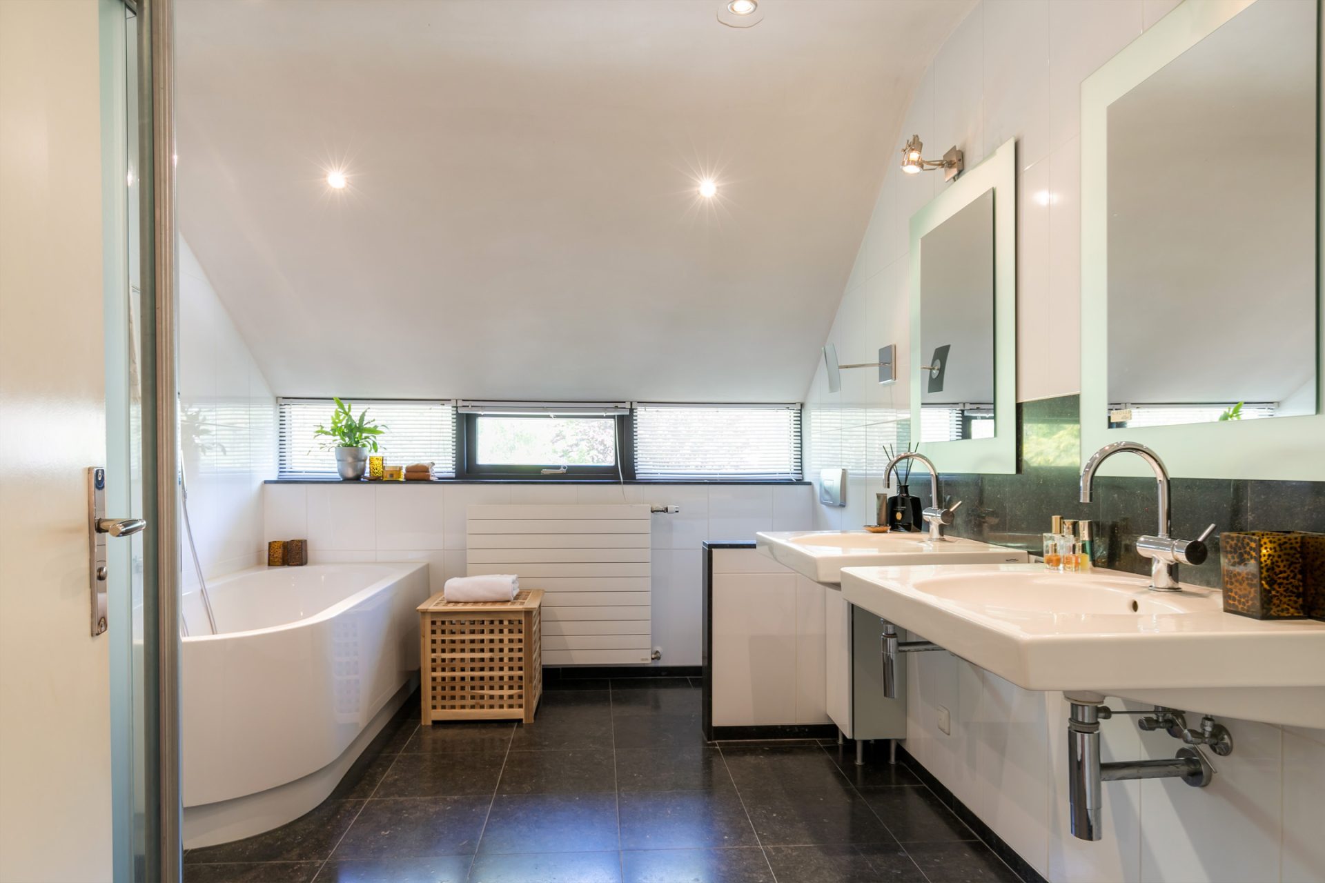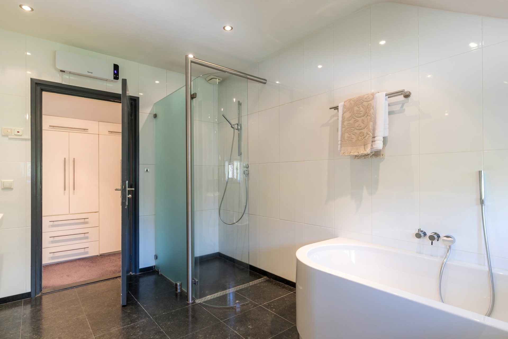 De eerste badkamer, te bereiken vanaf de overloop, is ingedeeld met een inloopdouche, toilet en wastafel. Vanuit de master bedroom loop je, via de walk in kleedruimte, naar de master badkamer met een ligbad, inloopdouche, toilet en twee fraai vormgegeven wastafels.