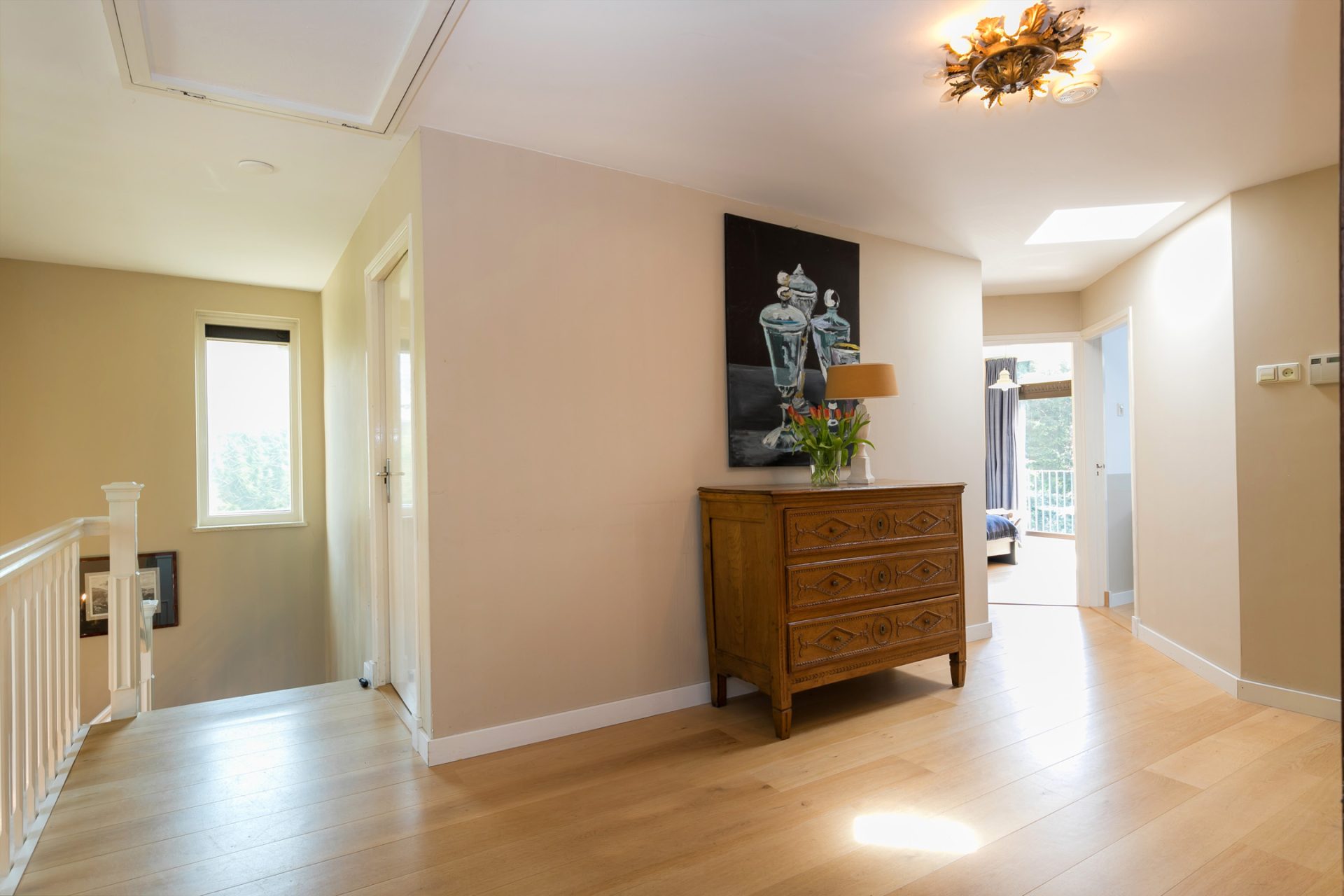 Via de bordestrap in de hal bereik je een ruime overloop waaraan maar liefst vijf slaapkamers en de eerste badkamer grenzen. Bijna alle slaapkamers zijn voorzien van inbouwkasten en op nagenoeg de hele verdieping ligt een mooie houten vloer. De drie slaapkamers aan de achterzijde hebben bovendien een schuifpui naar het balkon.