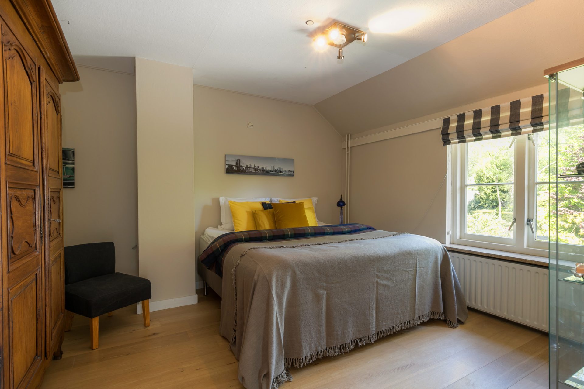 Boven de garage bevindt zich een appartement/gastenverblijf met een badkamer en twee ruime tweepersoons slaapkamers. Voor thuiswonende kinderen, eventueel (extra) thuiswerkplek, voor de au-pair of het laten overnachten van vrienden en familie is dit een perfecte ruimte met veel privacy en toch verbinding met de hoofdwoning.
