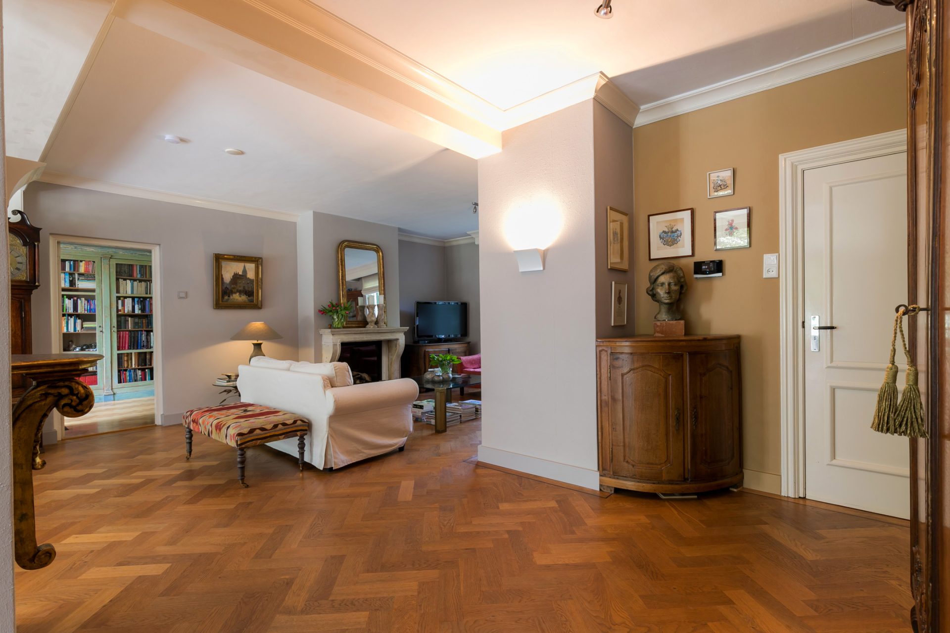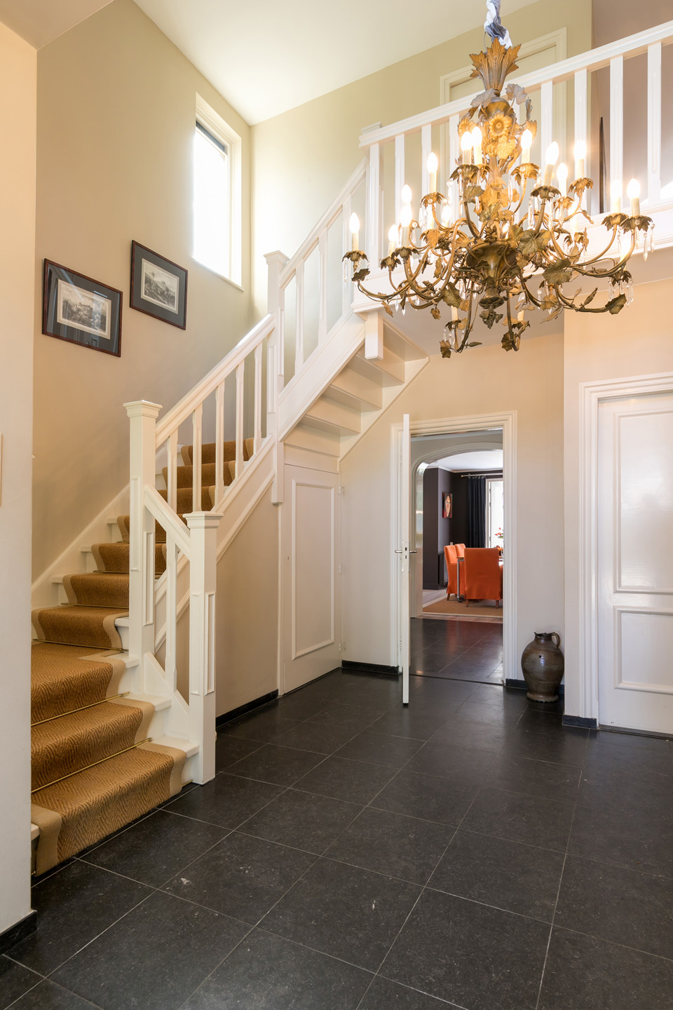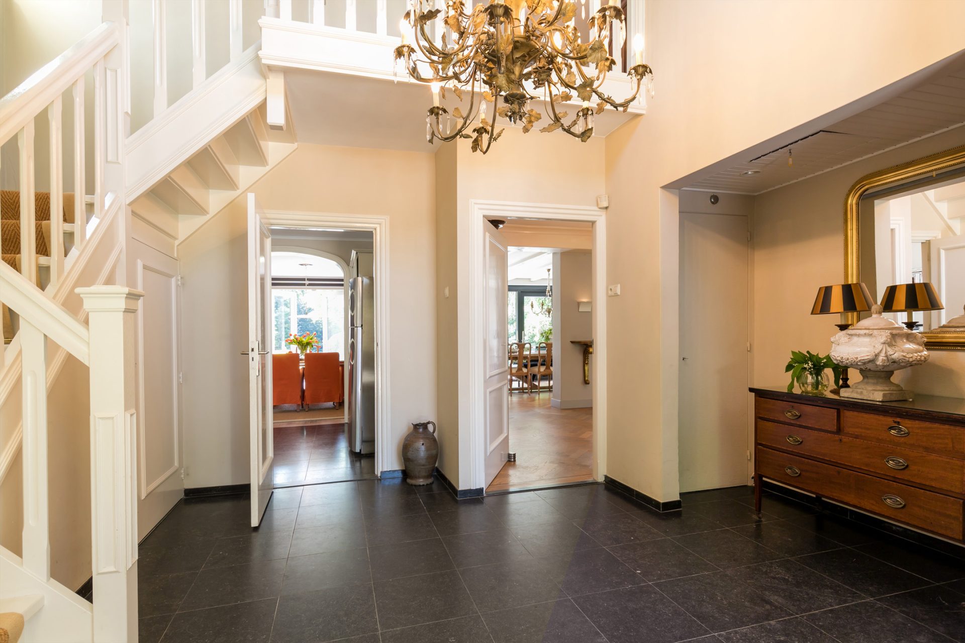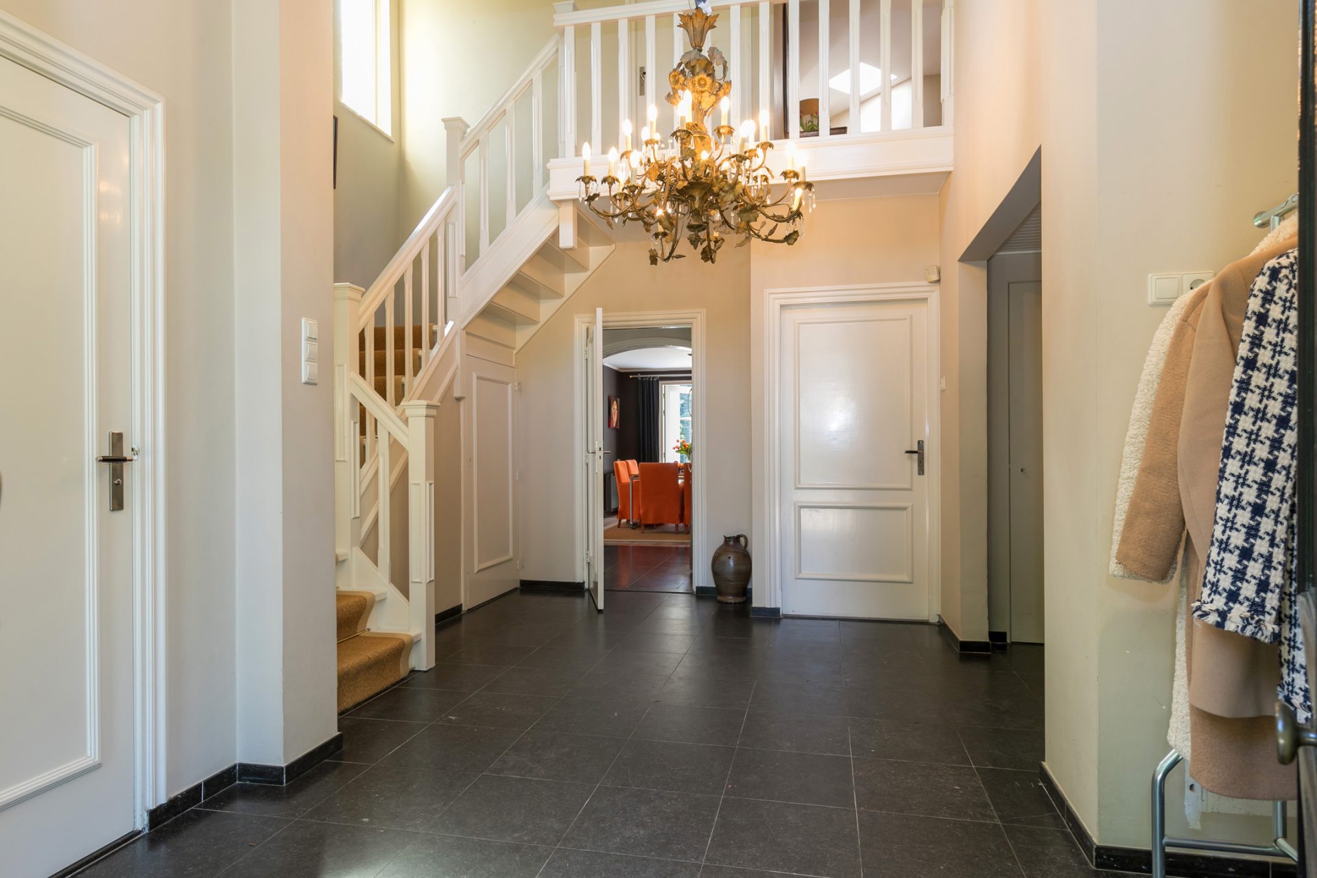 Het decor van de witte villa, de voortuin en de oprijlaan zorgen voor een onvergetelijke eerste kennismaking… De royale ontvangsthal met enorme kroonluchter en met vide is een imposante ruimte met een stijlvolle bordestrap en een antracietkleurige hardstenen tegelvloer. Links in de hal is het gastentoilet en aan de rechterzijde bevindt zich de garderobe.