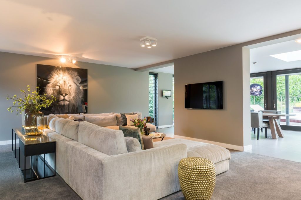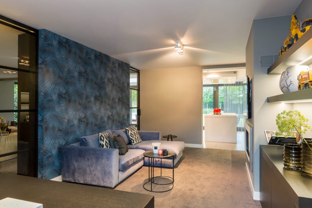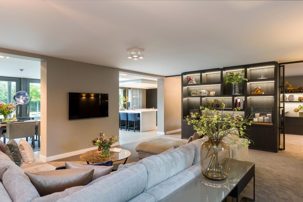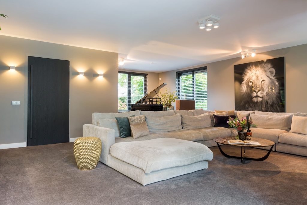 De U-vormige woonkamer is de perfecte leefruimte voor een gezin, waar ook ruimte is om vanuit huis te werken. De op maat gemaakte kastenwand met schuifdeuren vormt de scheiding tussen de zitkamer en de werkkamer, waar een deel van de ruimte is ingericht als tweede zitkamer. Aan de linker voorzijde is de plek waar de klanken van de piano de woonkamer vullen. Dit is een huis met stijl, klasse en grote ramen waardoor veel licht naar binnen valt.