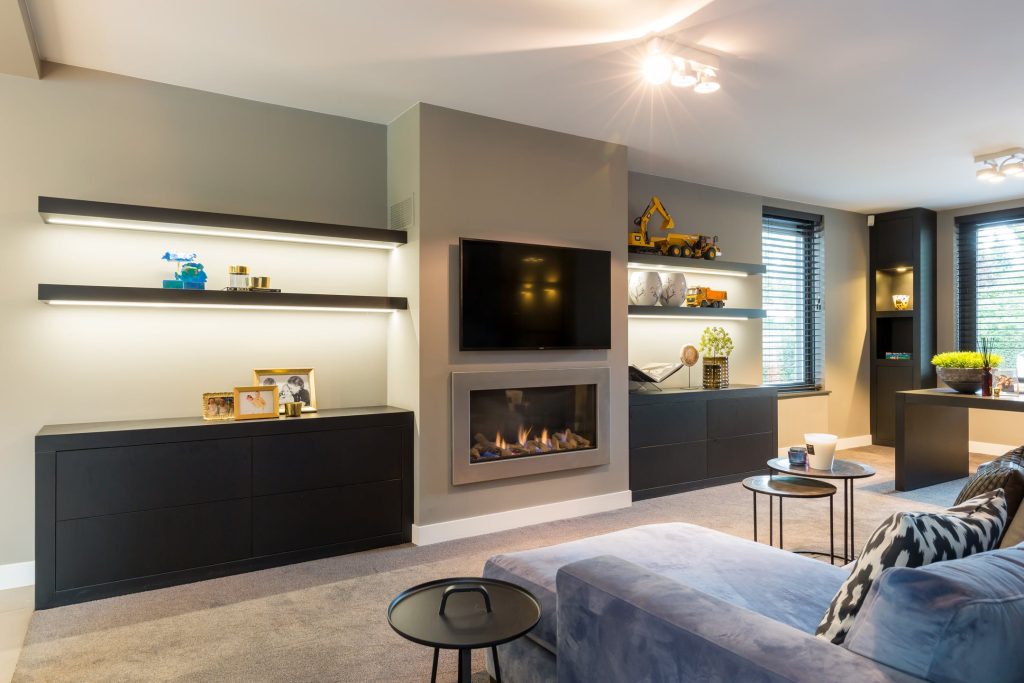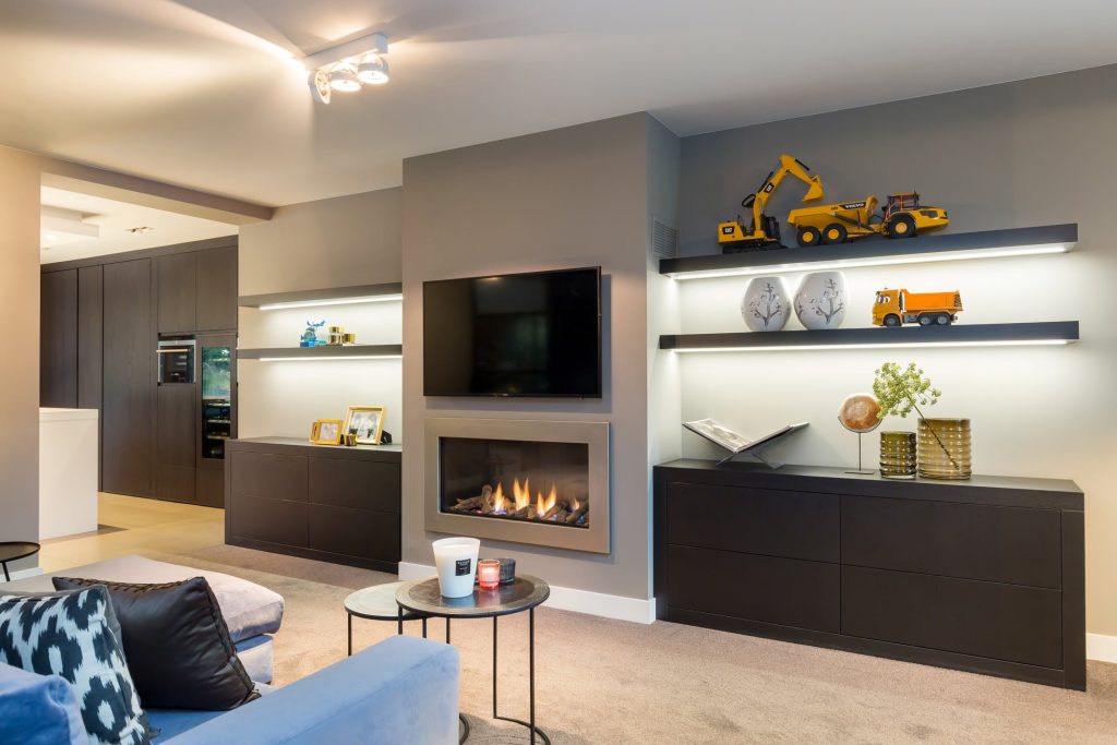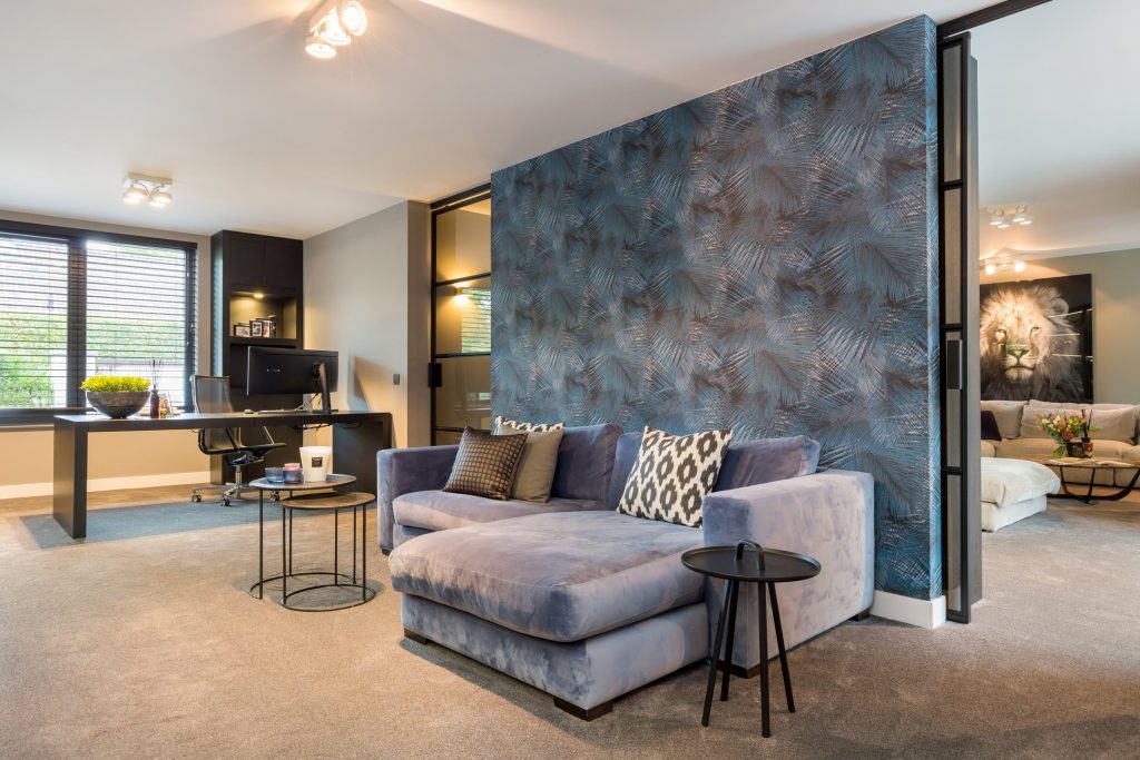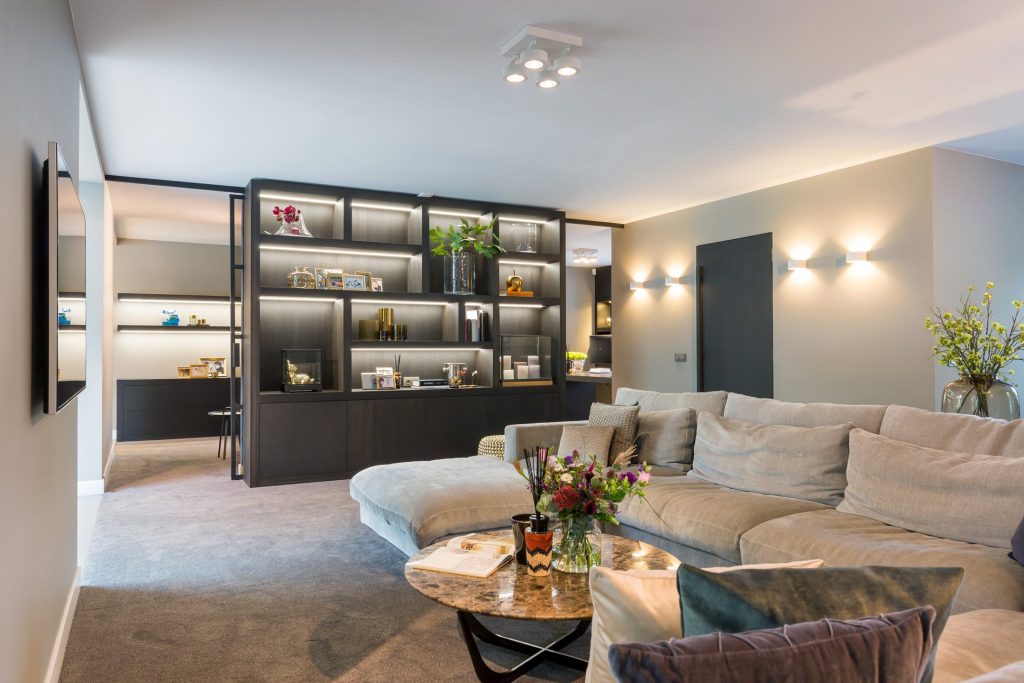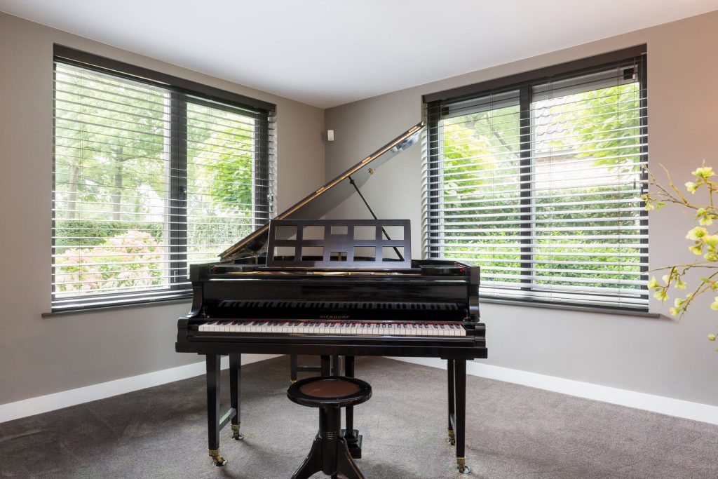De U-vormige woonkamer is de perfecte leefruimte voor een gezin, waar ook ruimte is om vanuit huis te werken. De op maat gemaakte kastenwand met schuifdeuren vormt de scheiding tussen de zitkamer en de werkkamer, waar een deel van de ruimte is ingericht als tweede zitkamer. Aan de linker voorzijde is de plek waar de klanken van de piano de woonkamer vullen. Dit is een huis met stijl, klasse en grote ramen waardoor veel licht naar binnen valt.