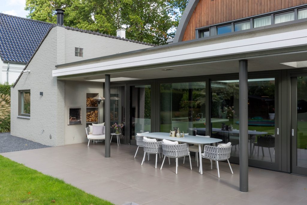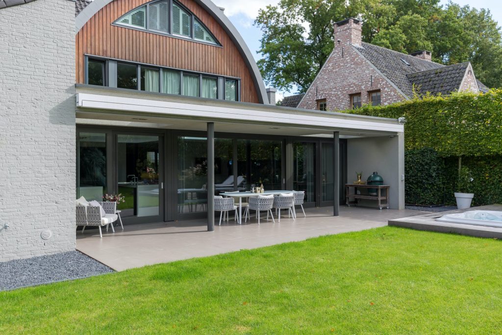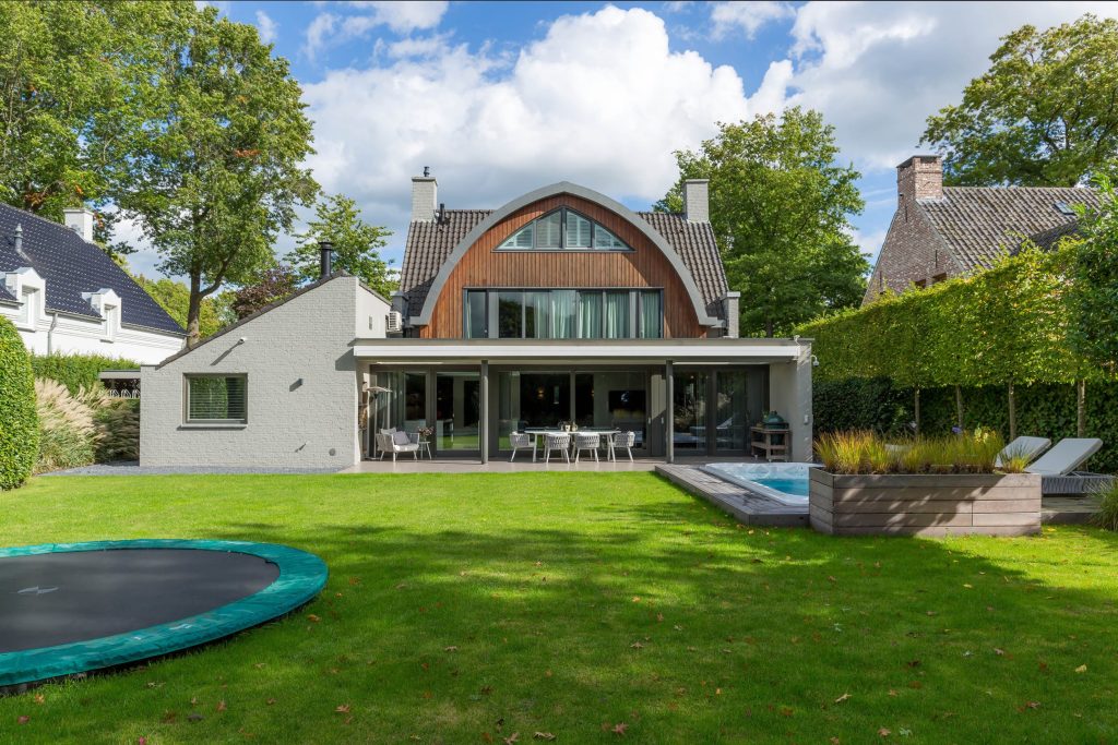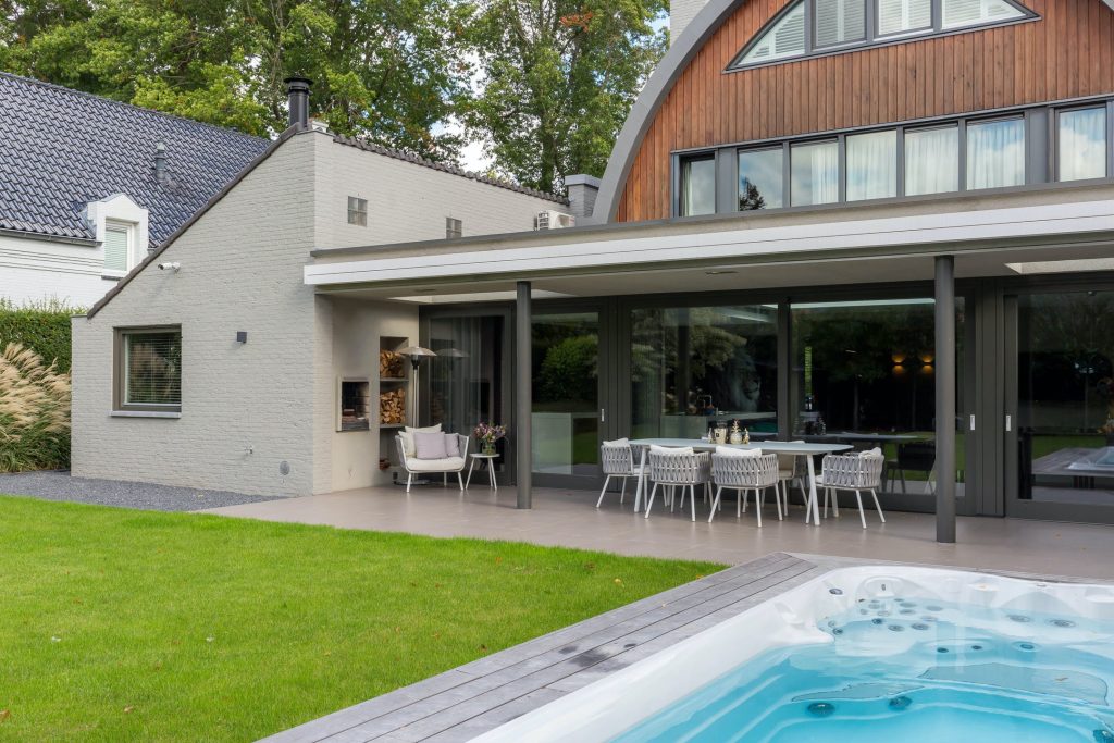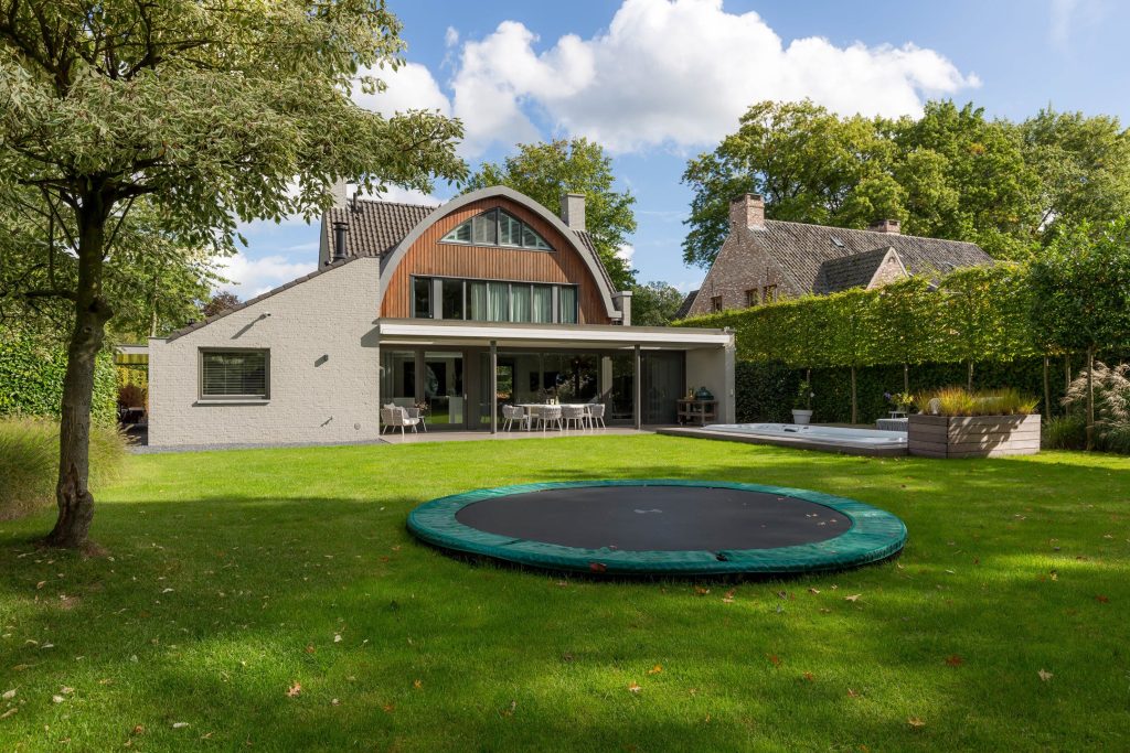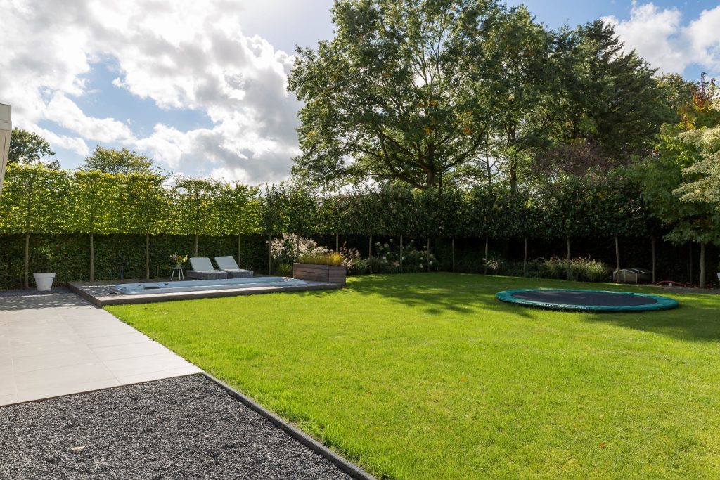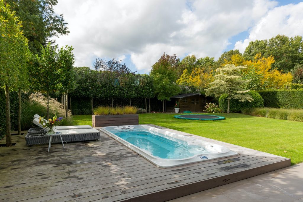 In de achtertuin ziet u een groot gazon met ingegraven trampoline, leibomen en diverse beplanting in de borders. Direct achter de villa is een groot, overdekt terras met buitenhaard en het buitenzwembad met jetstream nodigt uit om baantjes te trekken.