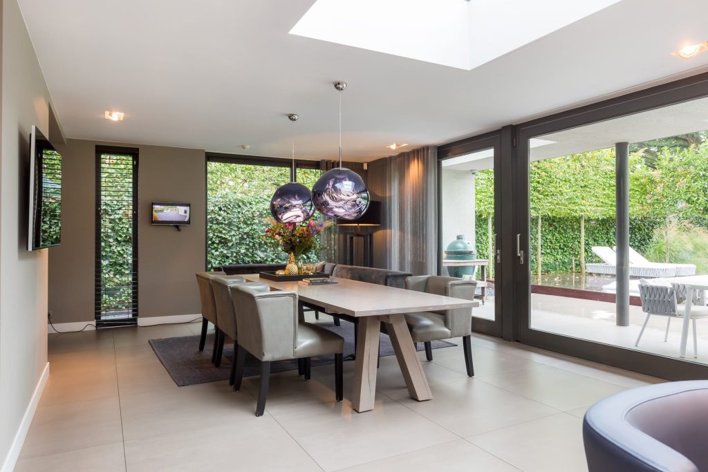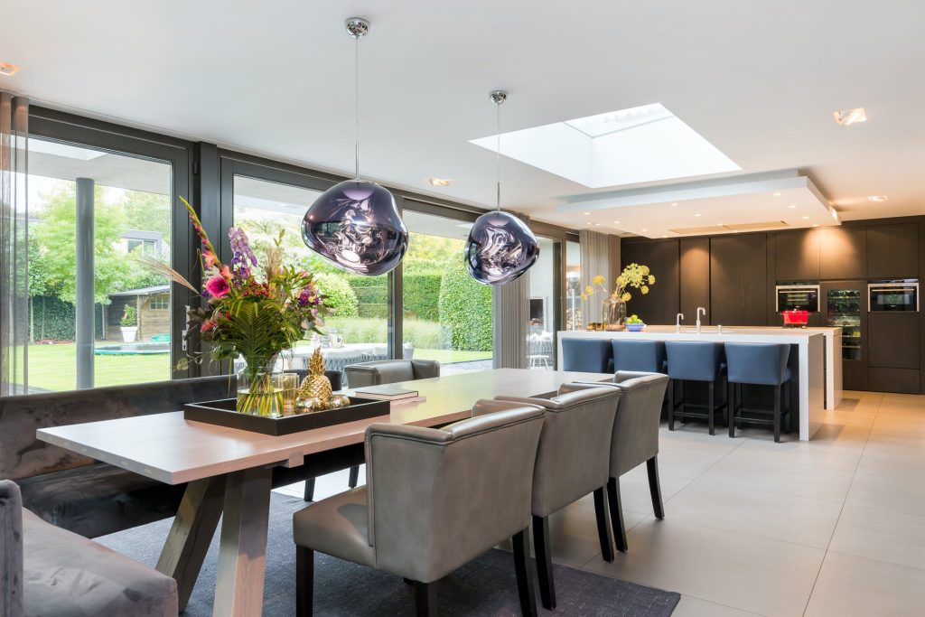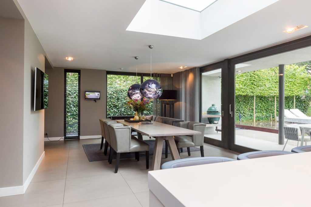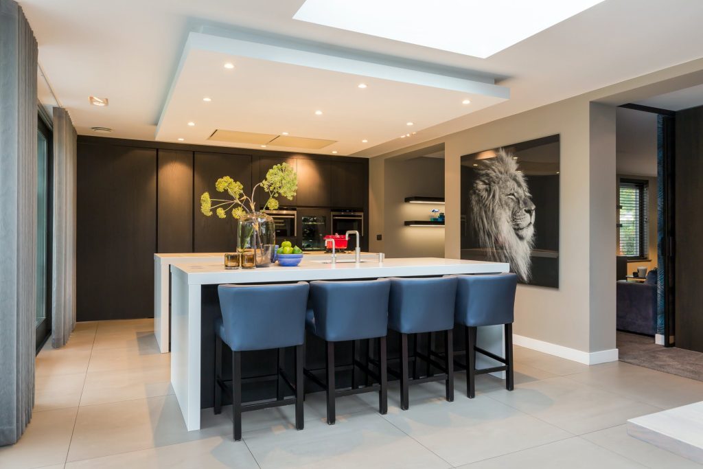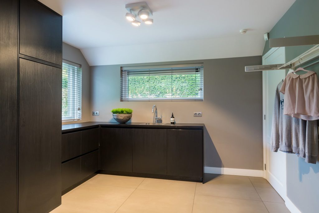 De indrukwekkende woonkeuken van meer dan 10 meter breed is een plek waar een groot deel van het gezinsleven plaatsvindt. Grote ramen en maar liefst drie schuifpuien zorgen voor een prachtig uitzicht naar de tuin. Tussen de keuken en de eettafel valt uw oog op de grote lichtkoepel en op de vloer liggen dezelfde tegels als in de hal. De op maat gemaakte keukenopstelling bestaat uit een apparatenwand, spoeleiland en een kookeiland met ABK inductievelden. Achter de hoge, zwarte deuren zijn de bijkeuken en de trap naar de kelder gesitueerd. De bijkeuken heeft een op maat gemaakte keukenopstelling met veel bergruimte, plek voor de wasapparatuur en een deur naar de garage.