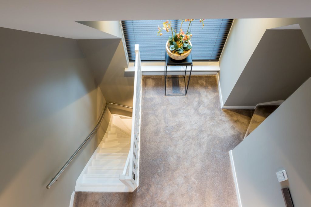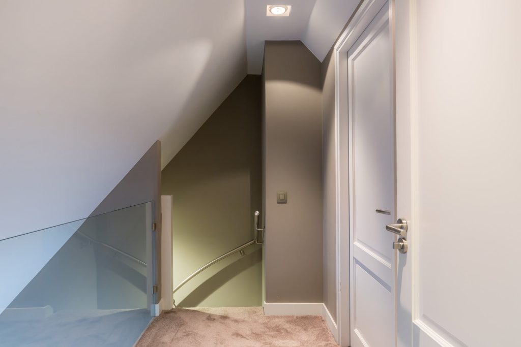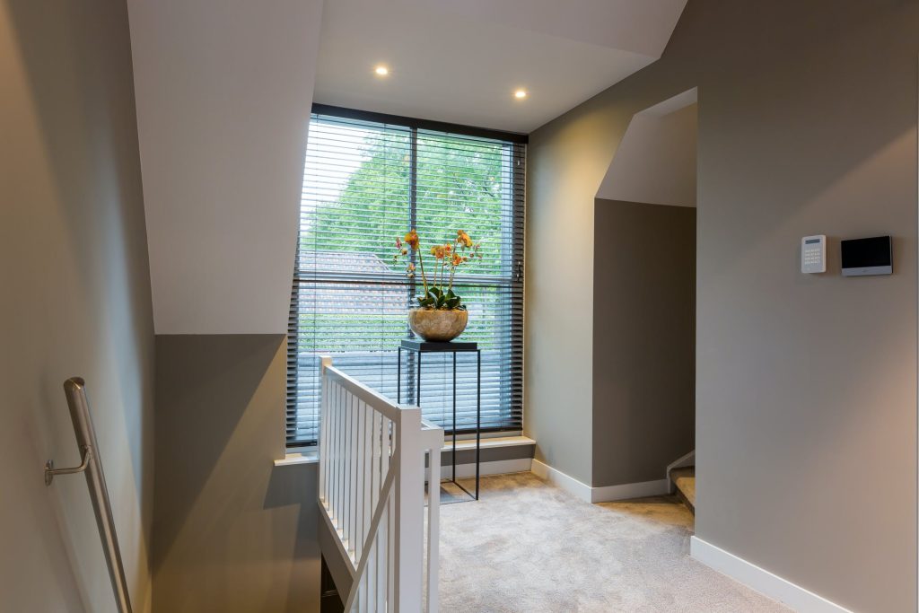 Via de prachtige trapopgang komt u op de overloop, waar het grote raam aan de voorzijde en de glazen balustrade van de tweede verdieping uw aandacht trekken. U ziet de trap naar de tweede verdieping en de witte paneeldeuren die toegang geven tot de slaapkamers en de toiletruimte.