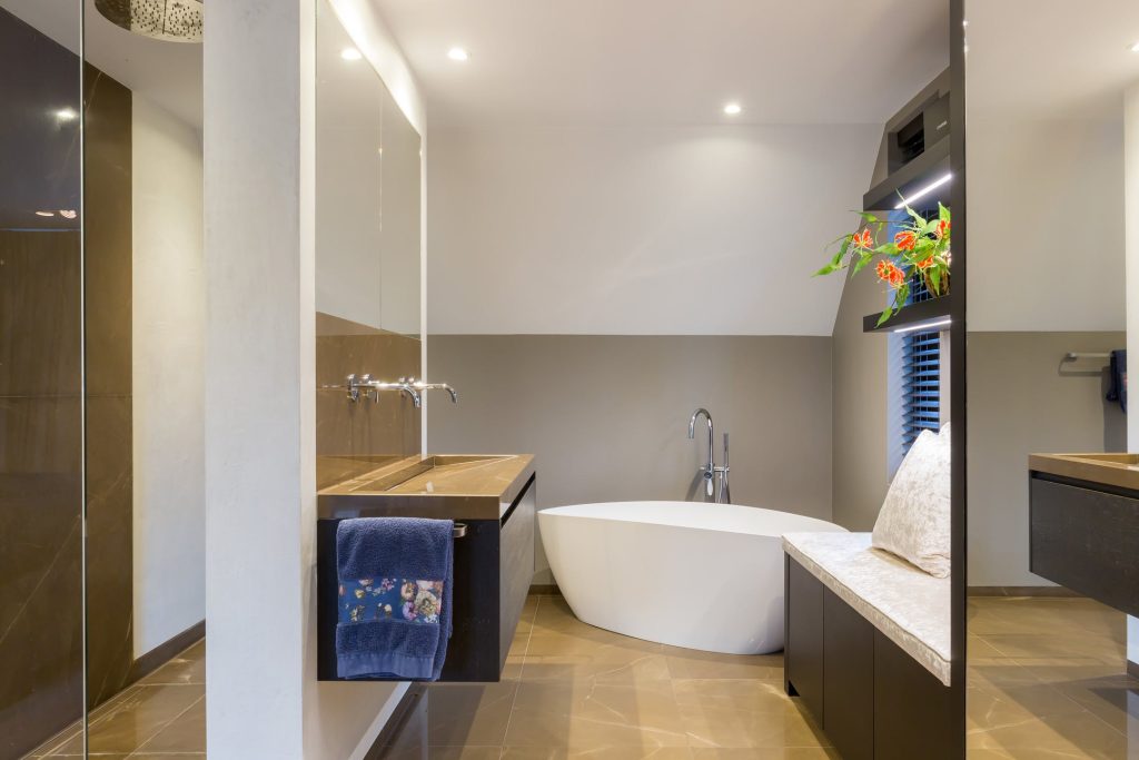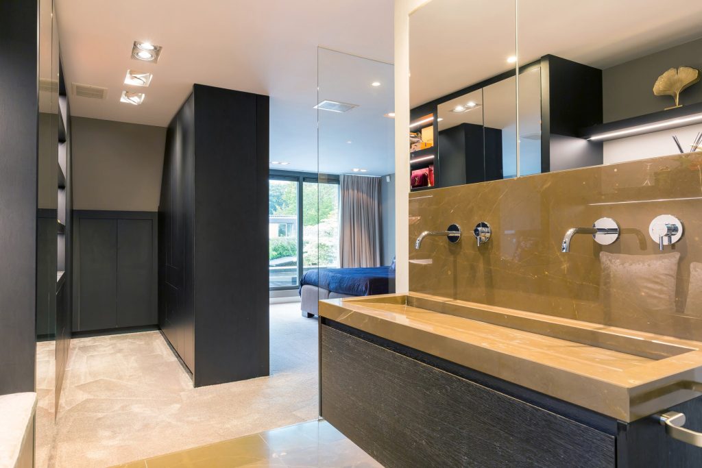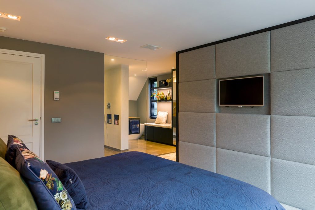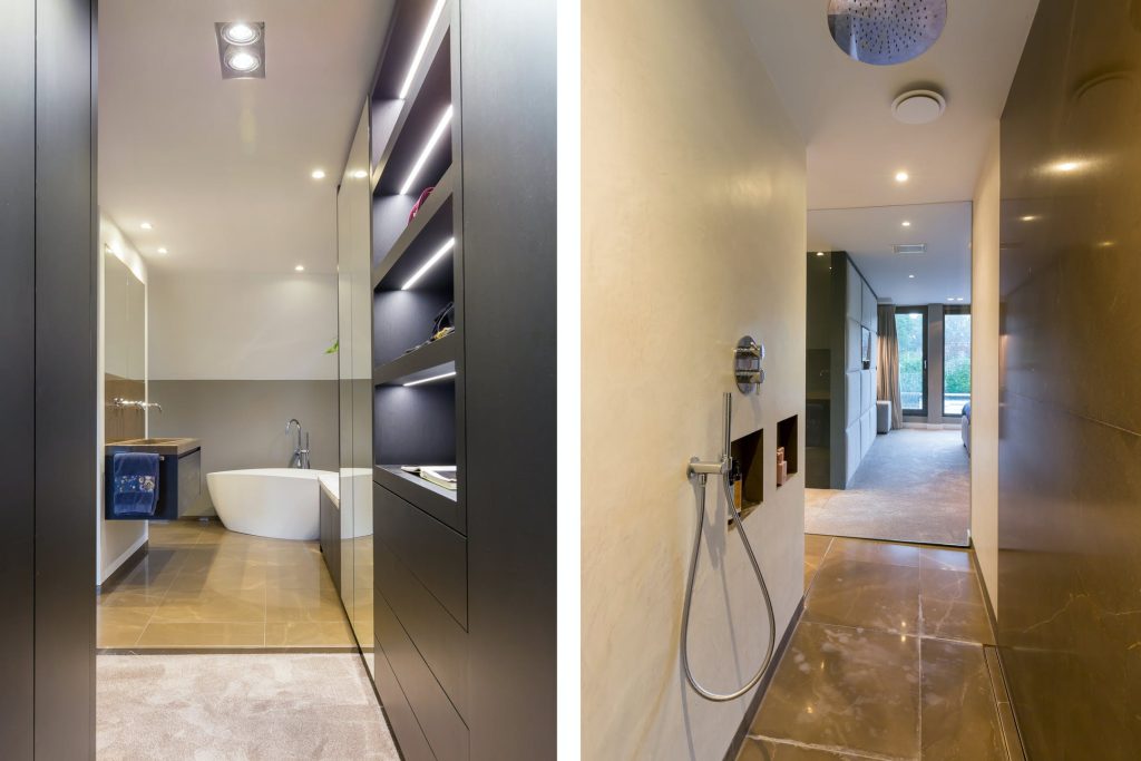 De masterbedroom is een uiterst stijlvolle ruimte met een mooie verdeling tussen het slaapgedeelte en de op maat gemaakte inloopkast. Het zachte tapijt, de grote ramen, sfeervolle kleuren en de en-suite verbinding met de badkamer zorgen voor een plek om volledig tot rust te komen. Er is meer dan genoeg leg- en hangruimte voor uw kleding en in de zeer luxe badkamer ziet u onder andere een vrijstaand bad, een dubbele wastafel van marmer en een zeer ruime regendouche.