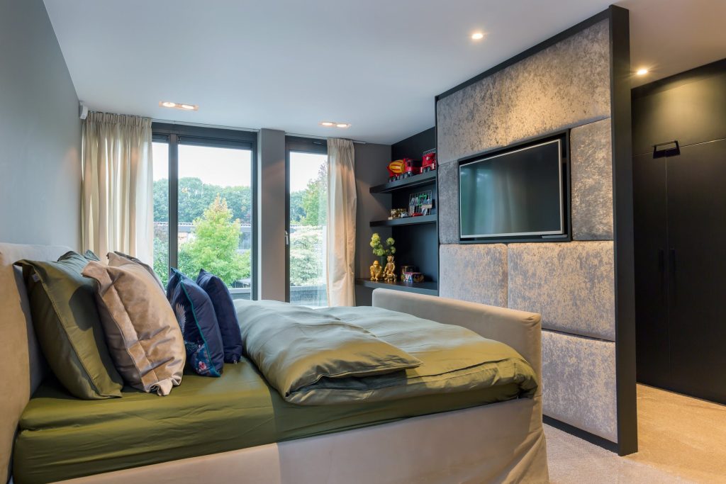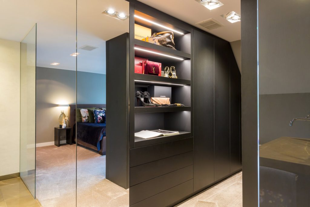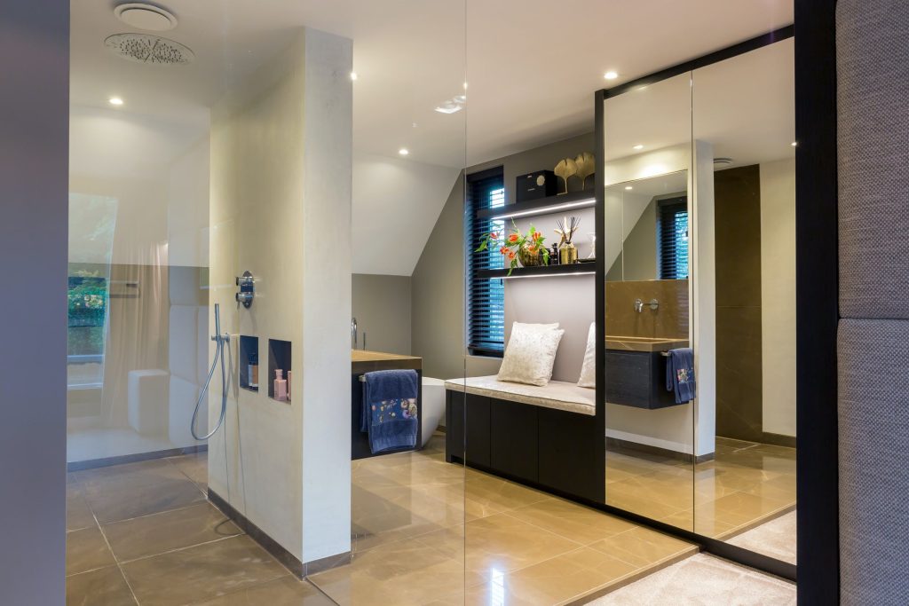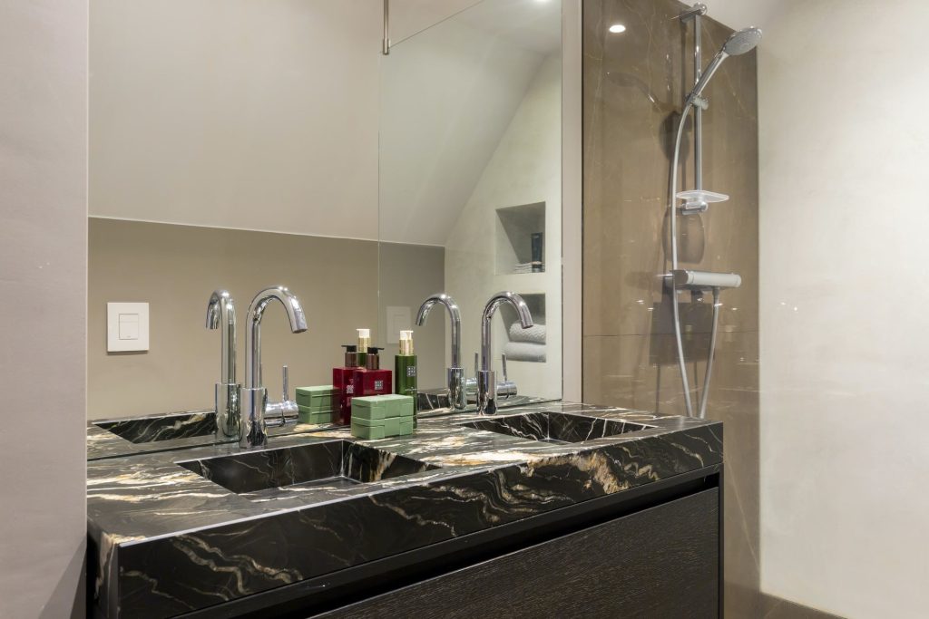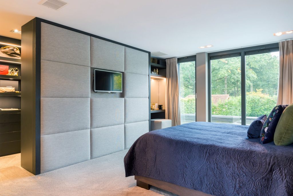 De masterbedroom is een uiterst stijlvolle ruimte met een mooie verdeling tussen het slaapgedeelte en de op maat gemaakte inloopkast. Het zachte tapijt, de grote ramen, sfeervolle kleuren en de en-suite verbinding met de badkamer zorgen voor een plek om volledig tot rust te komen. Er is meer dan genoeg leg- en hangruimte voor uw kleding en in de zeer luxe badkamer ziet u onder andere een vrijstaand bad, een dubbele wastafel van marmer en een zeer ruime regendouche.
