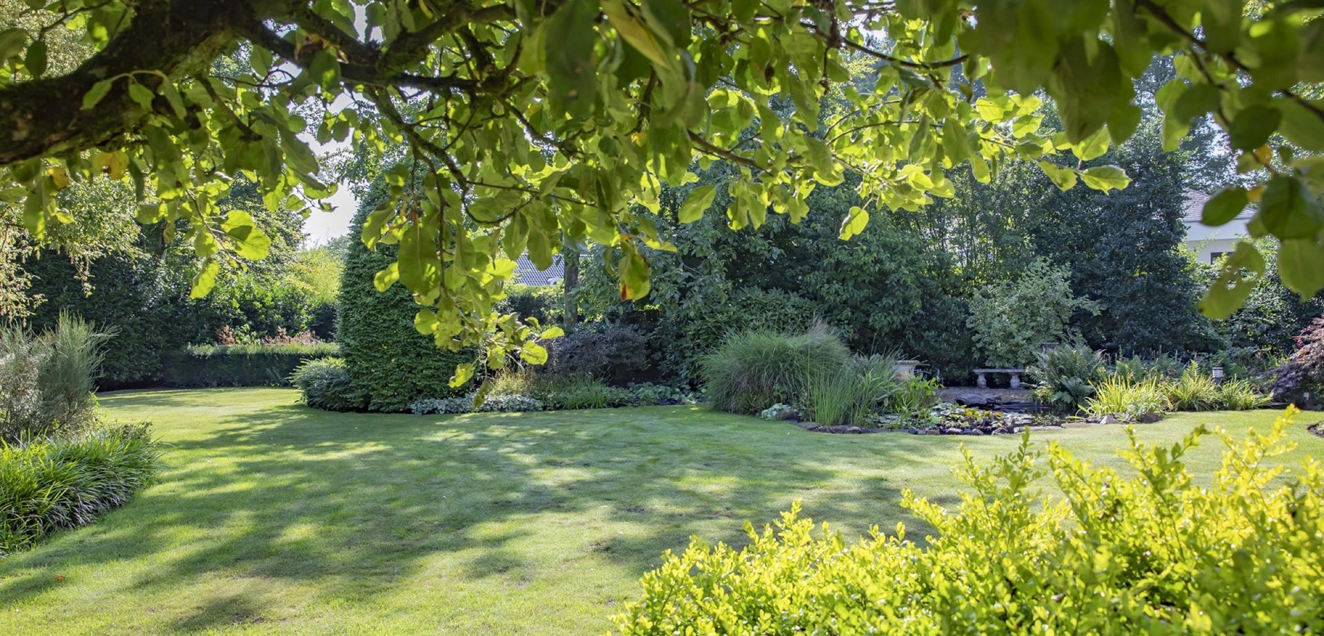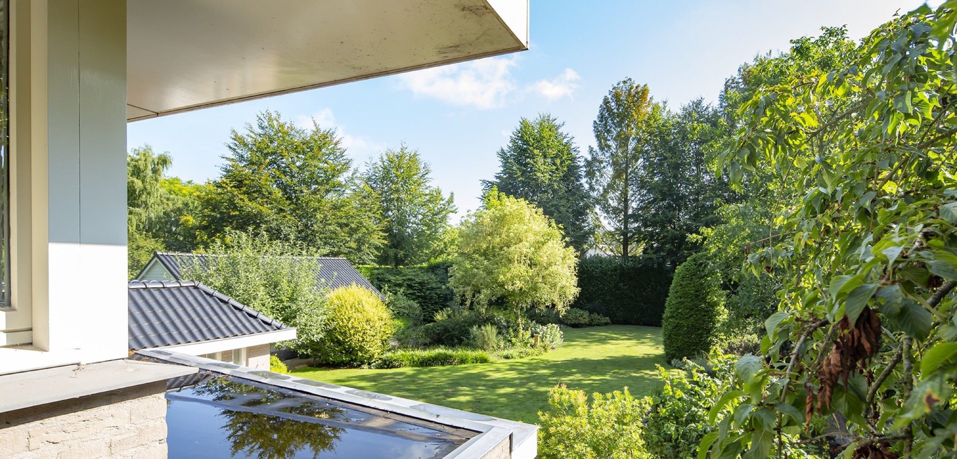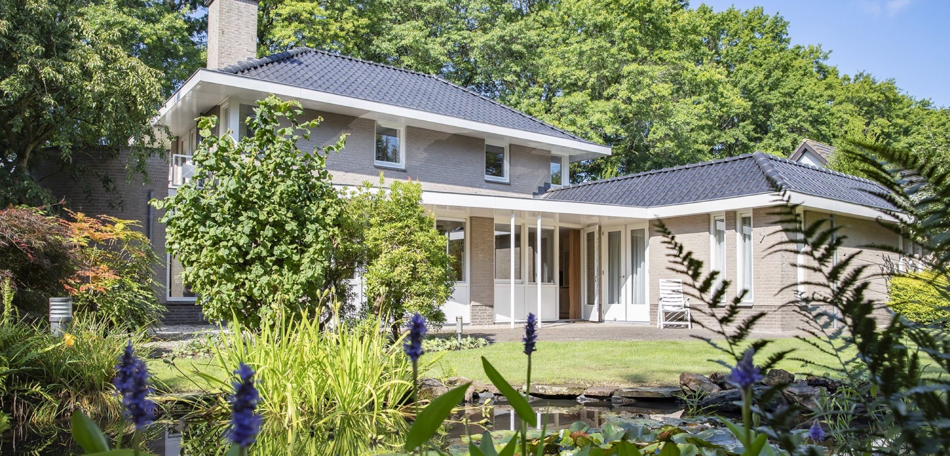 De prachtige tuin heeft een goed onderhouden gazon met een grote vijver en een grote variatie aan bloemen, struiken en bomen. Direct achter de woonkamer ligt het deels overdekte terras en bij de vijver ligt een tweede terras vanwaar het uitzicht op de tuin en de villa formidabel is.