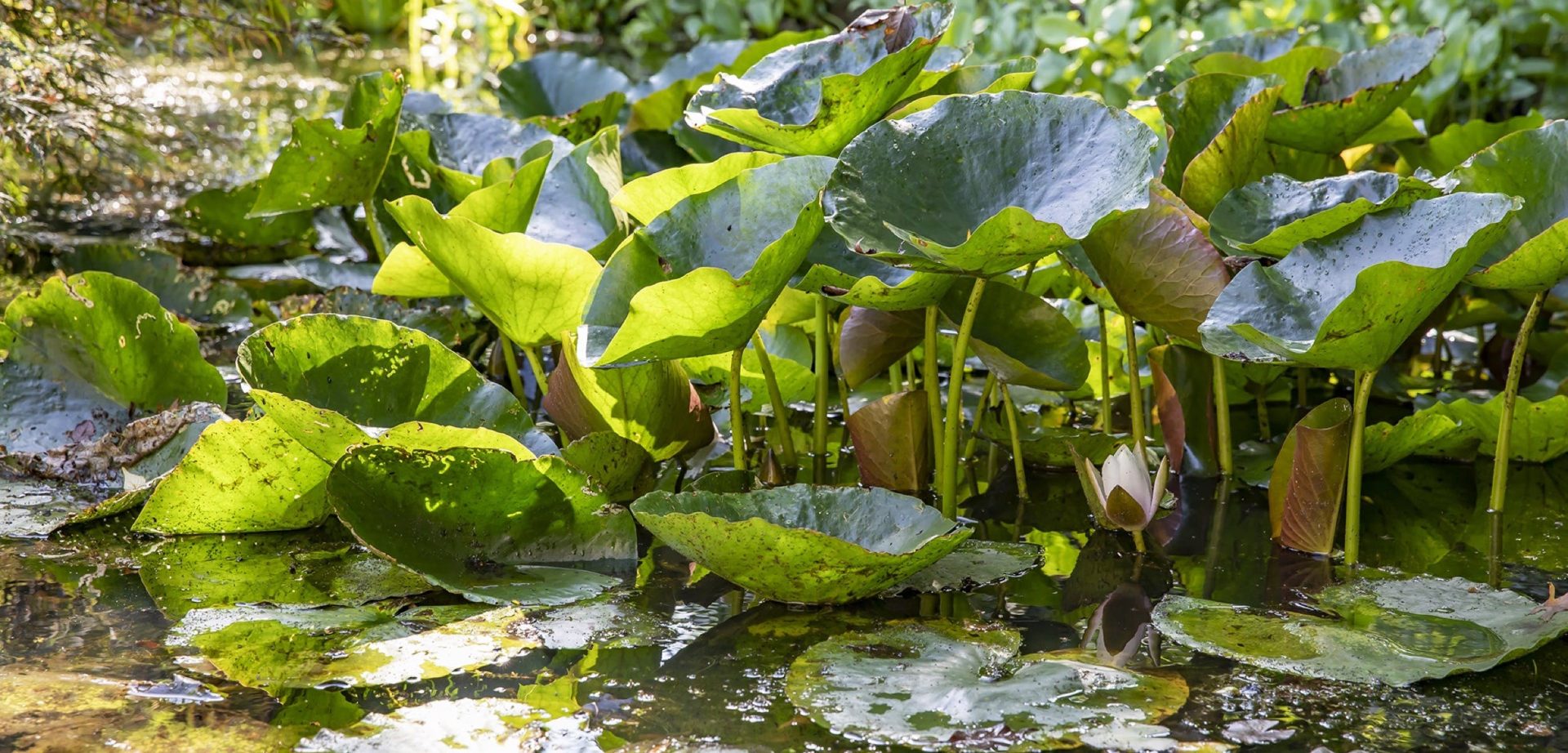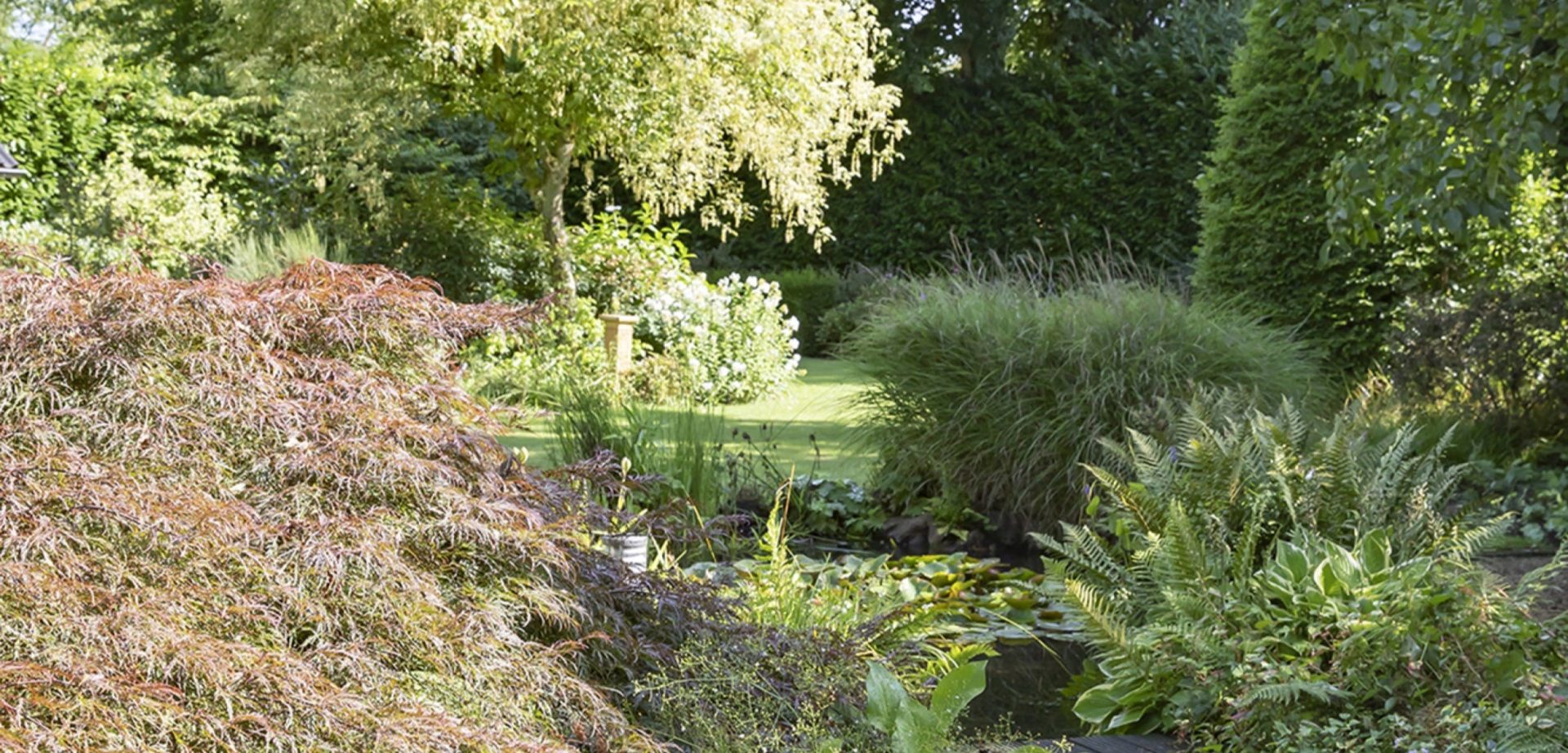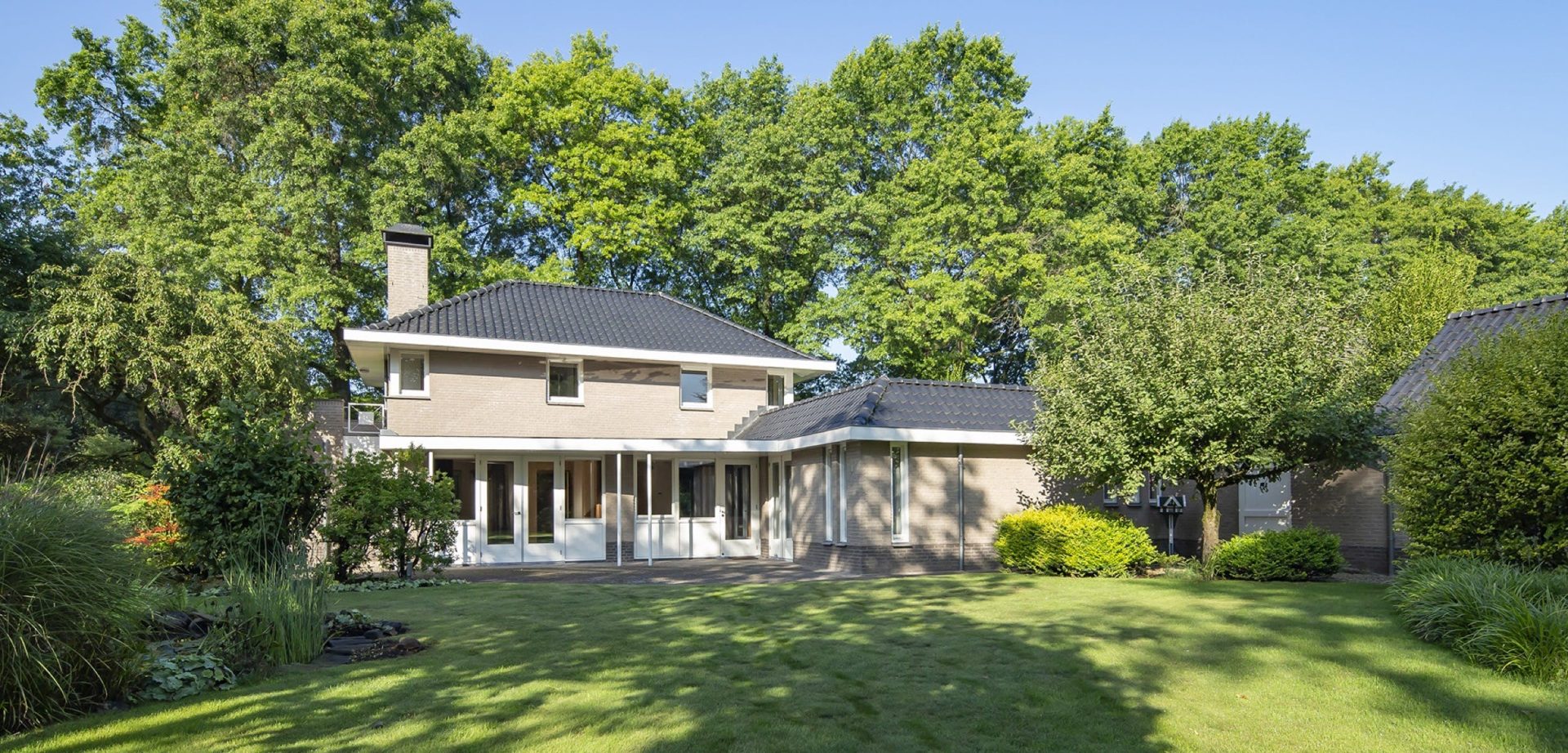 De prachtige tuin heeft een goed onderhouden gazon met een grote vijver en een grote variatie aan bloemen, struiken en bomen. Direct achter de woonkamer ligt het deels overdekte terras en bij de vijver ligt een tweede terras vanwaar het uitzicht op de tuin en de villa formidabel is.