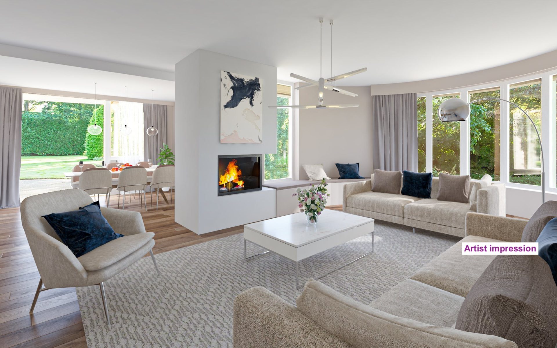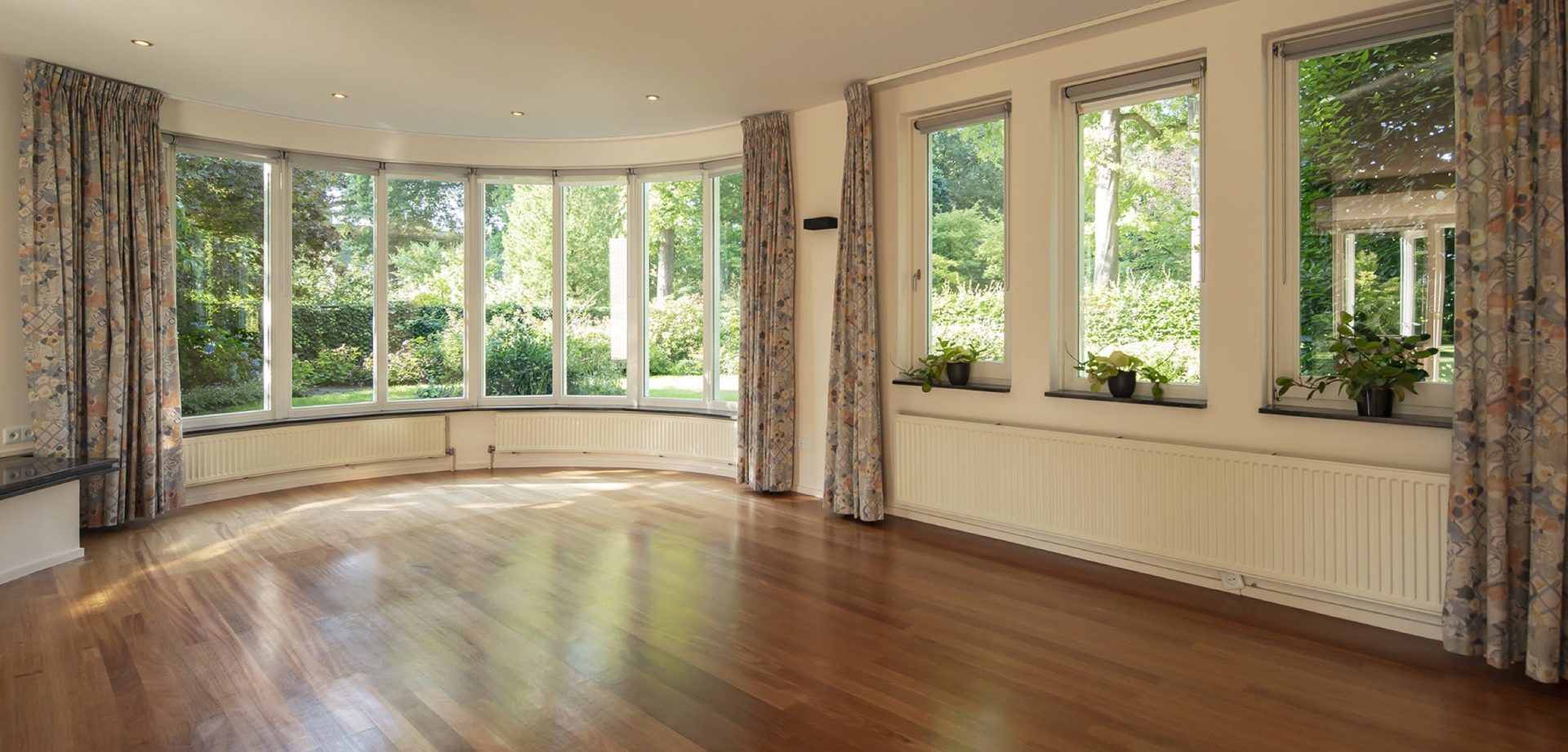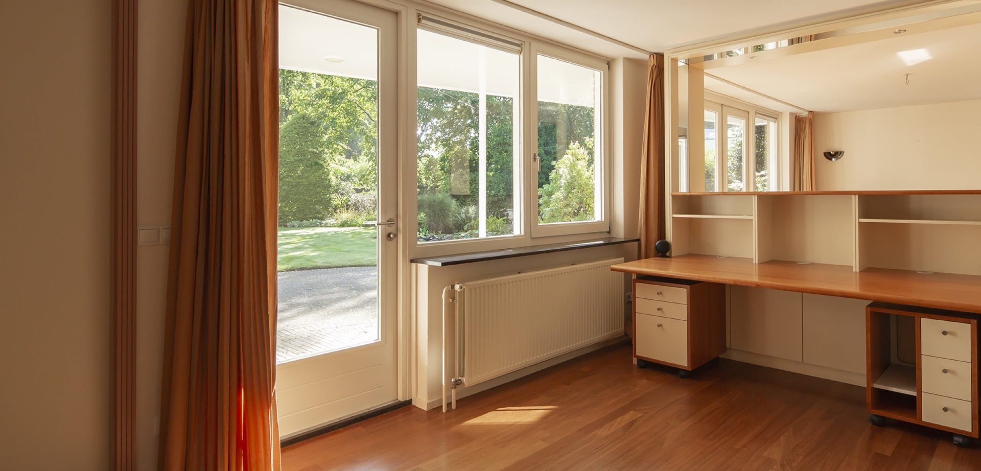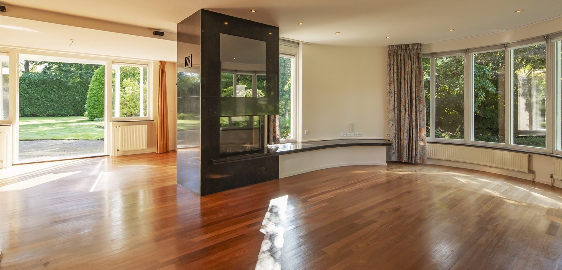 De woonkamer heeft een kenmerkende halfronde erker met grote ramen aan de zuidoostzijde. Dit is de plek van de zitkamer waar je kunt genieten van een boek met een glas wijn bij een knapperend haardvuur. De eetkamer heeft een mooie verbinding met de tuin dankzij de openslaande tuindeuren. Tussen de eetkamer en de keuken ligt de werkkamer, een fijne plek met uitzicht op de tuin.