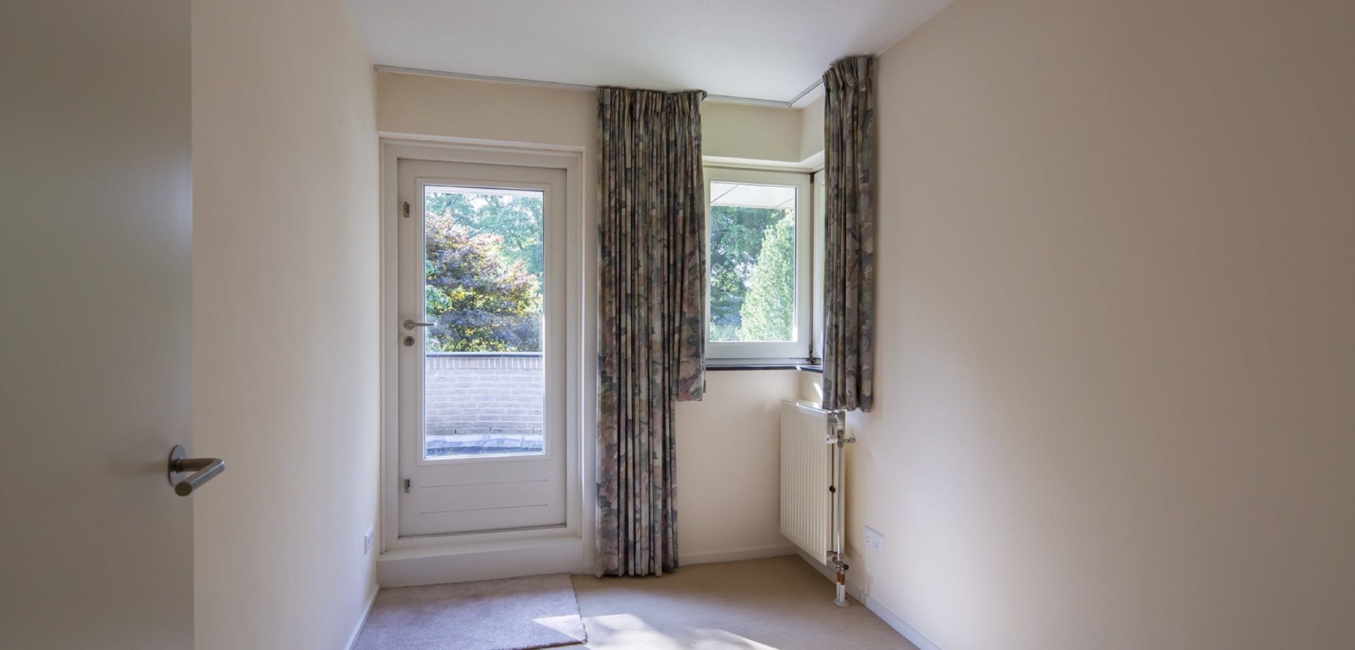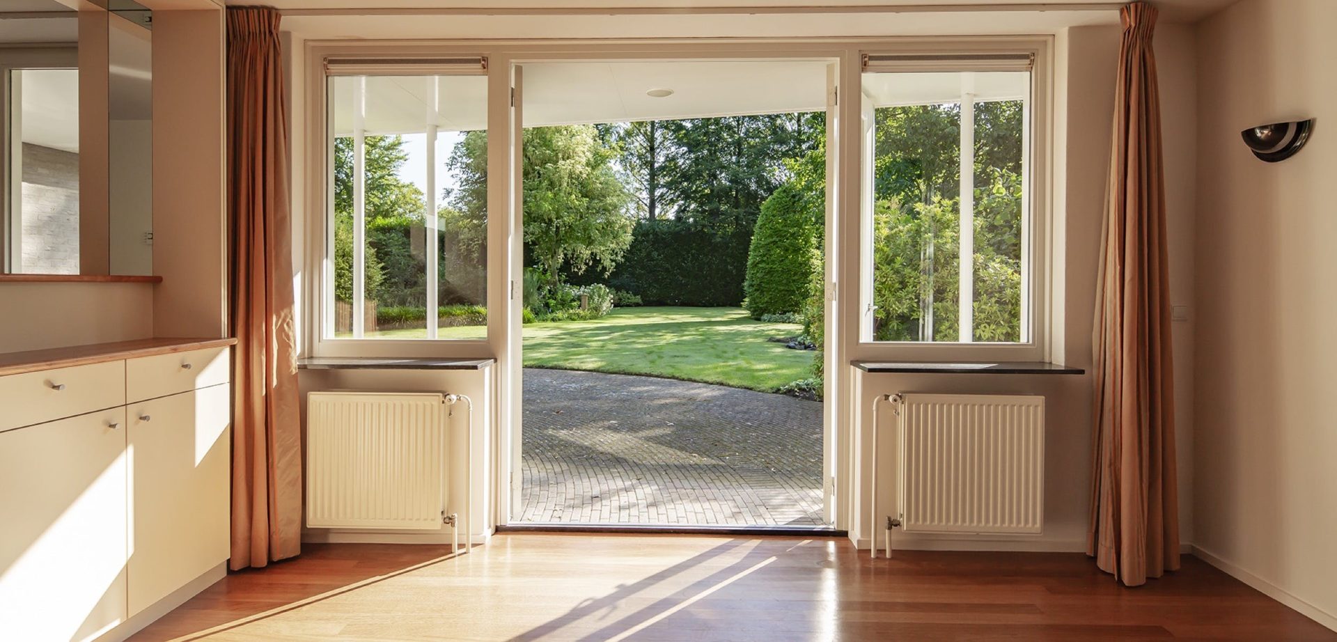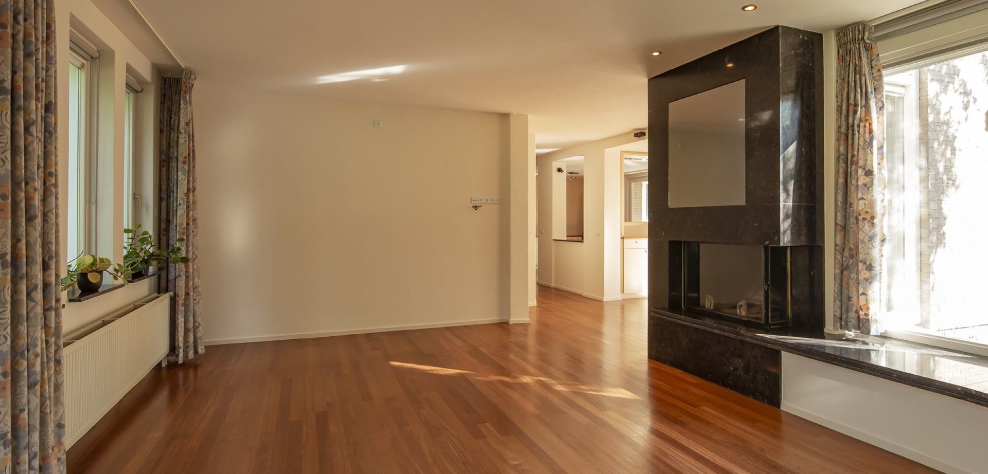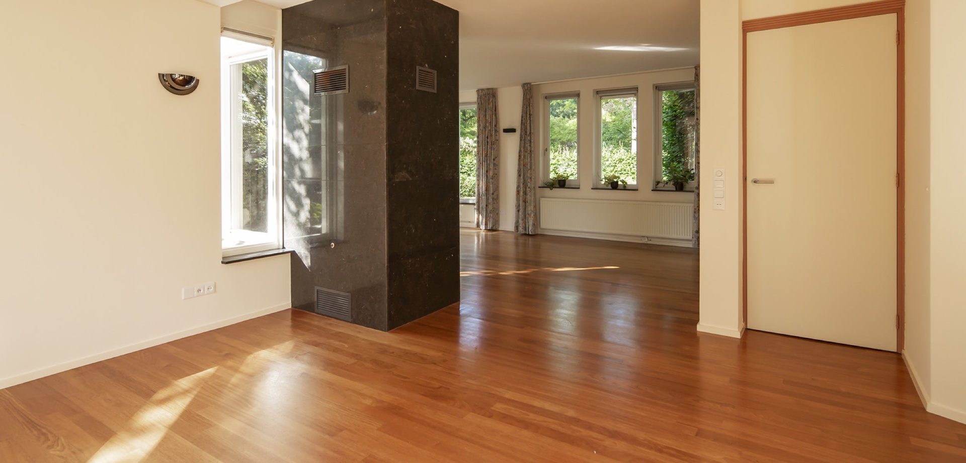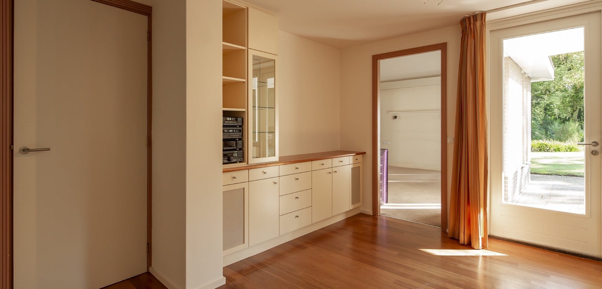 De woonkamer heeft een kenmerkende halfronde erker met grote ramen aan de zuidoostzijde. Dit is de plek van de zitkamer waar je kunt genieten van een boek met een glas wijn bij een knapperend haardvuur. De eetkamer heeft een mooie verbinding met de tuin dankzij de openslaande tuindeuren. Tussen de eetkamer en de keuken ligt de werkkamer, een fijne plek met uitzicht op de tuin.