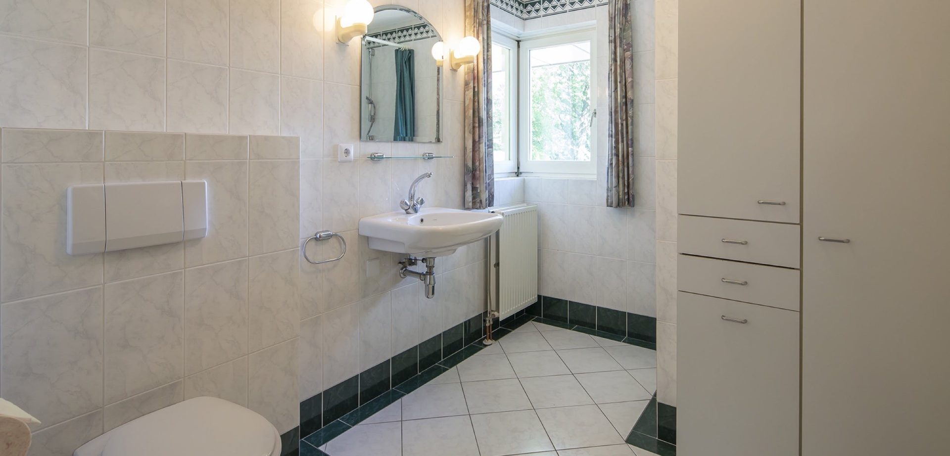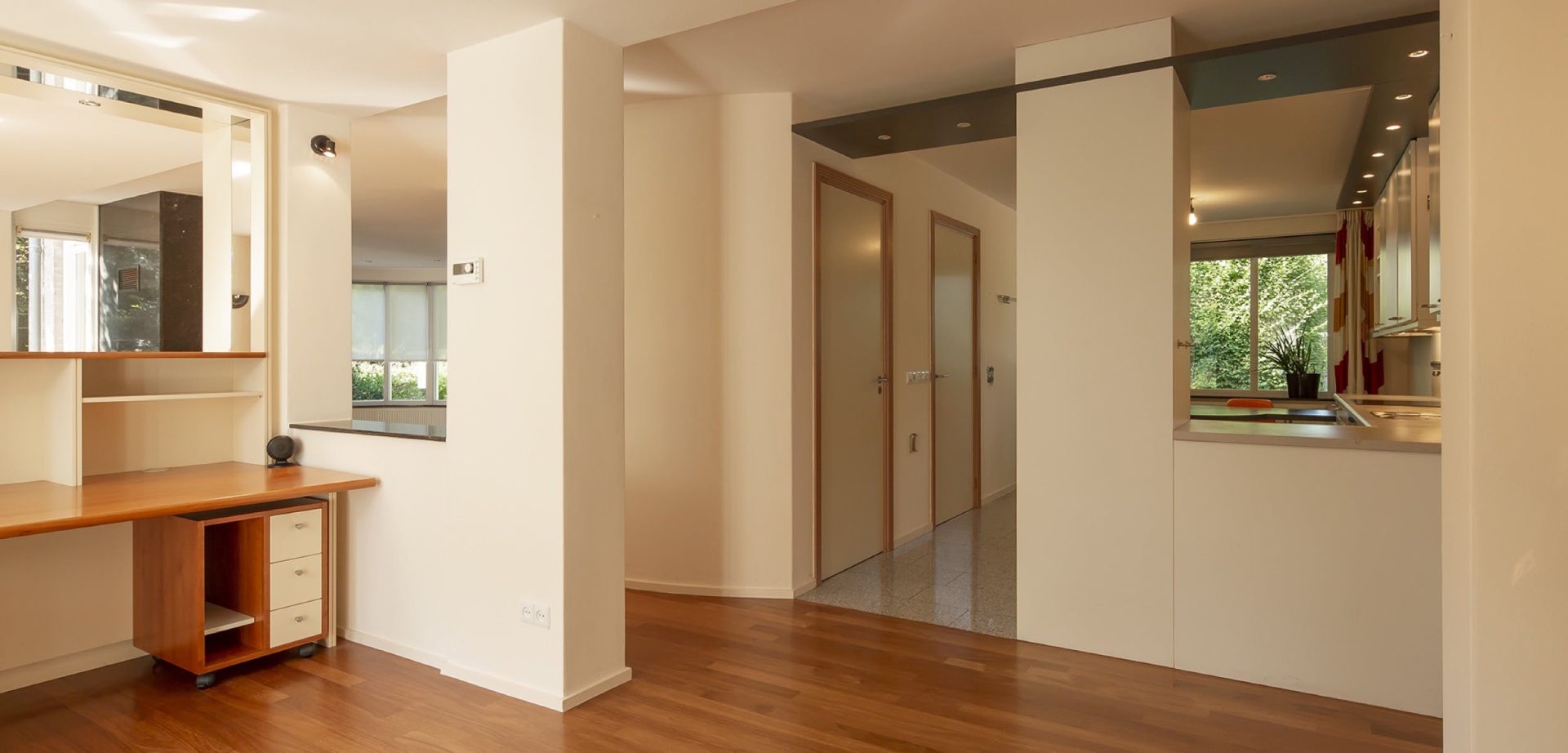 Gelijkvloers wonen is heel goed mogelijk dankzij de ruime slaap- en badkamer aan de tuinzijde. De slaapkamer heeft openslaande deuren naar een overdekte terras en de badkamer is ingedeeld met een ligbad, aparte douche, bidet en wastafel. Het toilet is apart direct naast de badkamer.