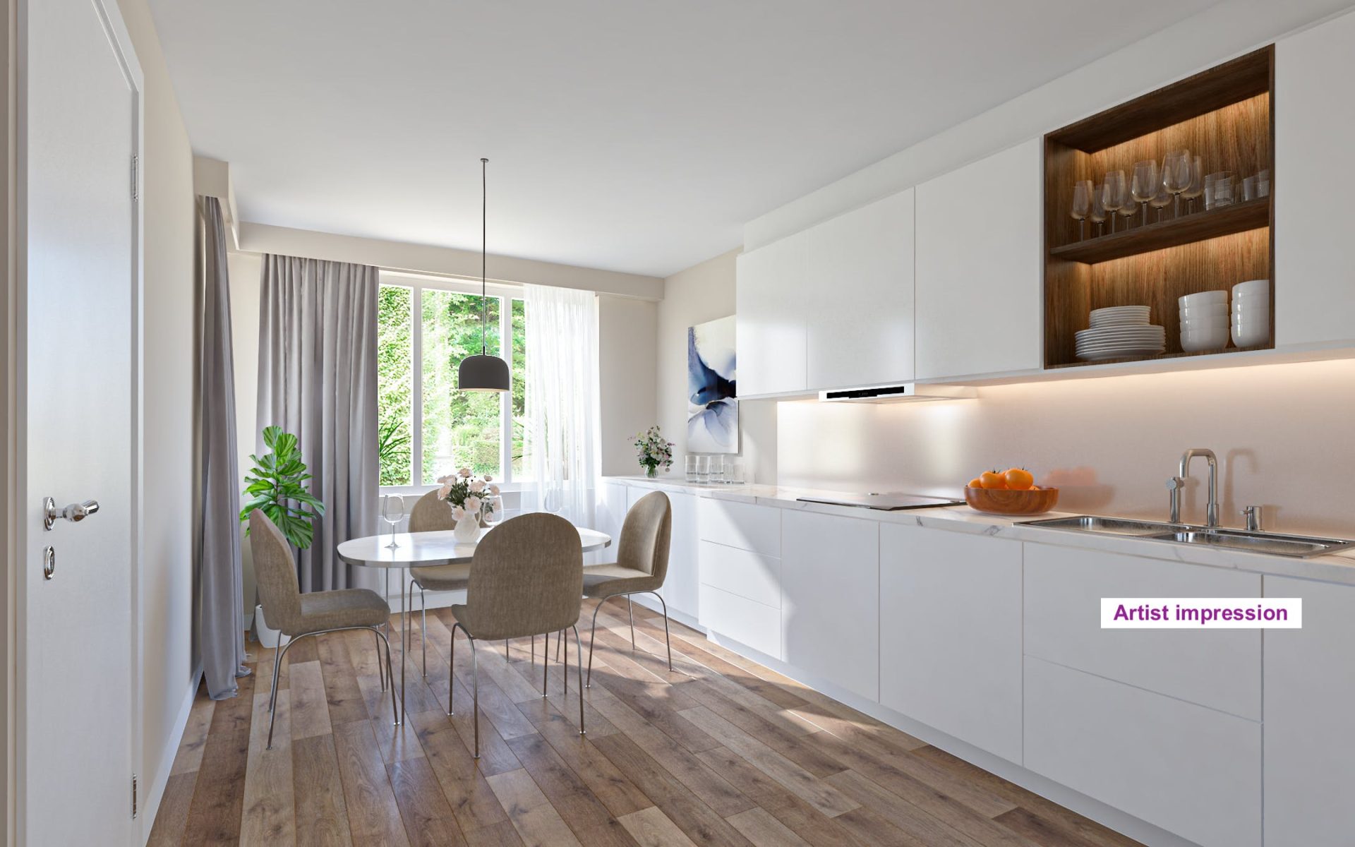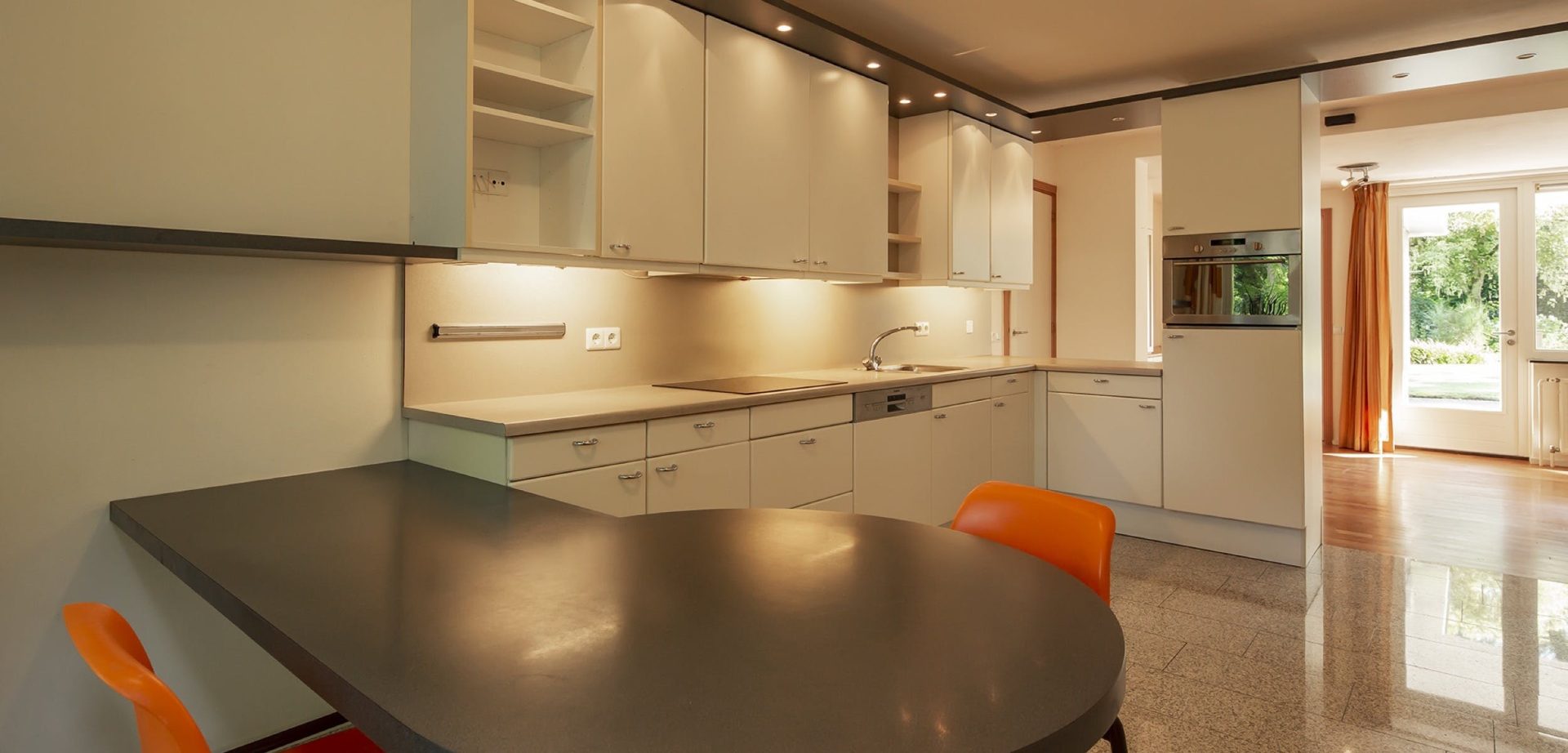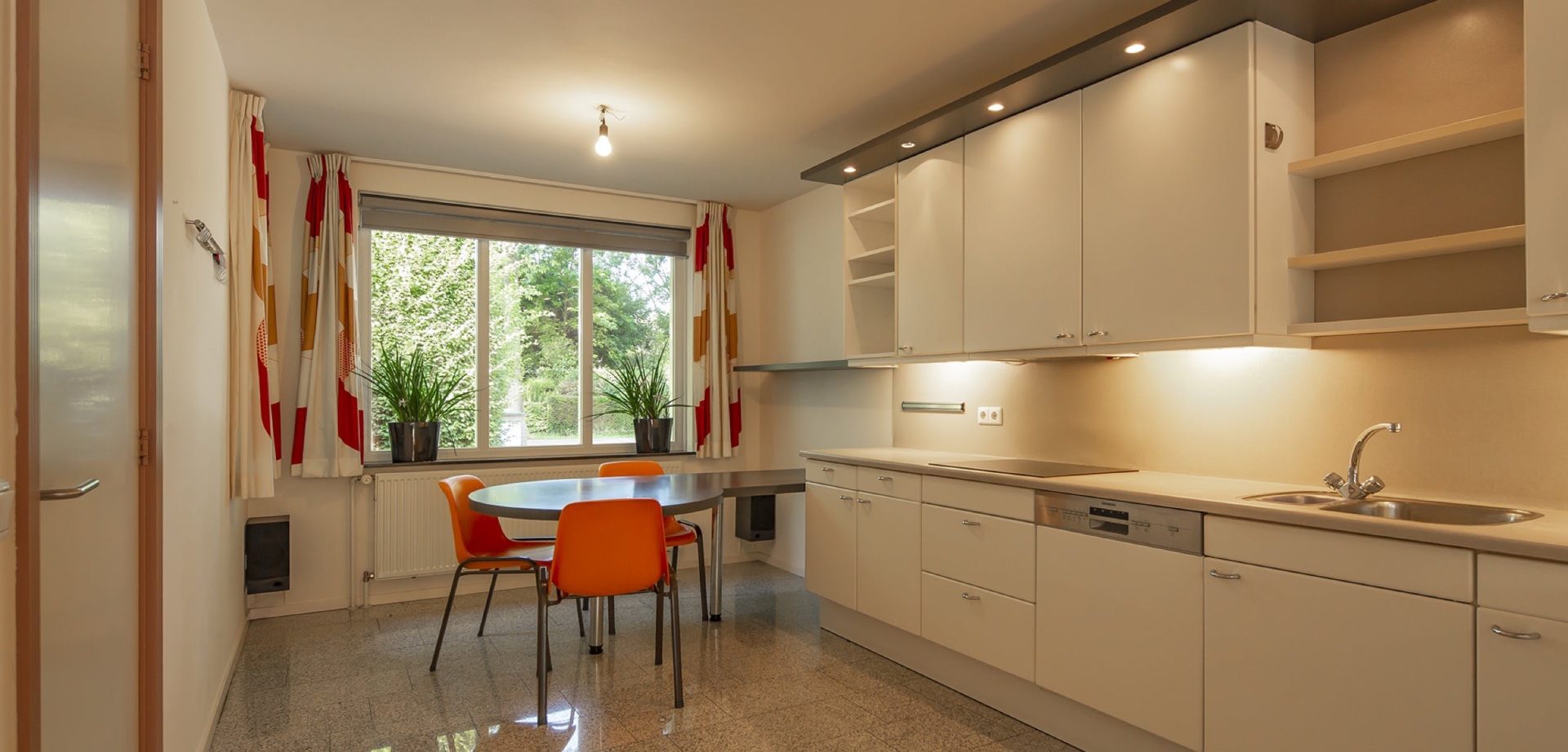 Aan de voorzijde ligt de keuken. Deze heeft een granieten vloer, een inrichting in hoekopstelling met veel bergruimte en een vaste ontbijttafel. Naast de keuken ligt de bijkeuken en een aangrenzende berging. In de bijkeuken zijn meerdere vaste kasten en de aansluitingen voor de wasapparatuur. Als je met de auto thuiskomt en je parkeert onder de carport dan kun je via de zijdeur van de bijkeuken de villa betreden.
