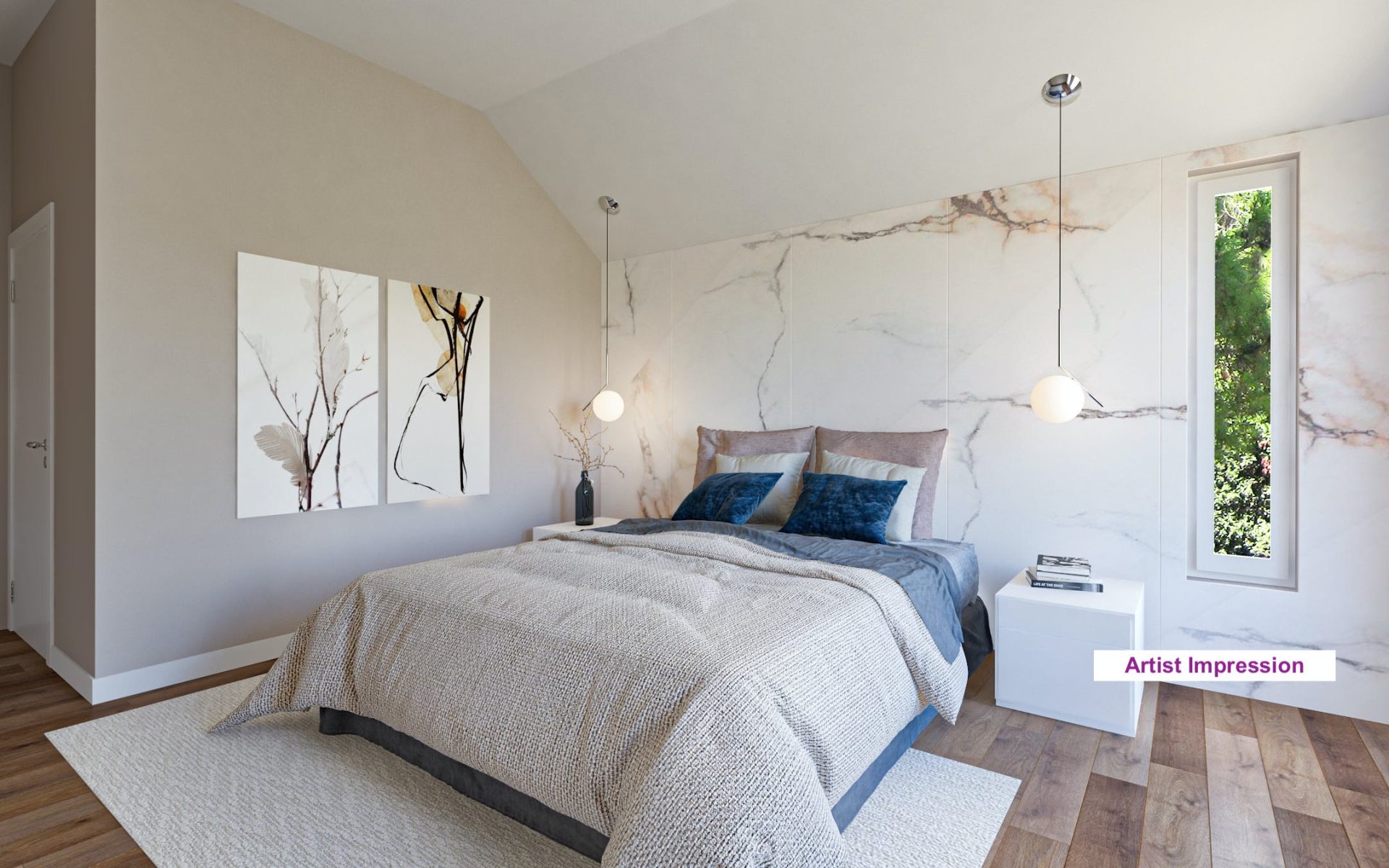 Op de eerste verdieping bevinden zich drie slaapkamers en de tweede badkamer. De slaapkamers aan de rechterzijde hebben een deur naar het halfronde balkon aan de zonzijde. De badkamer heeft een douche, toilet en een wastafel. Via een vlizotrap is een zolderberging in de nok van de villa benutbaar.