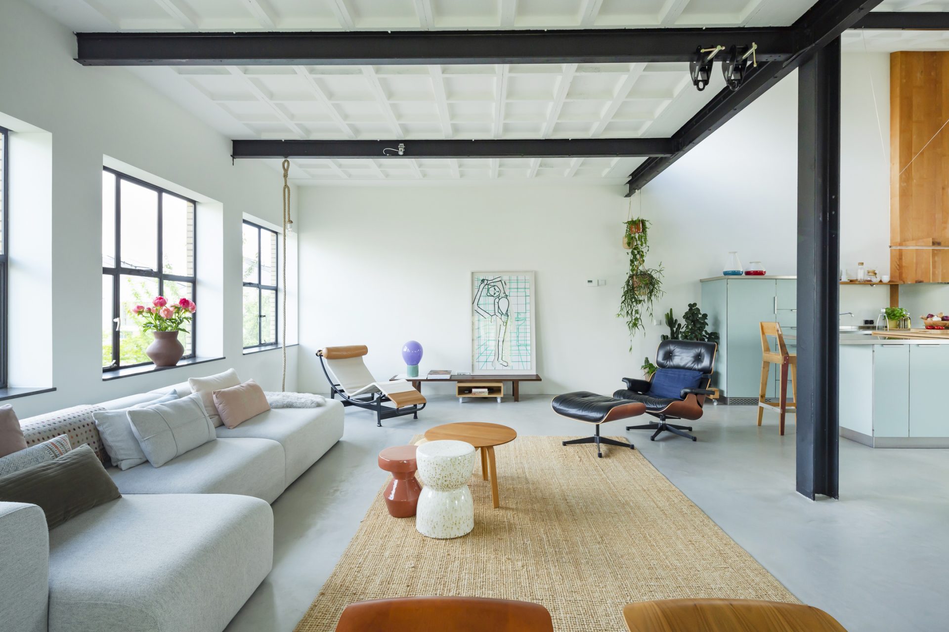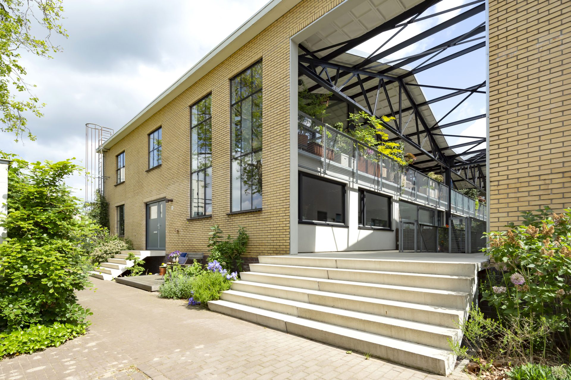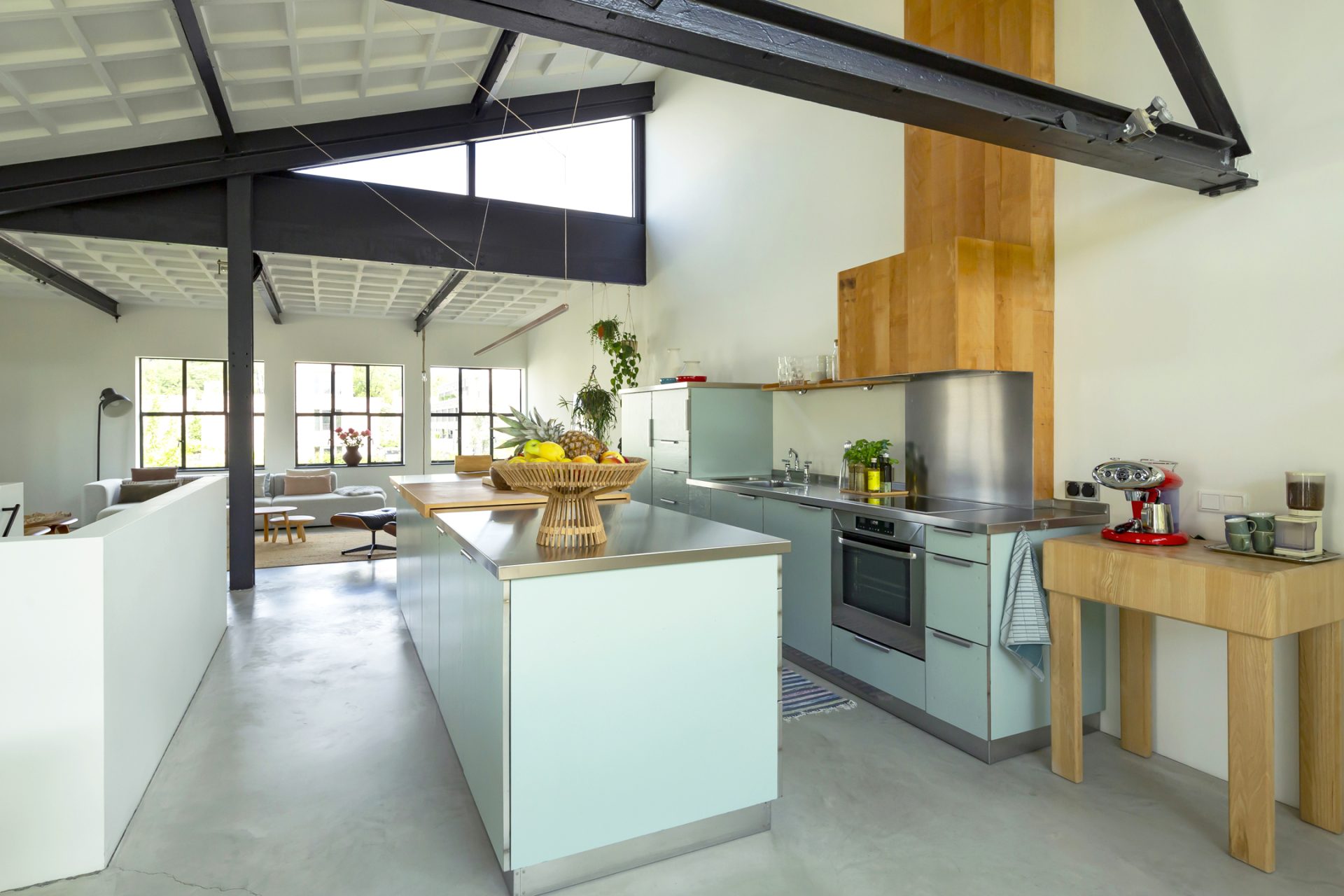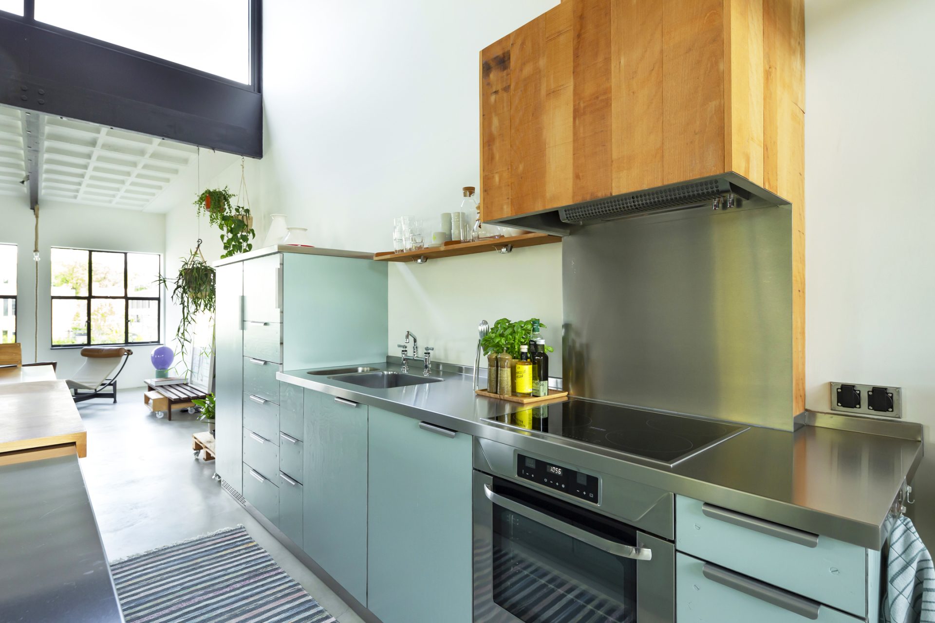 De loftwoning is verdeeld over drie verdiepingen; een souterrain, de slaapverdieping op de begane grond en de bovenverdieping is de spectaculaire woonetage.