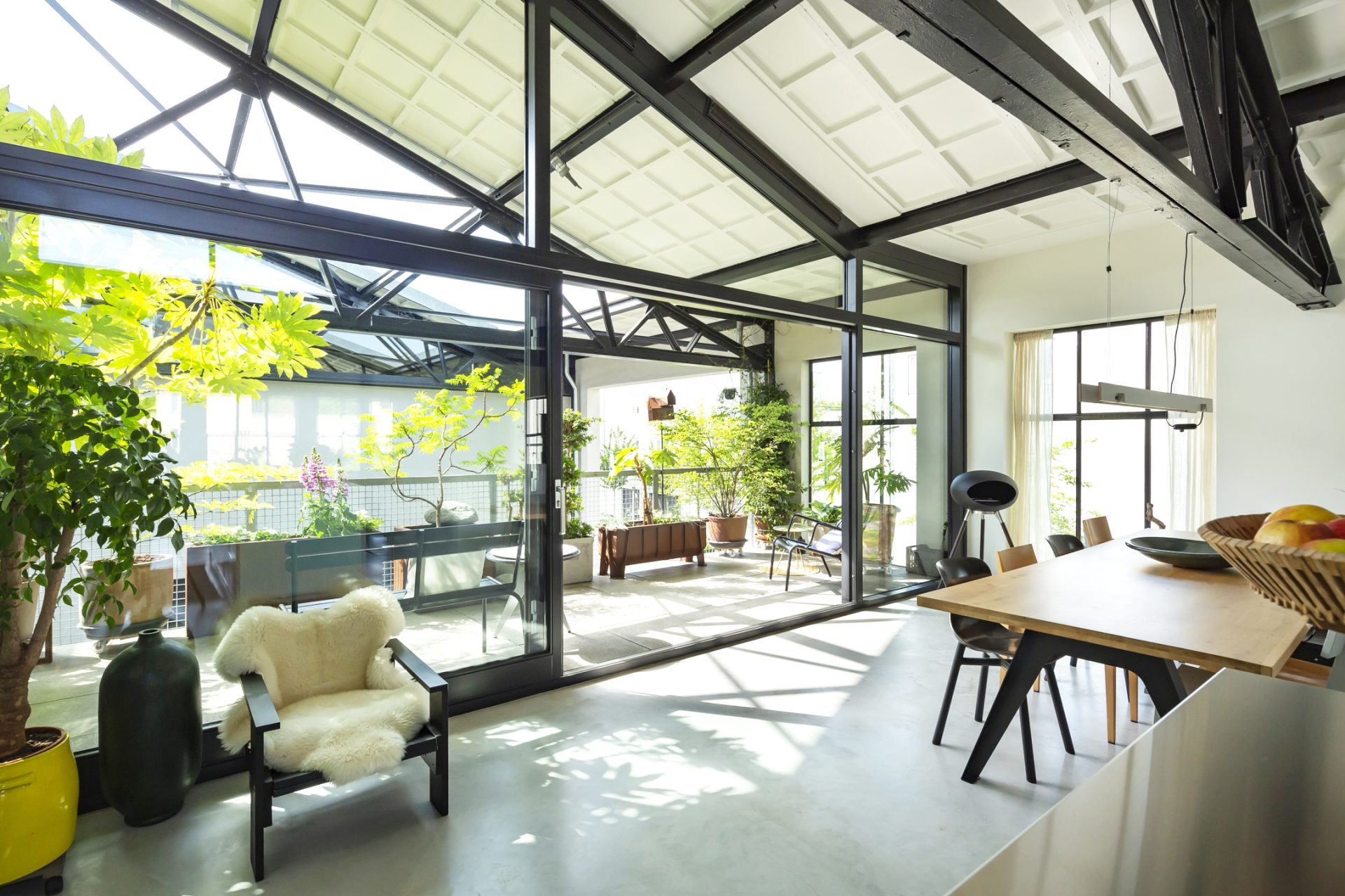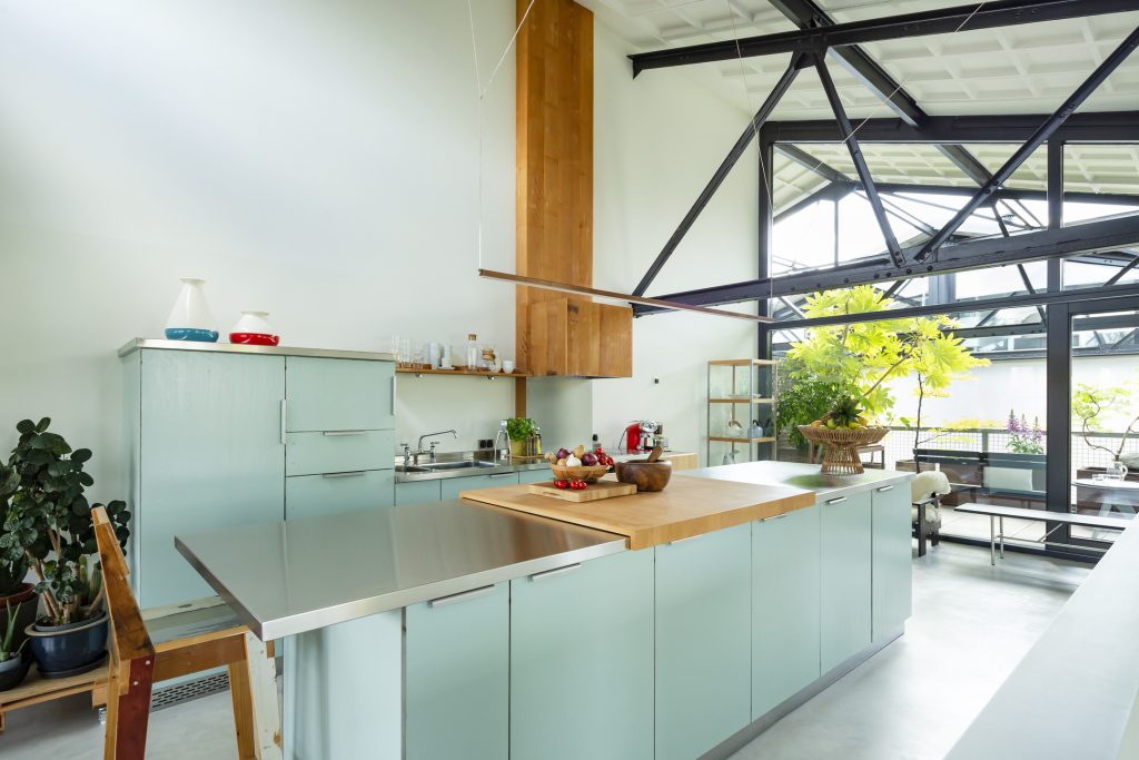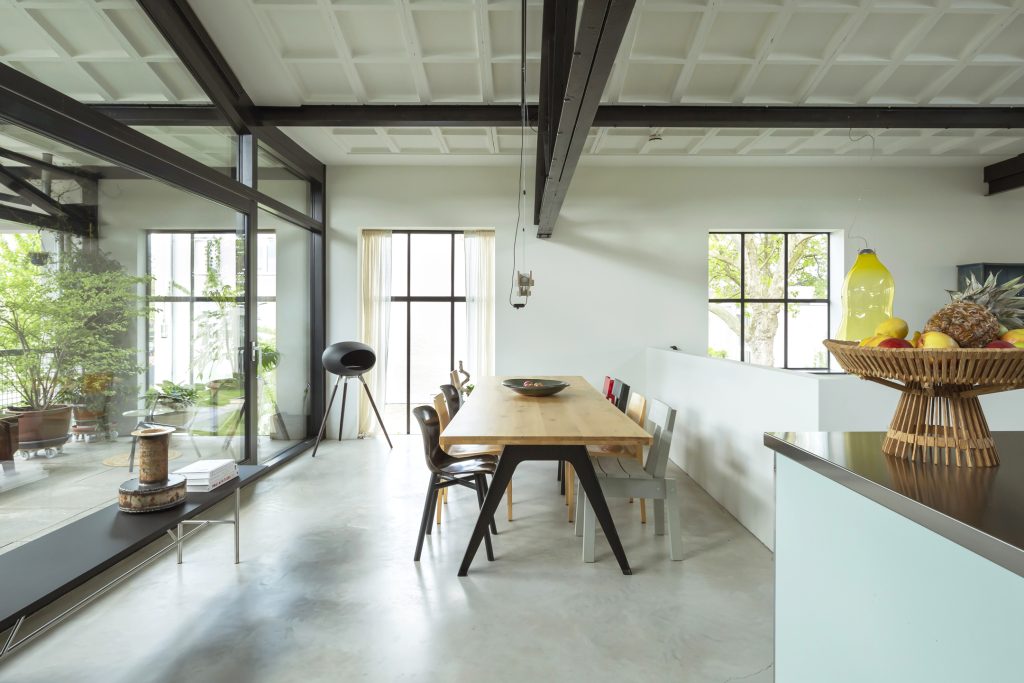 De dakconstructie met geklonken spanten en daarop de betoncassettes is van ongekende schoonheid. Op deze verdieping zijn de woonkamer en keuken gesitueerd. Hier is de sfeer van het industriële verleden nog altijd aanwezig, mede dankzij de stalen ramen met isolerende beglazing en de betonvloer met vloerverwarming. De totale oppervlakte, exclusief trap, is iets meer dan 78 m². Een grote pui met schuifpui verbindt de woonkeuken met het sfeervolle dakterras. Uw oog valt op de mooie keukenopstelling in Piet Hein Eek design met een groot eiland, rvs-blad en alle benodigde inbouwapparatuur.