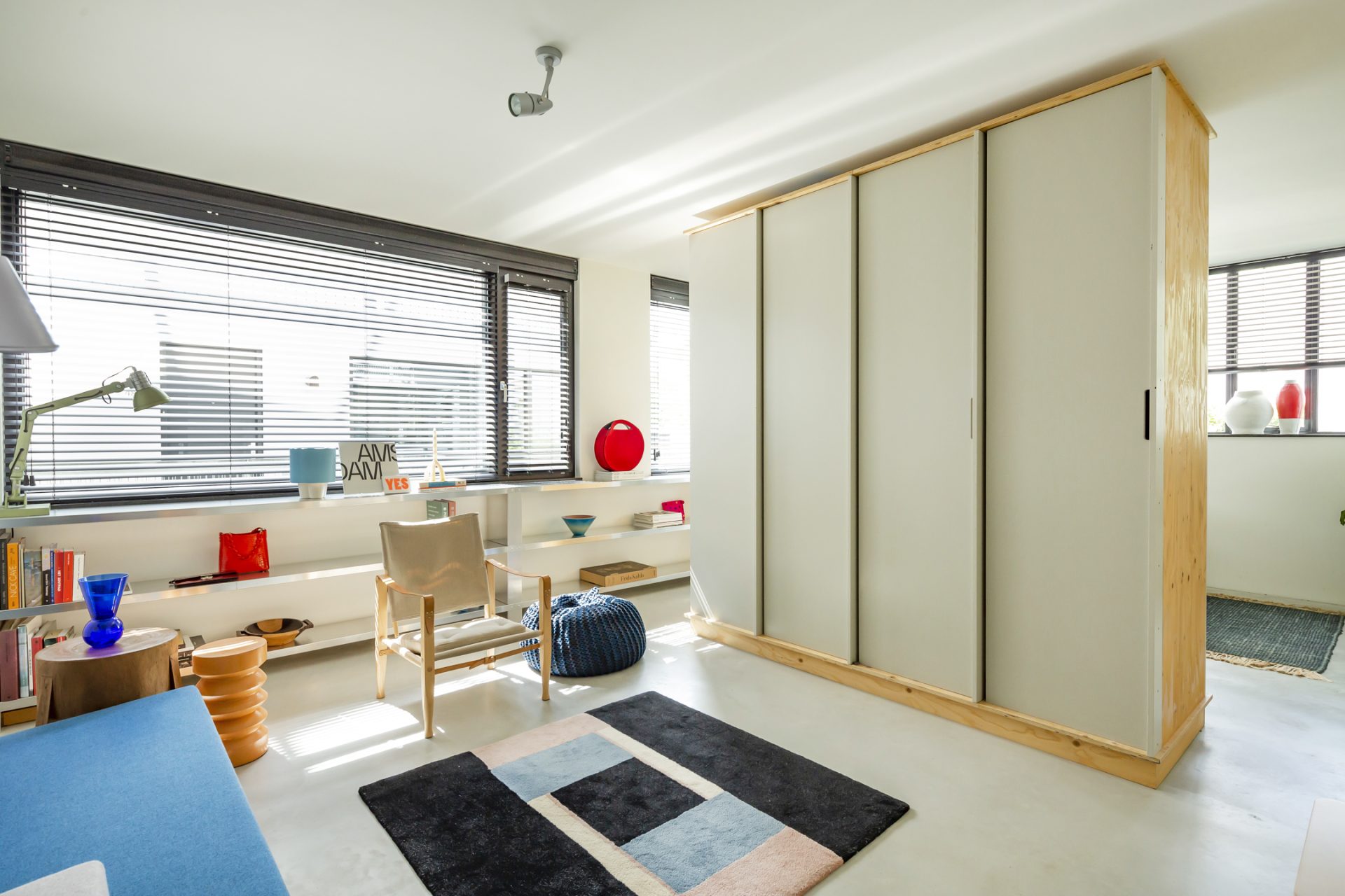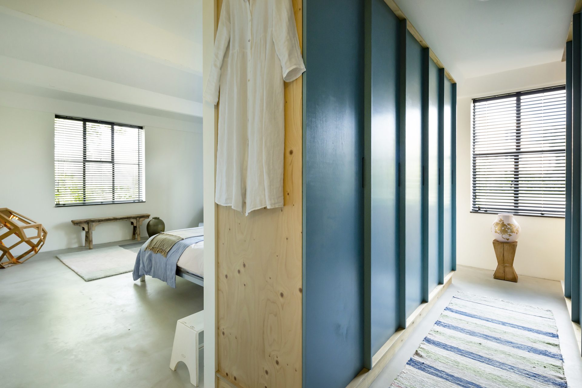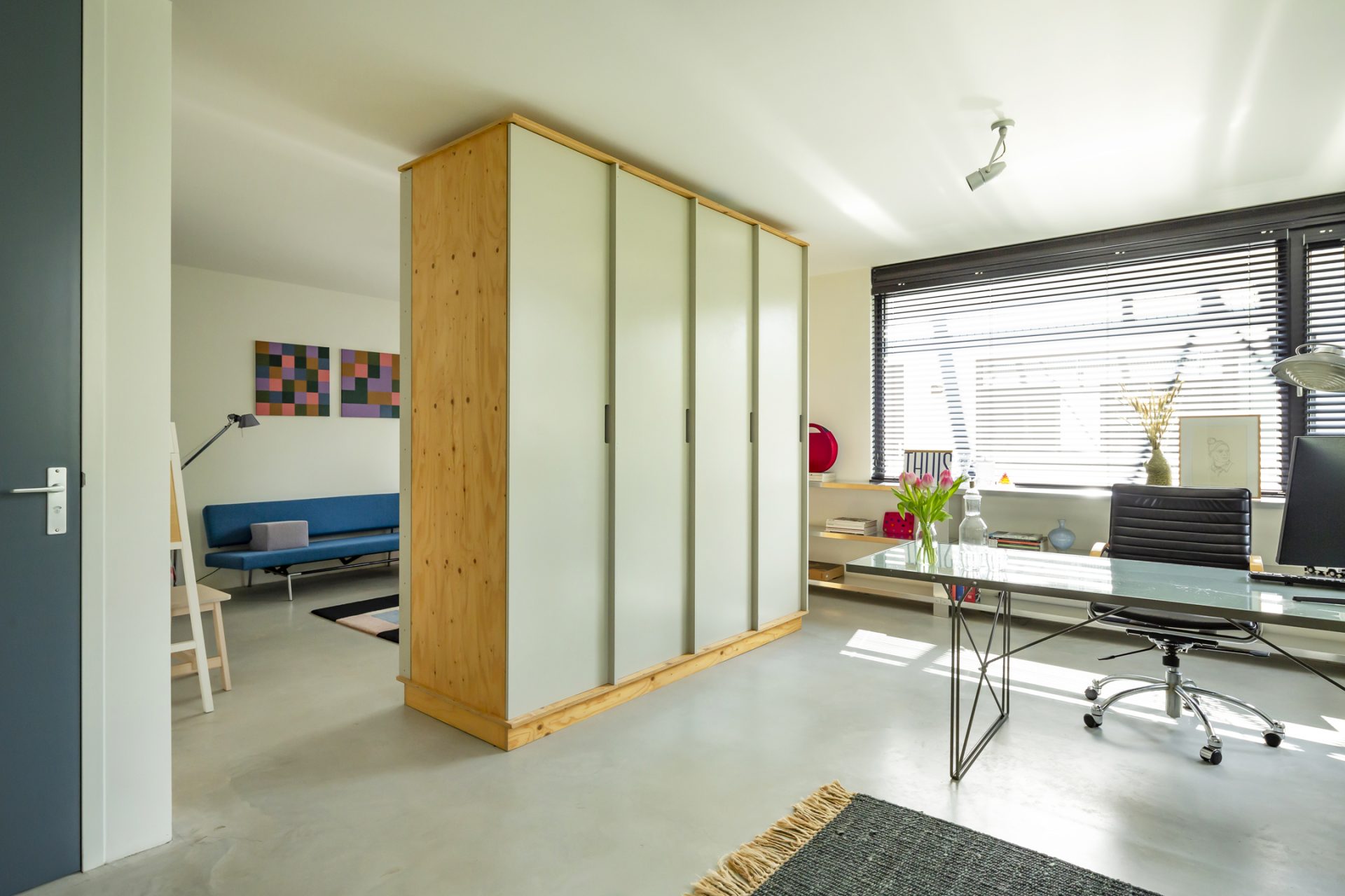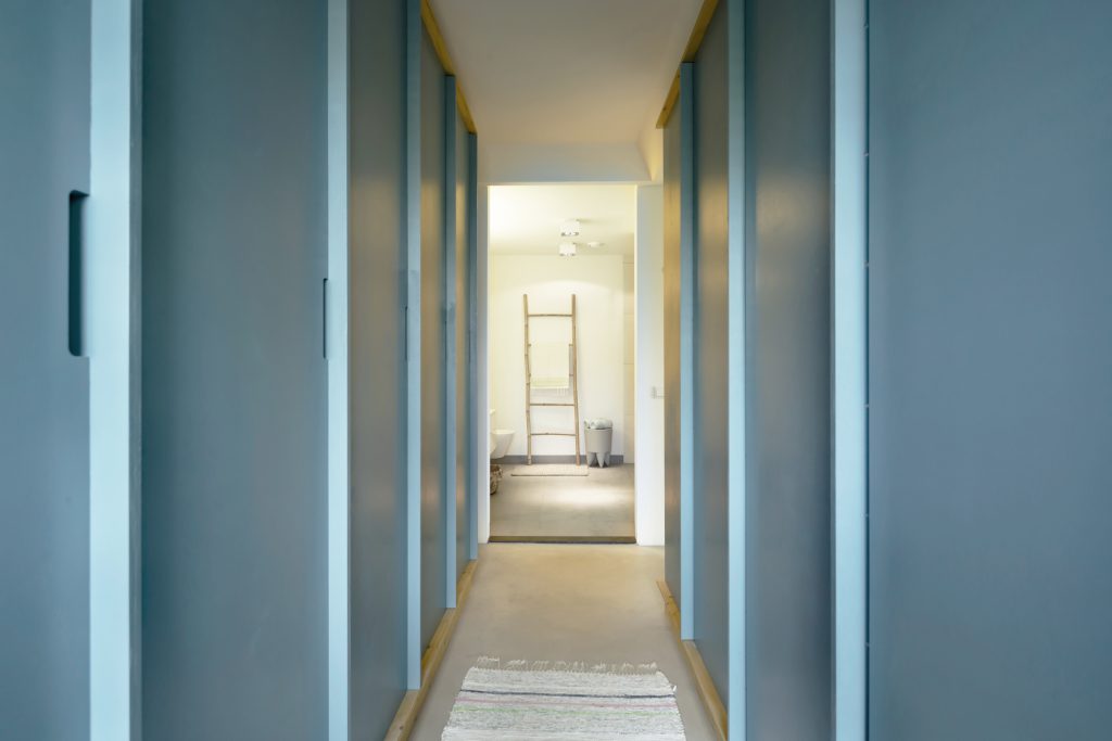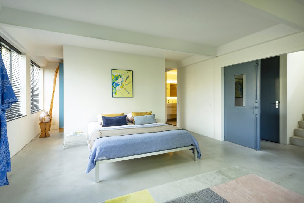 Open de dubbele, blauwe deuren naar de hal. De stoere vloer, het gladde stucwerk, oude industriële deuren en de bordestrap met vide trekken direct uw aandacht. Aan de rechterzijde is een ruime slaapkamer (ca. 35 m²), in gebruik als zit- en werkkamer. Dit is een inspirerende, rustige ruimte met grote ramen aan twee zijden en een op maat gemaakte kastenwand. Bij het zitgedeelte is een deur die toegang geeft tot de wasruimte/berging. De aansluitende badkamer is ingedeeld met een inloopdouche, toilet en een wastafel.