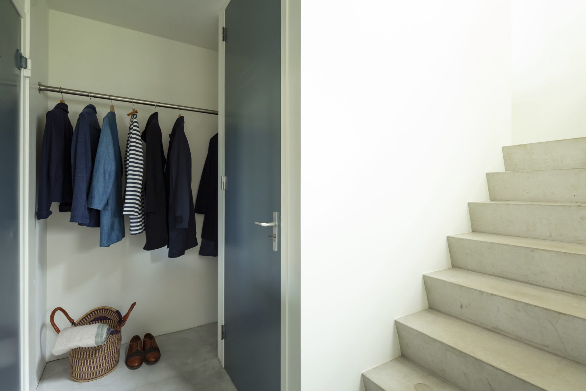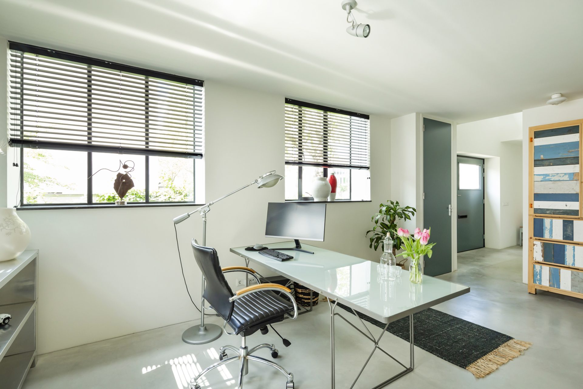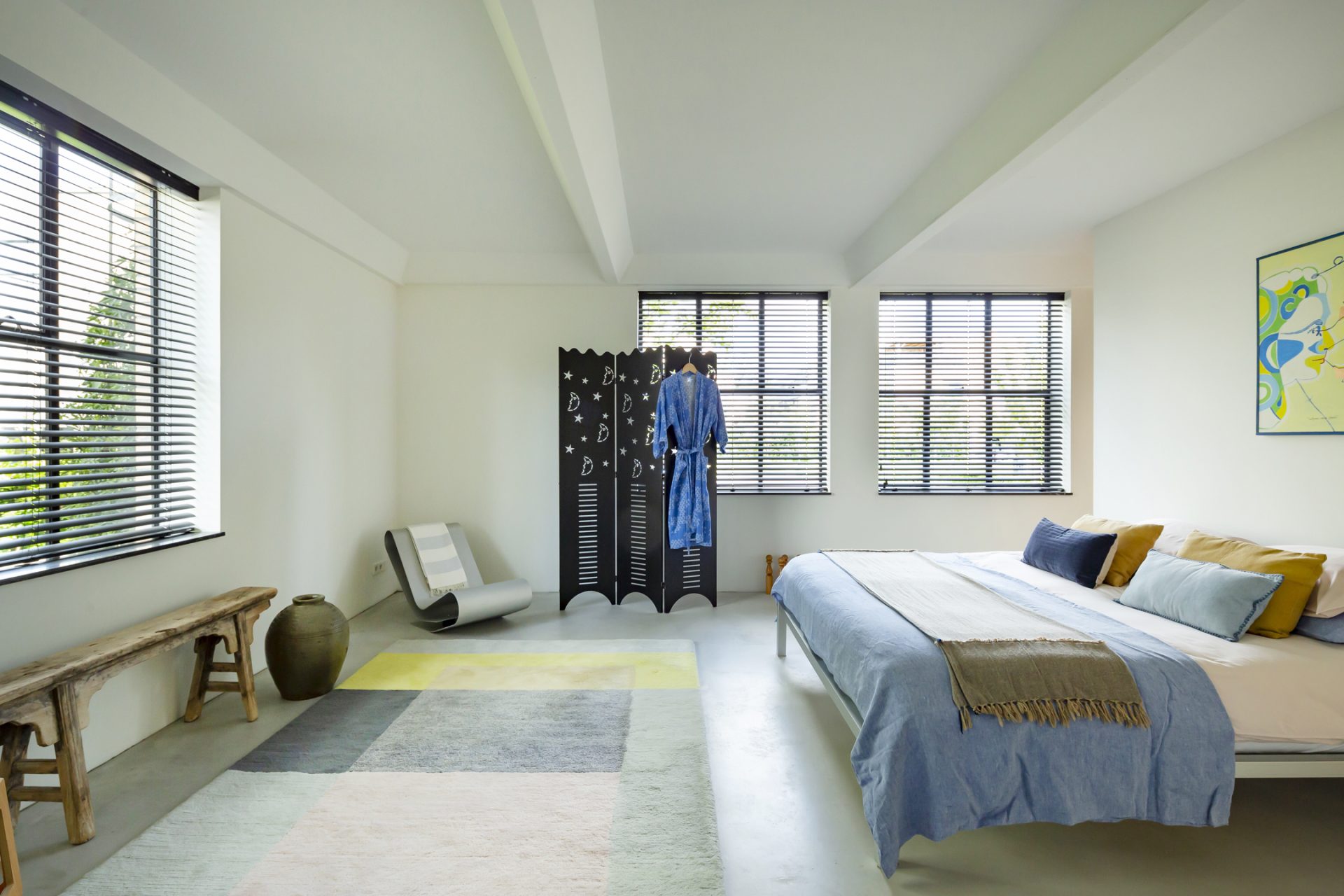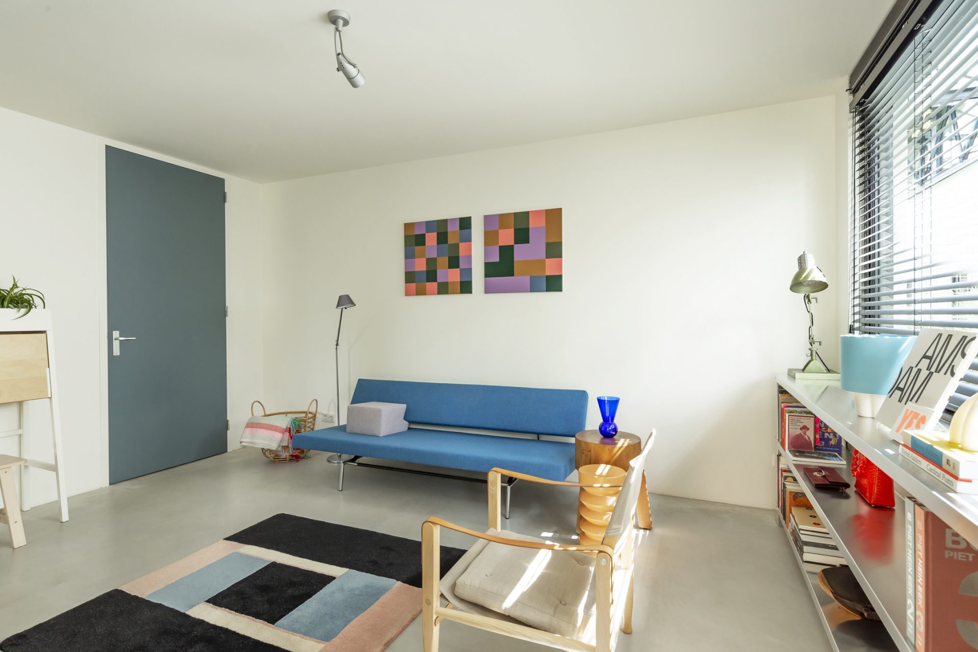Open de dubbele, blauwe deuren naar de hal. De stoere vloer, het gladde stucwerk, oude industriële deuren en de bordestrap met vide trekken direct uw aandacht. Aan de rechterzijde is een ruime slaapkamer (ca. 35 m²), in gebruik als zit- en werkkamer. Dit is een inspirerende, rustige ruimte met grote ramen aan twee zijden en een op maat gemaakte kastenwand. Bij het zitgedeelte is een deur die toegang geeft tot de wasruimte/berging. De aansluitende badkamer is ingedeeld met een inloopdouche, toilet en een wastafel.