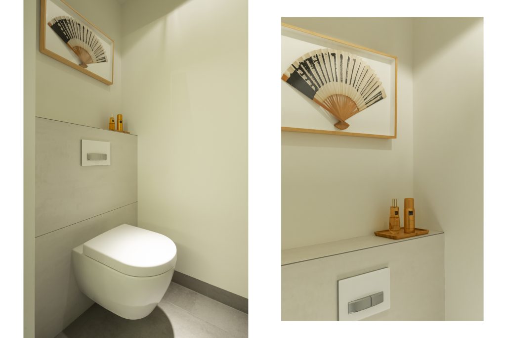 Aan de andere zijde, bij de garderobe, is de master bedroom (ca. 34 m²) met eigen badkamer gesitueerd. De en-suite kleedruimte met op maat gemaakte kastenwand zorgt ervoor dat het slaapgedeelte een aangename rust uitstraalt. De badkamer is heel ruimtelijk ingedeeld met een grote inloopdouche, wastafelmeubel, bidet en een aparte toiletruimte.