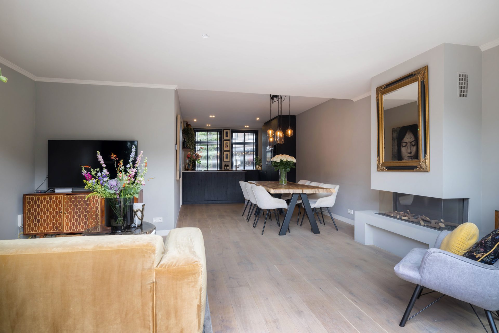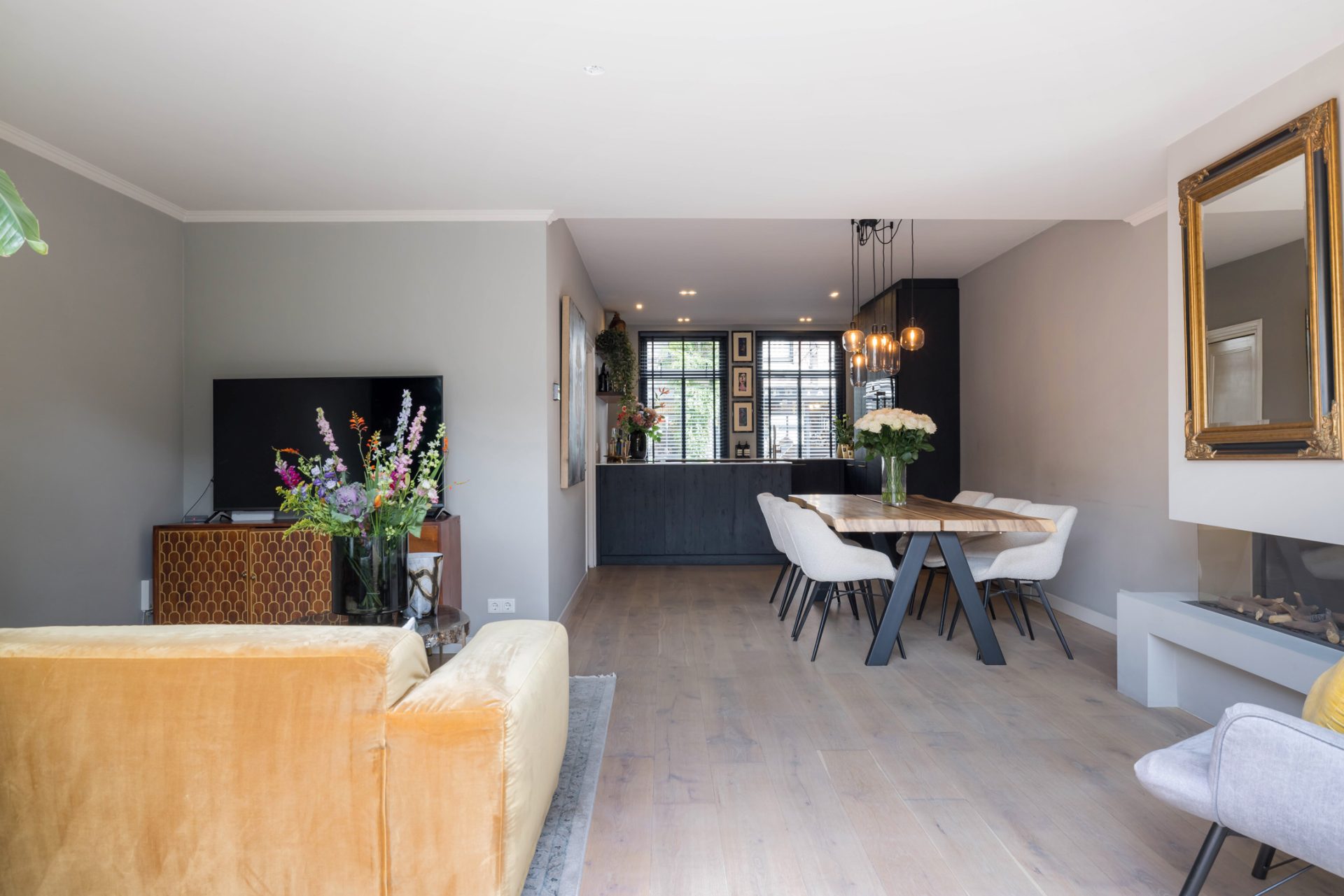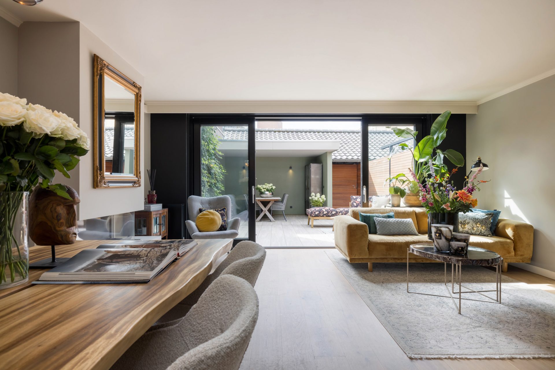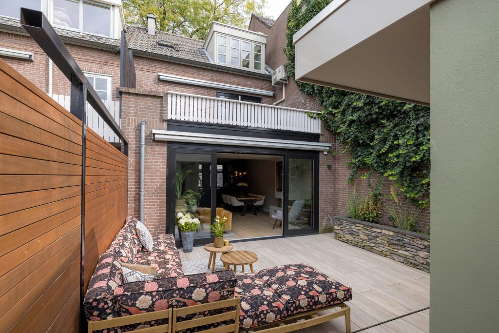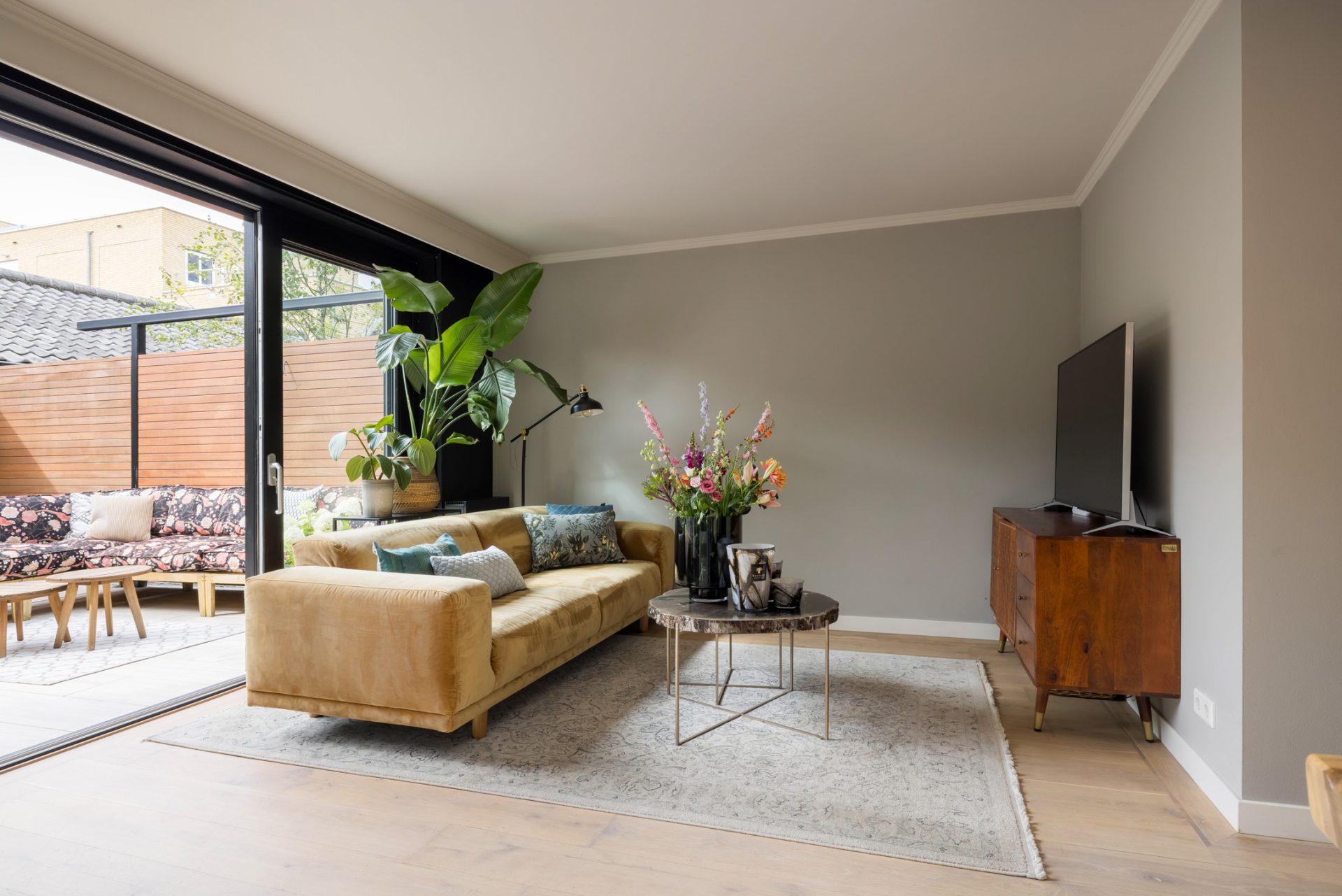 In de L-vormige woonkamer merk je niet dat je midden in het stadscentrum woont. Een grote pui met schuifdeuren verbindt de woonkamer met de loungetuin en bij het zitgedeelte trekt de gashaard direct de aandacht.