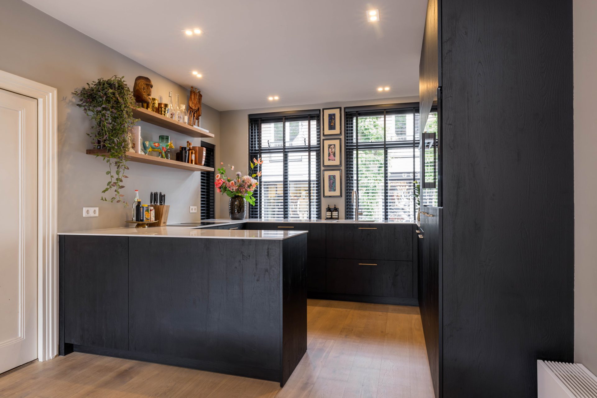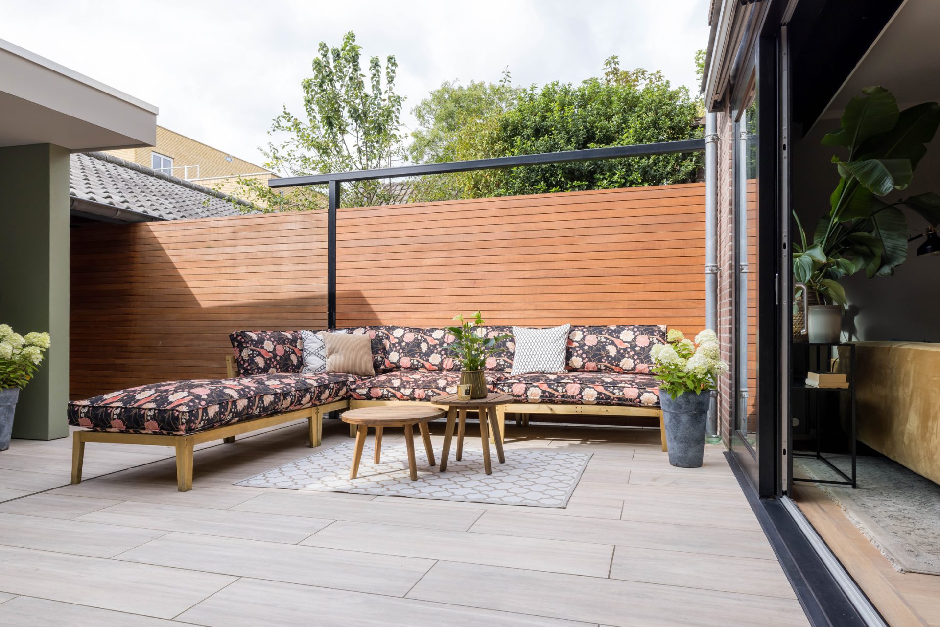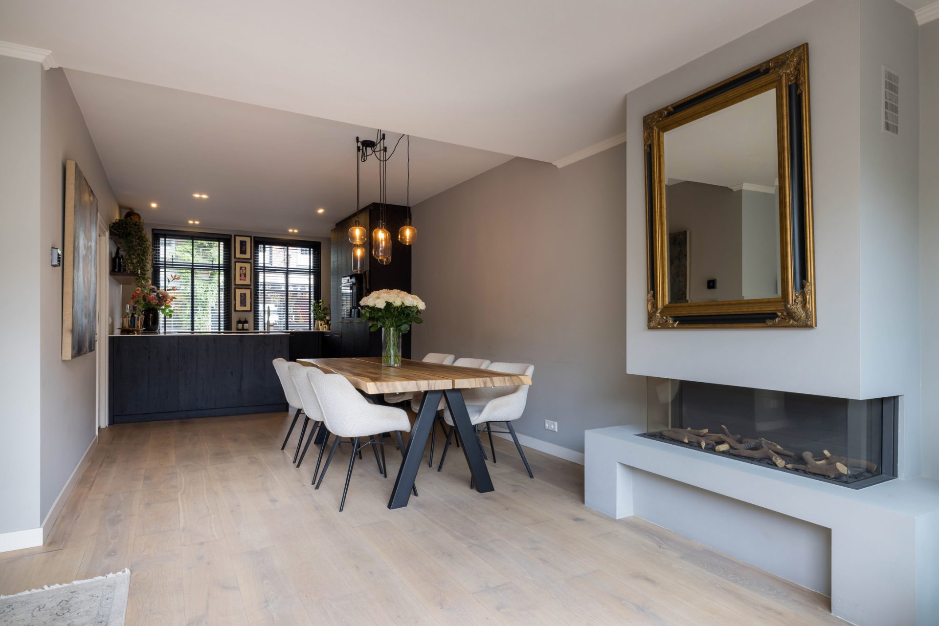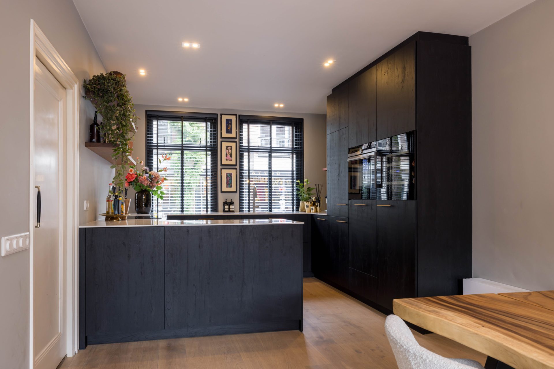In de L-vormige woonkamer merk je niet dat je midden in het stadscentrum woont. Een grote pui met schuifdeuren verbindt de woonkamer met de loungetuin en bij het zitgedeelte trekt de gashaard direct de aandacht.