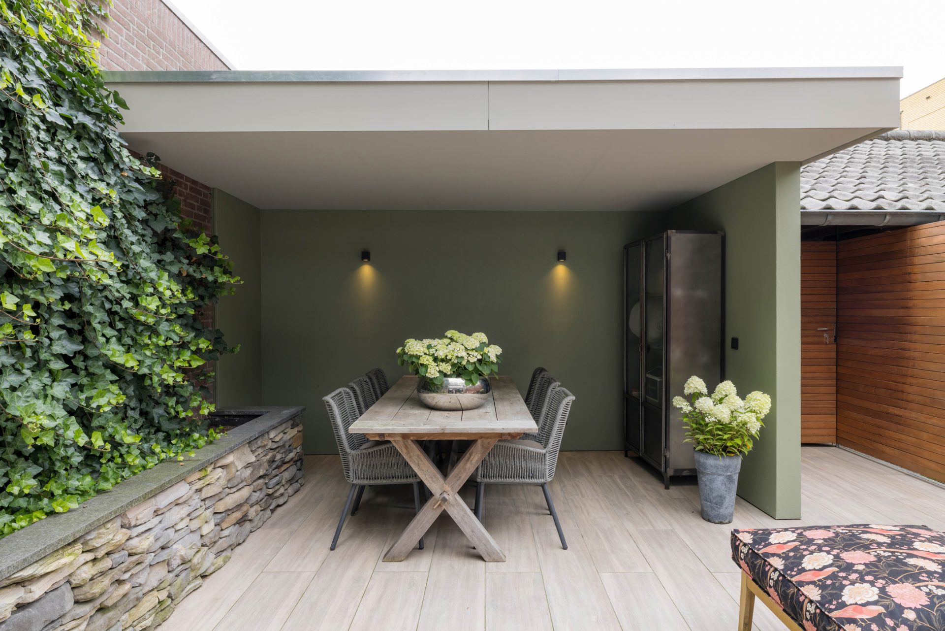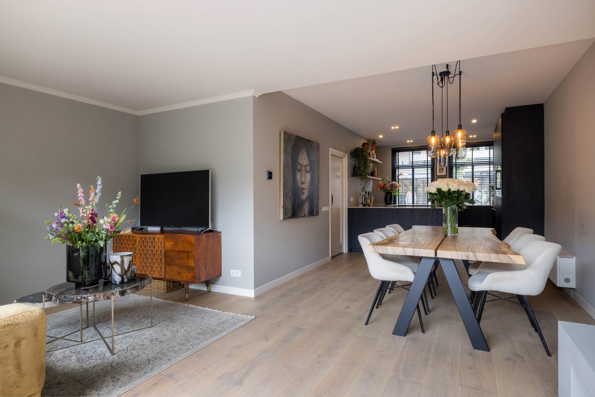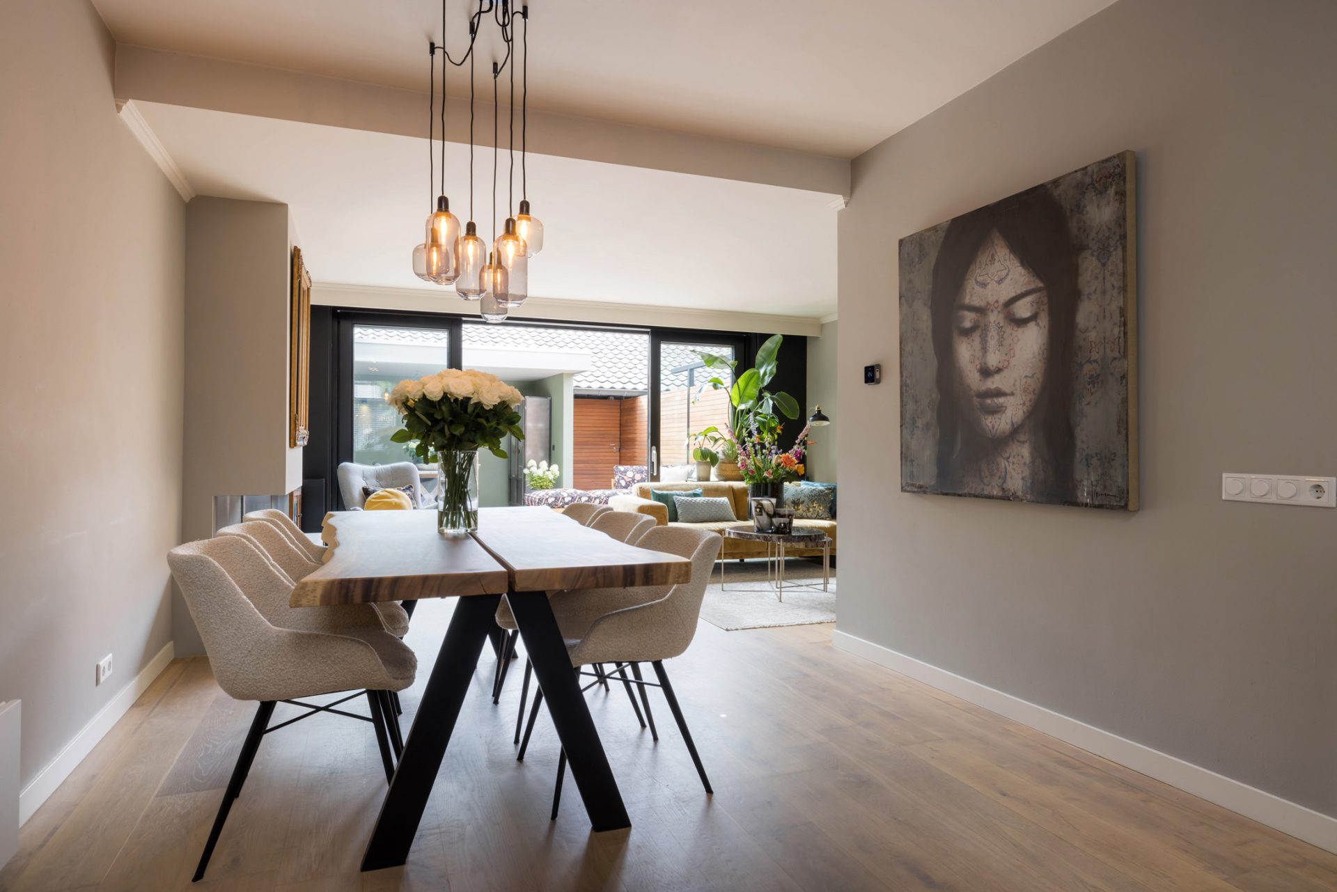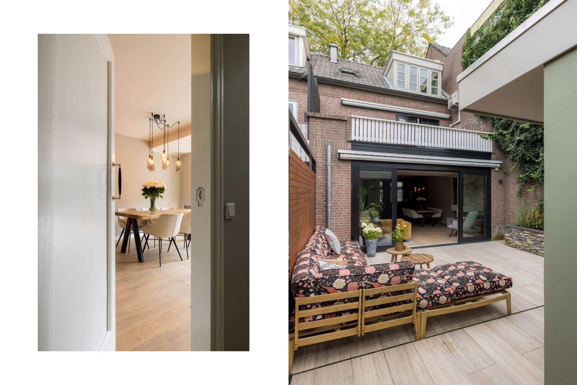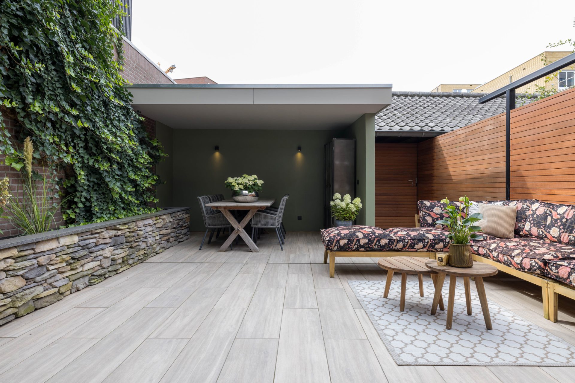 In de L-vormige woonkamer merk je niet dat je midden in het stadscentrum woont. Een grote pui met schuifdeuren verbindt de woonkamer met de loungetuin en bij het zitgedeelte trekt de gashaard direct de aandacht.