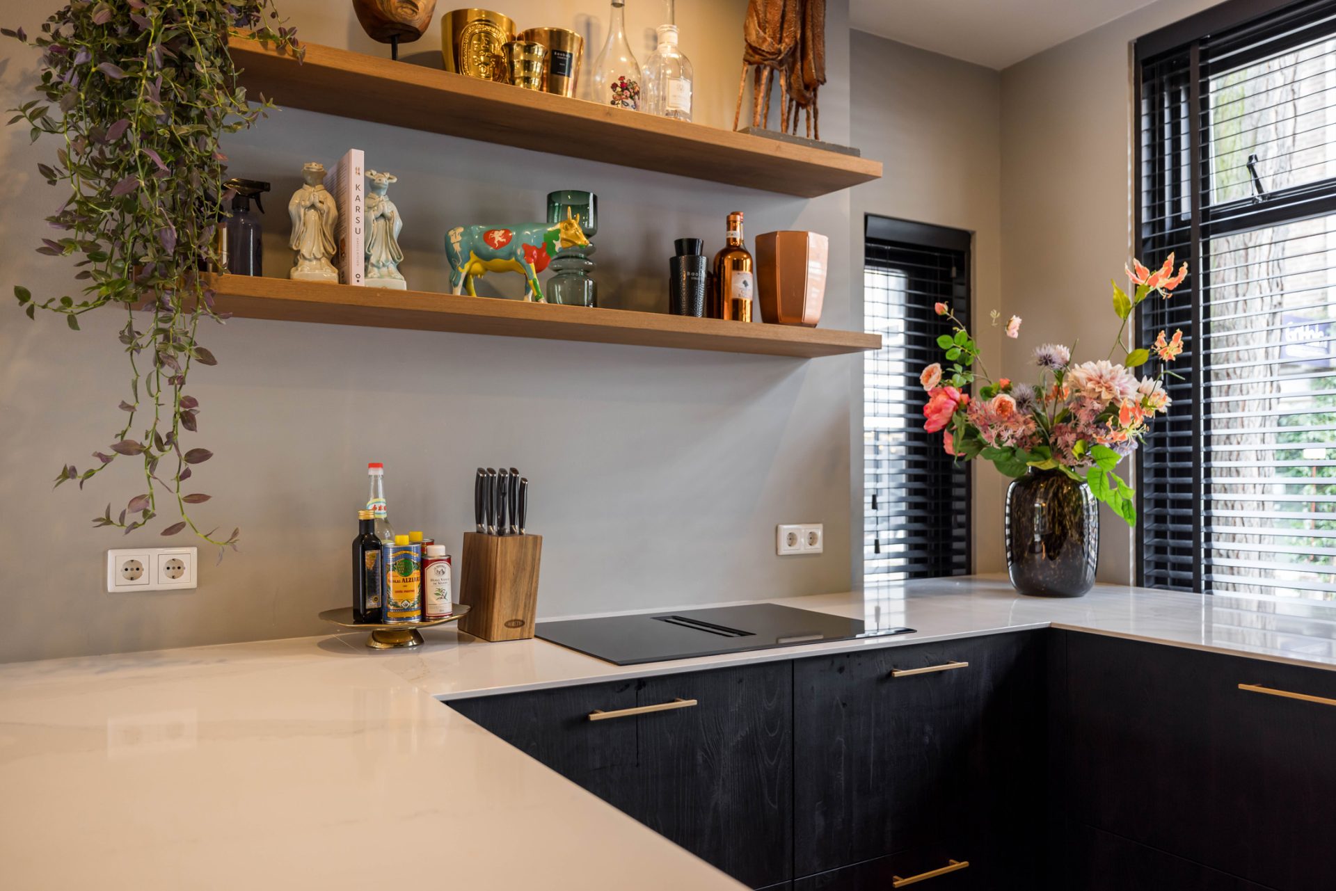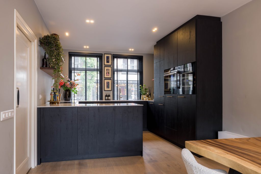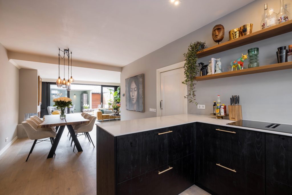 Via het eetgedeelte is de keuken te bereiken, die eind 2021 is geplaatst. De beschikbare ruimte is optimaal benut met een grote U-opstelling en een aansluitende hoge kastenwand. Het witte keramische blad, de goudkleurige kraan en bijpassende grepen geven de keuken een trendy uitstraling. Alle benodigde apparatuur van topkwaliteit is ingebouwd, waaronder een inductie kookplaat met ingebouwde afzuiging.